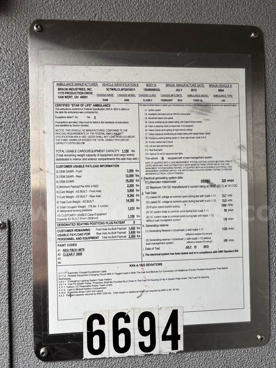 2015 RAM 4500 CHASSIS AND CAB, 6.7L L6 OHV 24V TURBO DIESEL. 2015 Braun Chief XL ambulance. Ambulance is in good condition and was still utilized as a spare until this listing was posted.