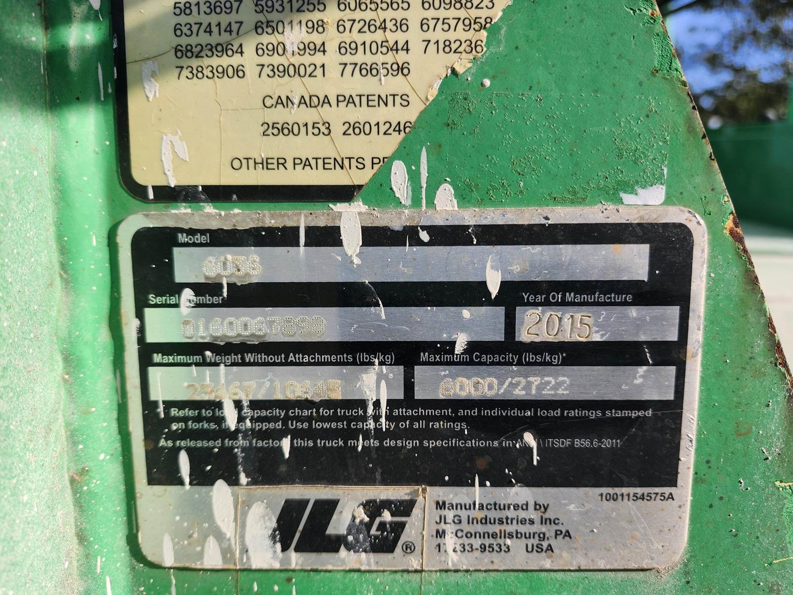 The JLG/Sky Trak 6036 telehandler has a maximum lift capacity of 6,000 lbs, a maximum lift height of 36 ft 1 in, and a maximum forward reach of 22 ft 4 in. It features frame leveling, a top travel speed of 19 mph, and an operating weight of 21,300 lbs. Open Operator Station 2014 US EPA Label, 60 in Forks, Manual Coupler, Frame Leveling, Auxiliary Hydraulic Plumbing.