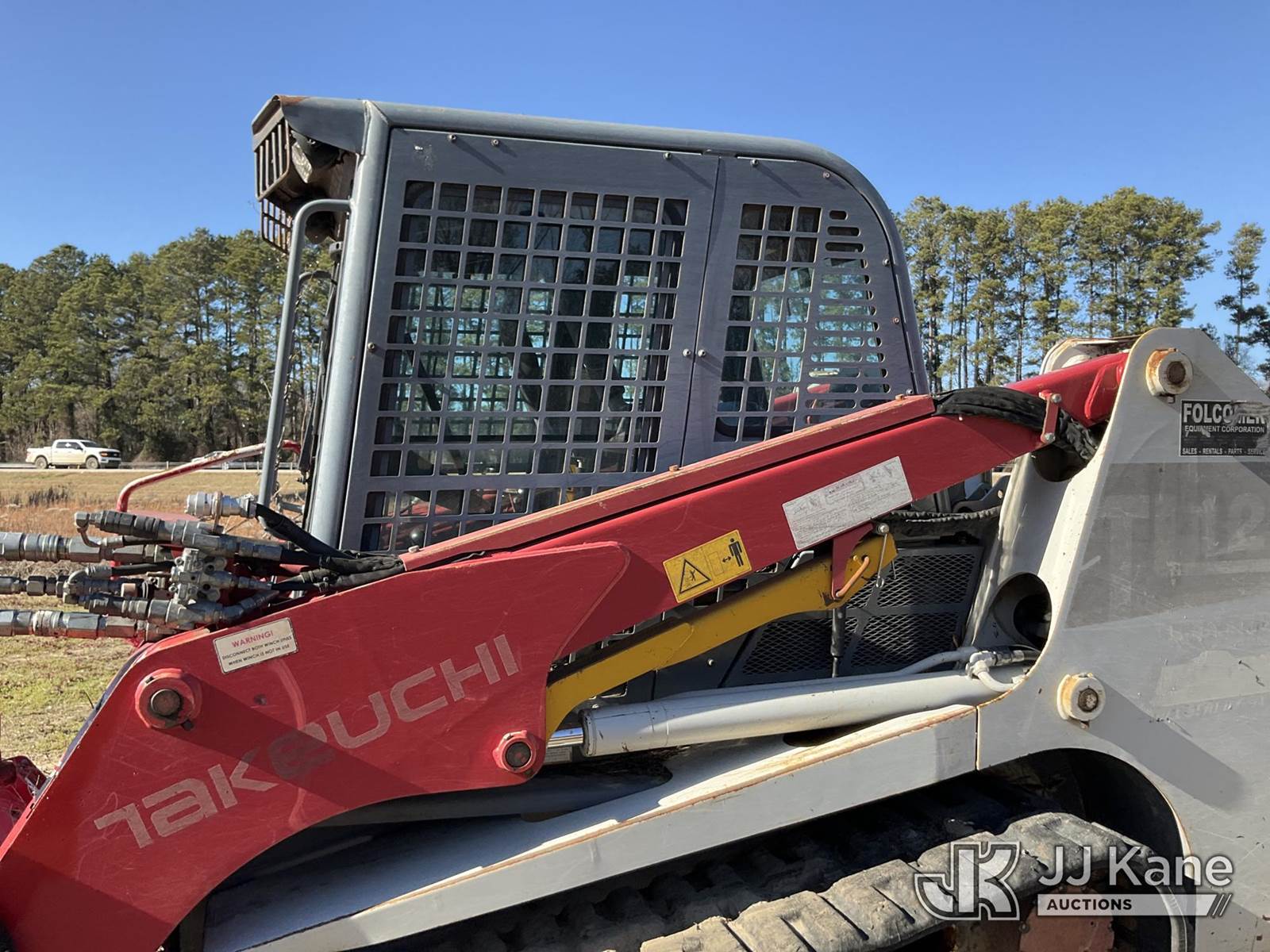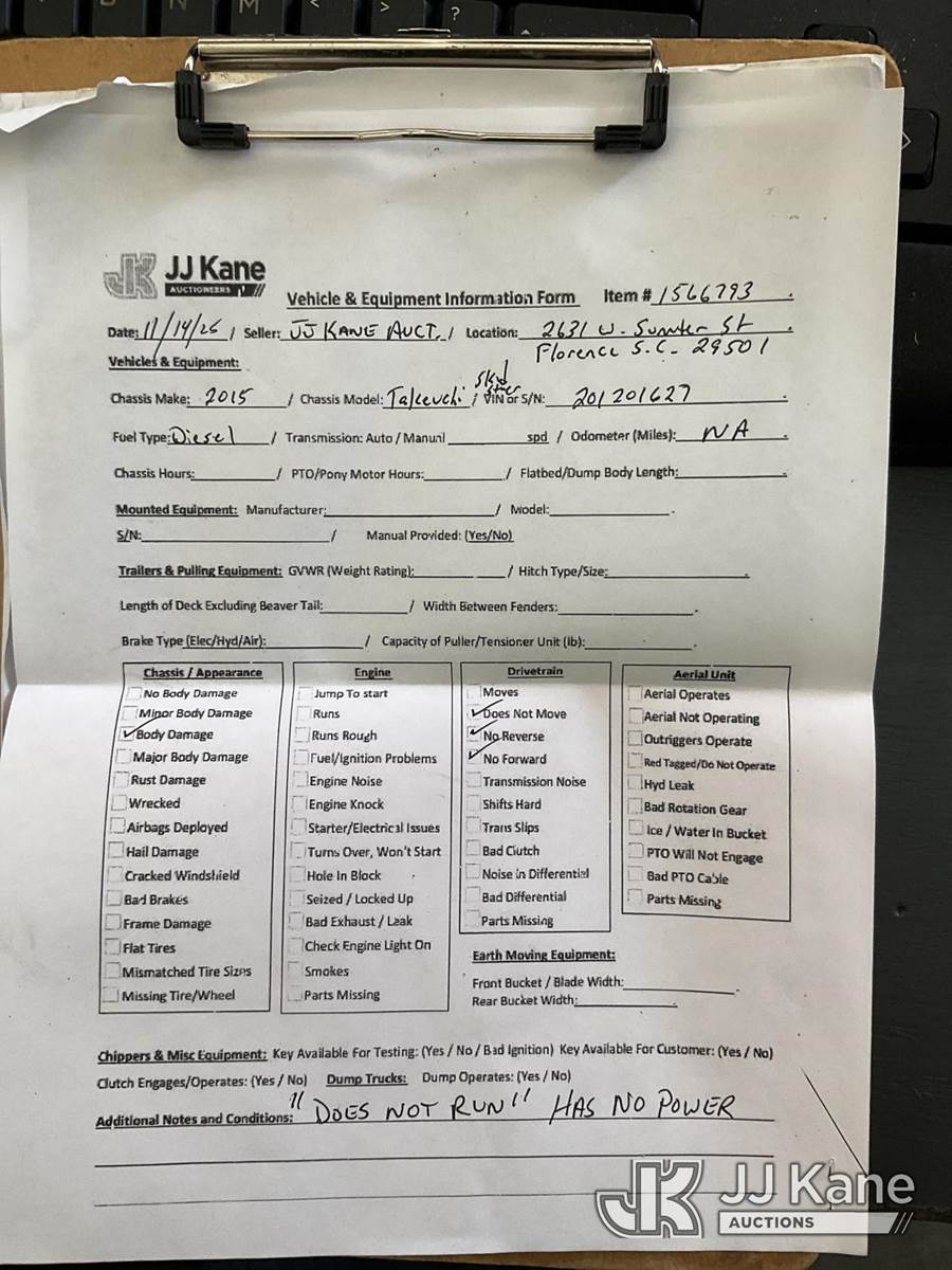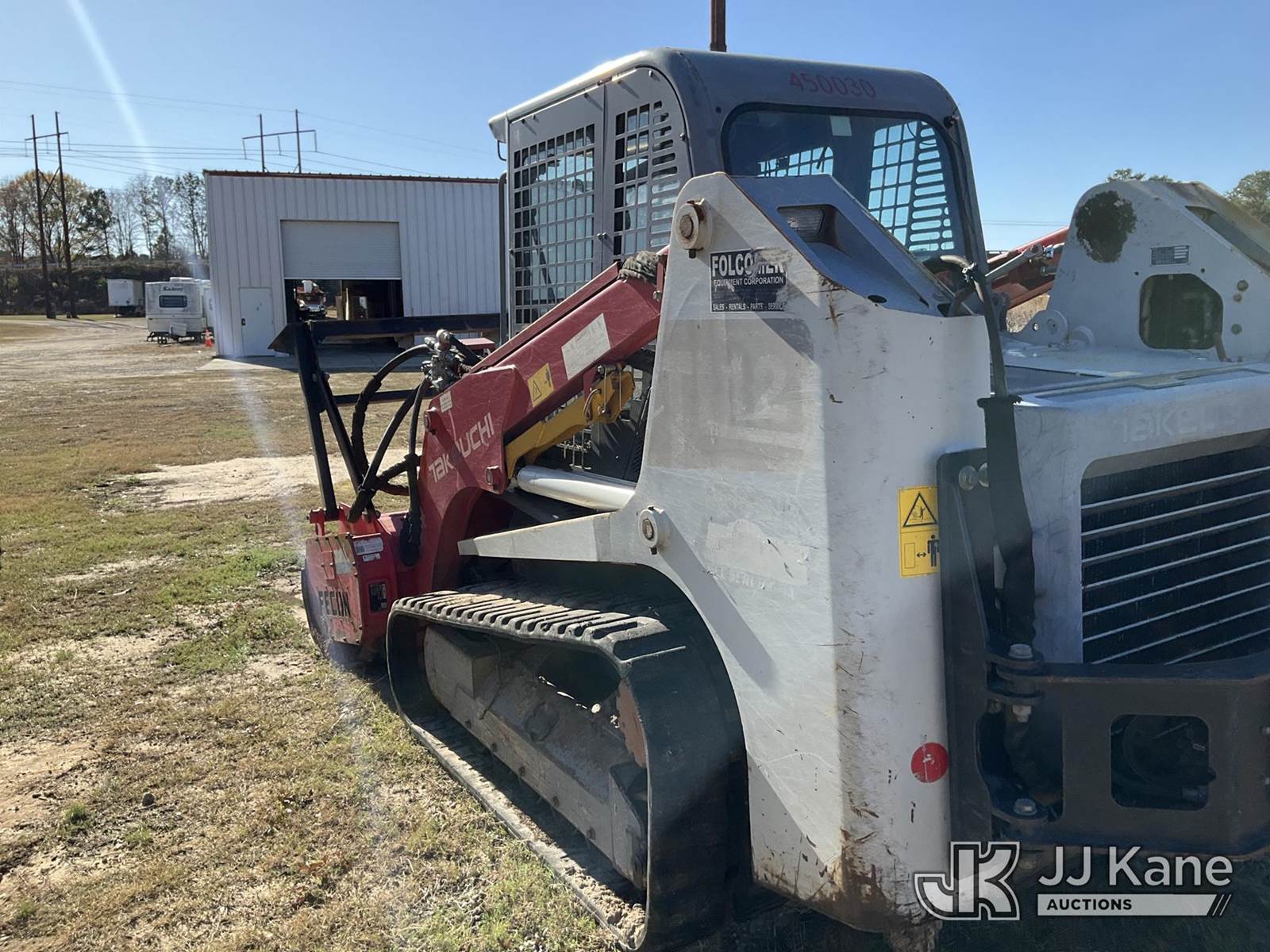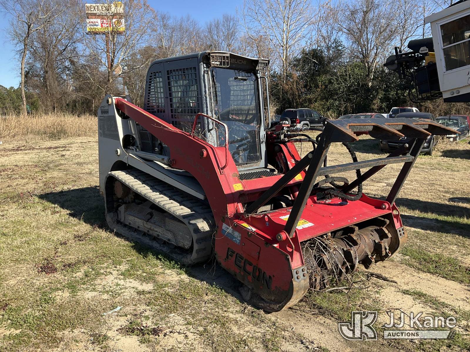 2015 Takeuchi TL12 Tracked Skid Steer Loader, s/n 201201627, Hydrostatic, diesel, with Fecon mulching head attachment, aux hydraulics, rear winch, rubber tracks, EROPS, (Not Running, Condition Unknown, No Power, Body Damage) NOTE: This unit is being sold AS IS/WHERE IS via Timed Auction and is located in Florence, SC. Inspection & preview days for this unit are by appointment only; please contact us at contact@jjkane.com or 84-Go-JJKane for more details. (Buyer is responsible for removal. Assistance by consignor or JJ Kane Auctions is not assured.)