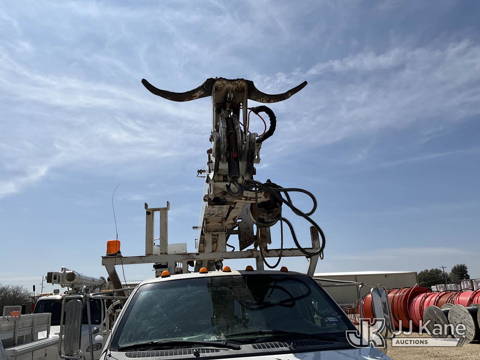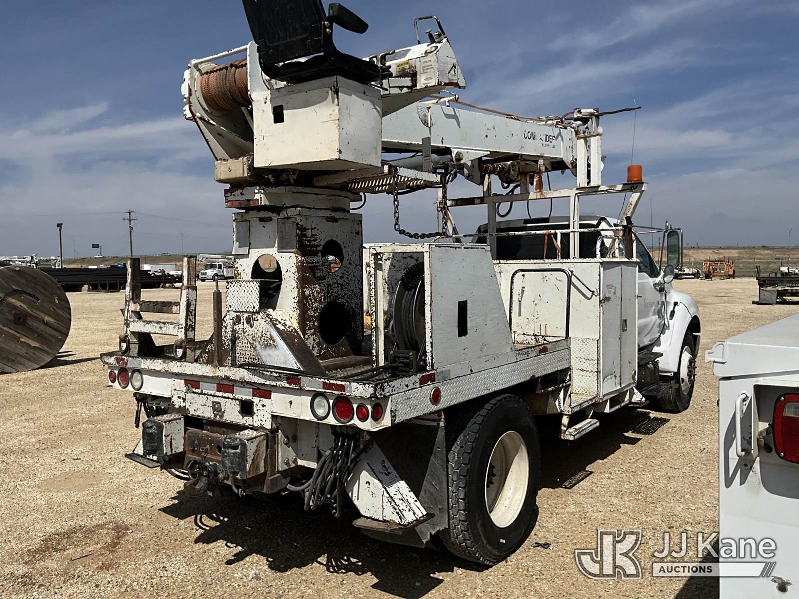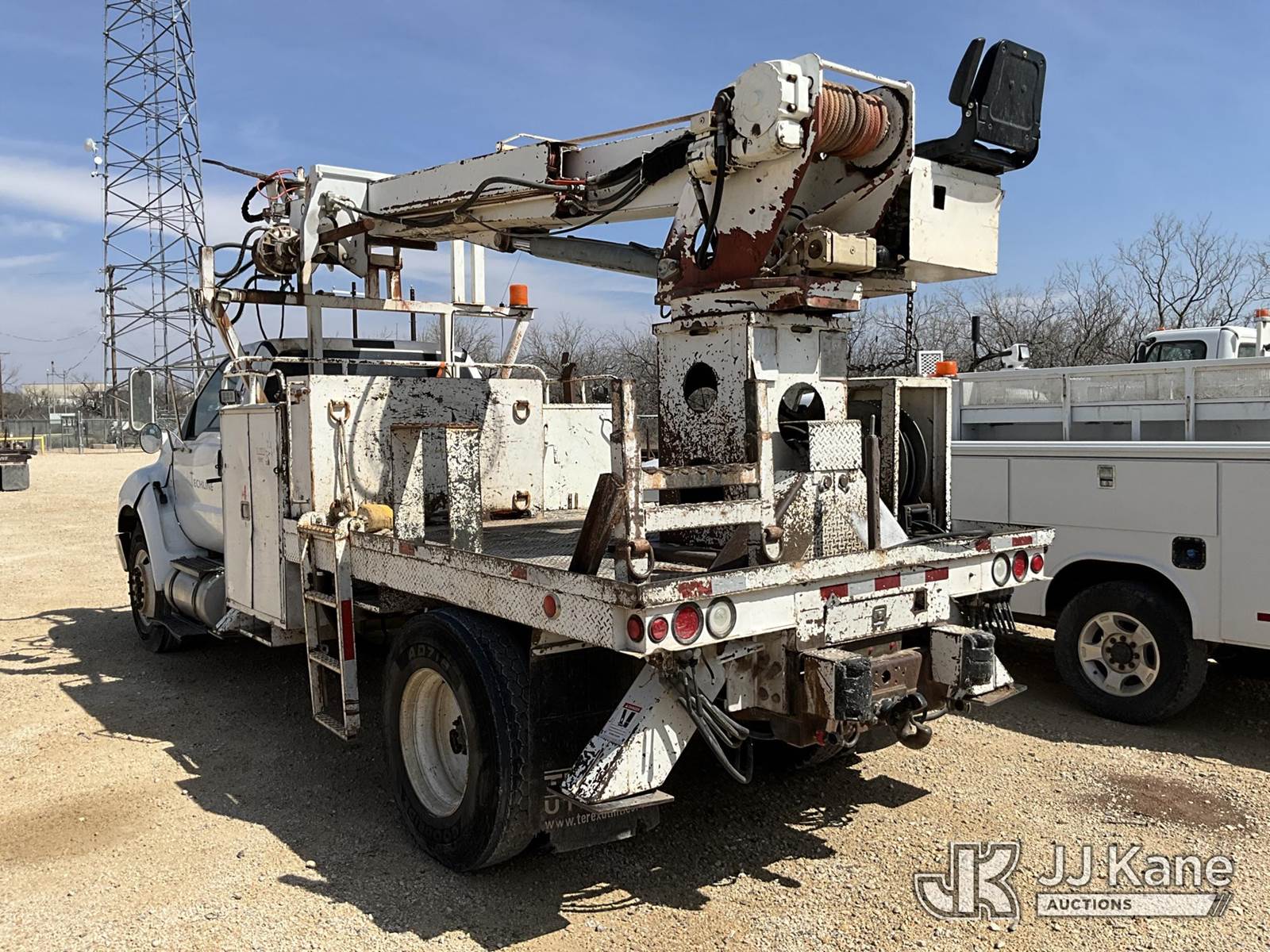 Terex Commander 4045, Digger Derrick s/n 2001013945, with 45’ sheave height, 3 section hyd boom, 2 spd digger, heel winch, pole grabs, riding seat & 4 hyd outriggers, rear mounted on 2015 Ford F-750 Regular Cab 2WD DRW Flatbed/Utility Truck, 6.7L L6 4X2, DIESEL, Auto, A/C, (154,699 miles) (**Dealer Only** Runs, Moves & Upper Operates, Check Engine Light On) (**Note** This item has been removed from service: Crack on Boom Weld, Fiberglass Cracks - Requires ANSI Inspection for repair/replacement requirements.) (Bidding Restricted to Licensed Vehicle Dealers Only), This is a Titled Item NOTE: This unit is being sold AS IS/WHERE IS via Timed Auction and is located in San Angelo, TX. (Missing manuals, See Auction Company for Manufacturers Information to obtain manuals) (Buyer is responsible for removal. Assistance by consignor or JJ Kane Auctions is not assured.)