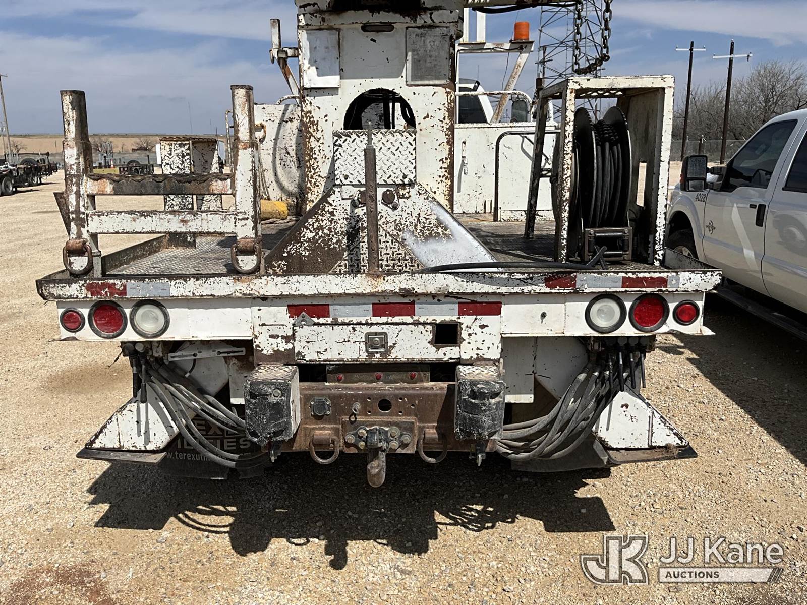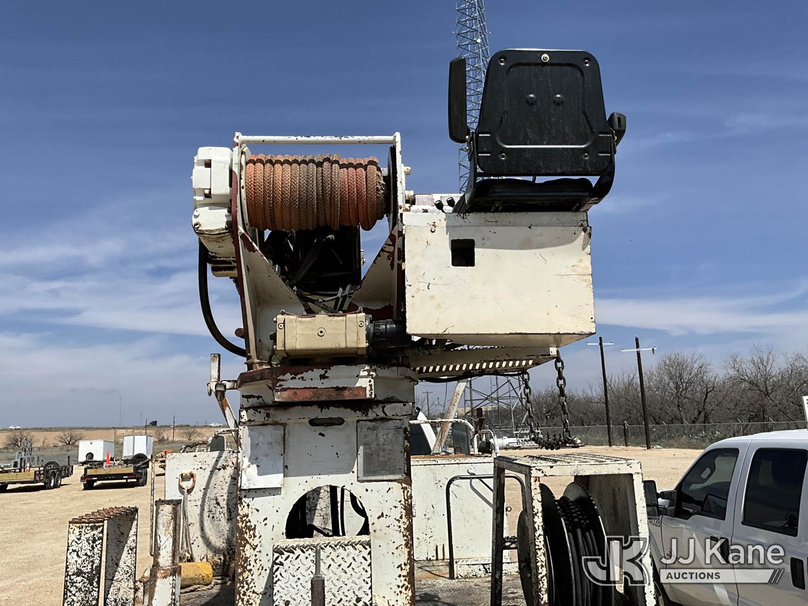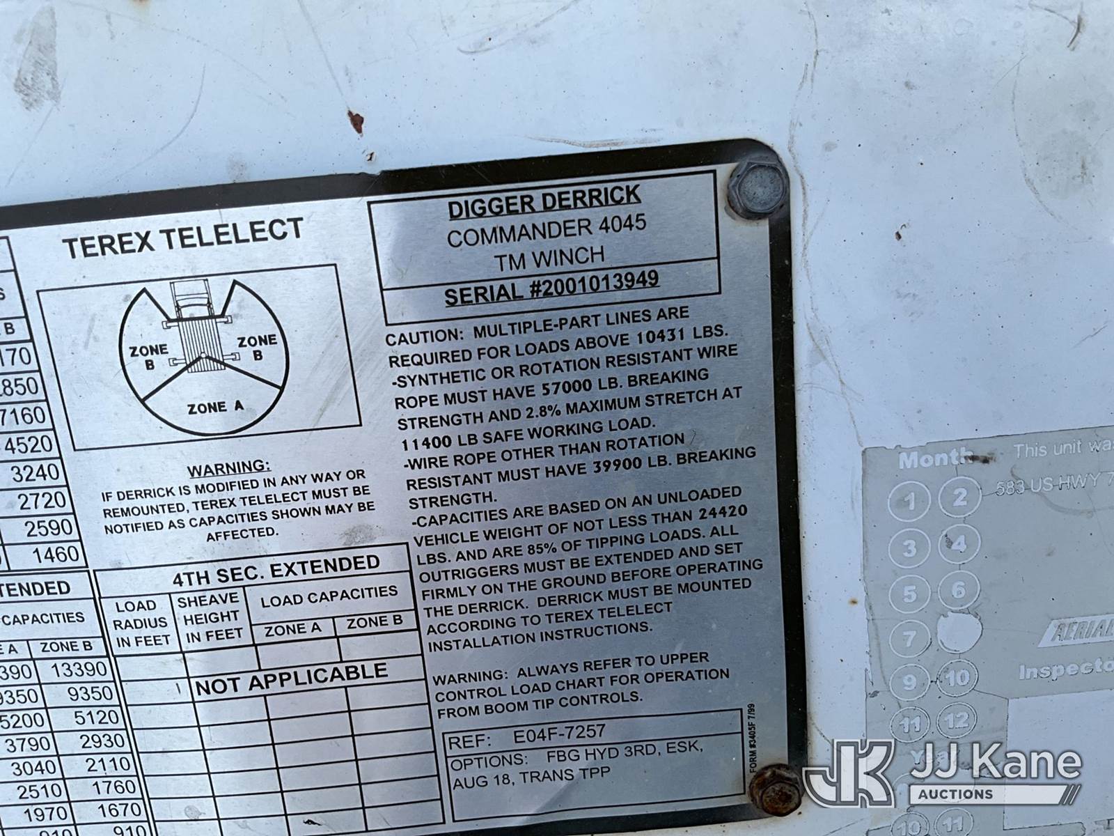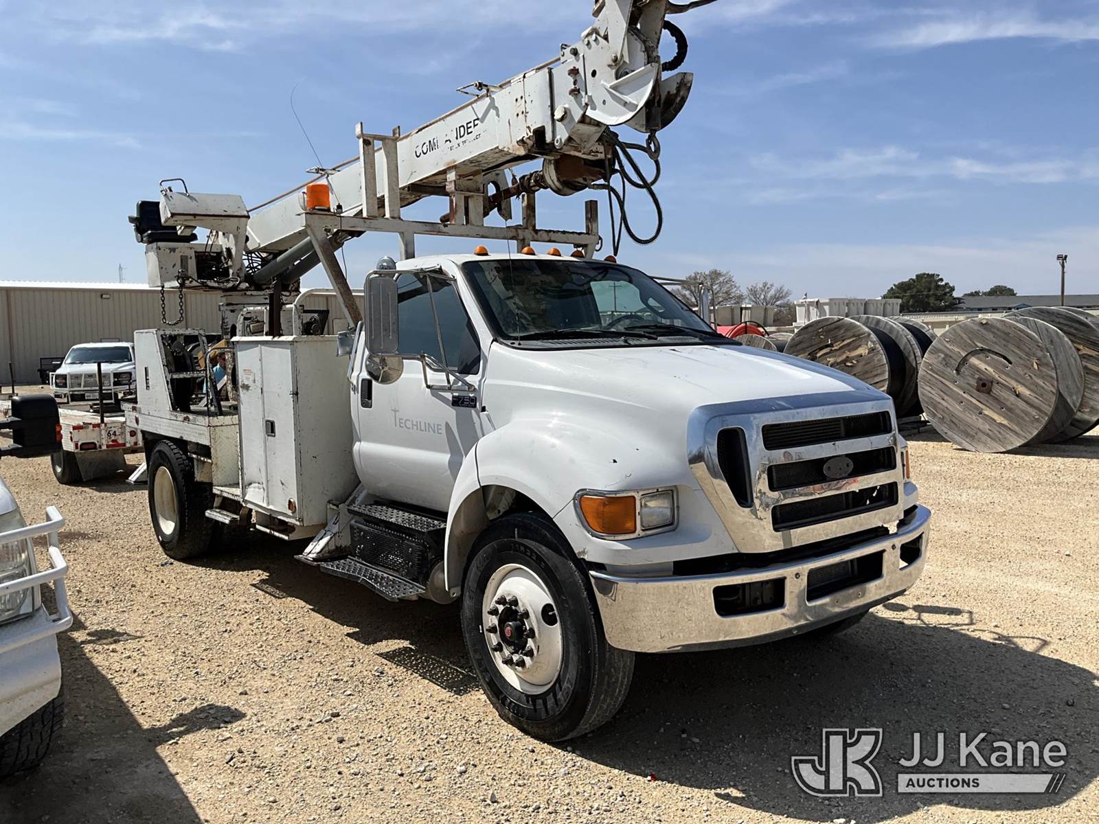 Terex Commander 4045, Digger Derrick s/n 2001013945, with 45’ sheave height, 3 section hyd boom, 2 spd digger, heel winch, pole grabs, riding seat & 4 hyd outriggers, rear mounted on 2015 Ford F-750 Regular Cab 2WD DRW Flatbed/Utility Truck, 6.7L L6 4X2, DIESEL, Auto, A/C, (154,699 miles) (**Dealer Only** Runs, Moves & Upper Operates, Check Engine Light On) (**Note** This item has been removed from service: Crack on Boom Weld, Fiberglass Cracks - Requires ANSI Inspection for repair/replacement requirements.) (Bidding Restricted to Licensed Vehicle Dealers Only), This is a Titled Item NOTE: This unit is being sold AS IS/WHERE IS via Timed Auction and is located in San Angelo, TX. (Missing manuals, See Auction Company for Manufacturers Information to obtain manuals) (Buyer is responsible for removal. Assistance by consignor or JJ Kane Auctions is not assured.)