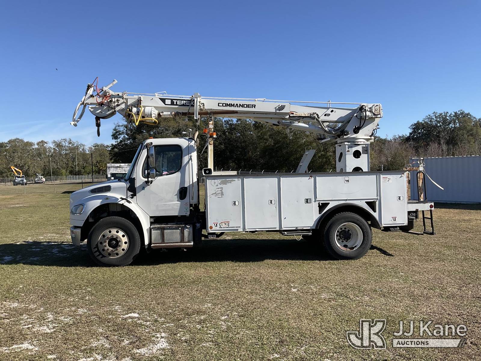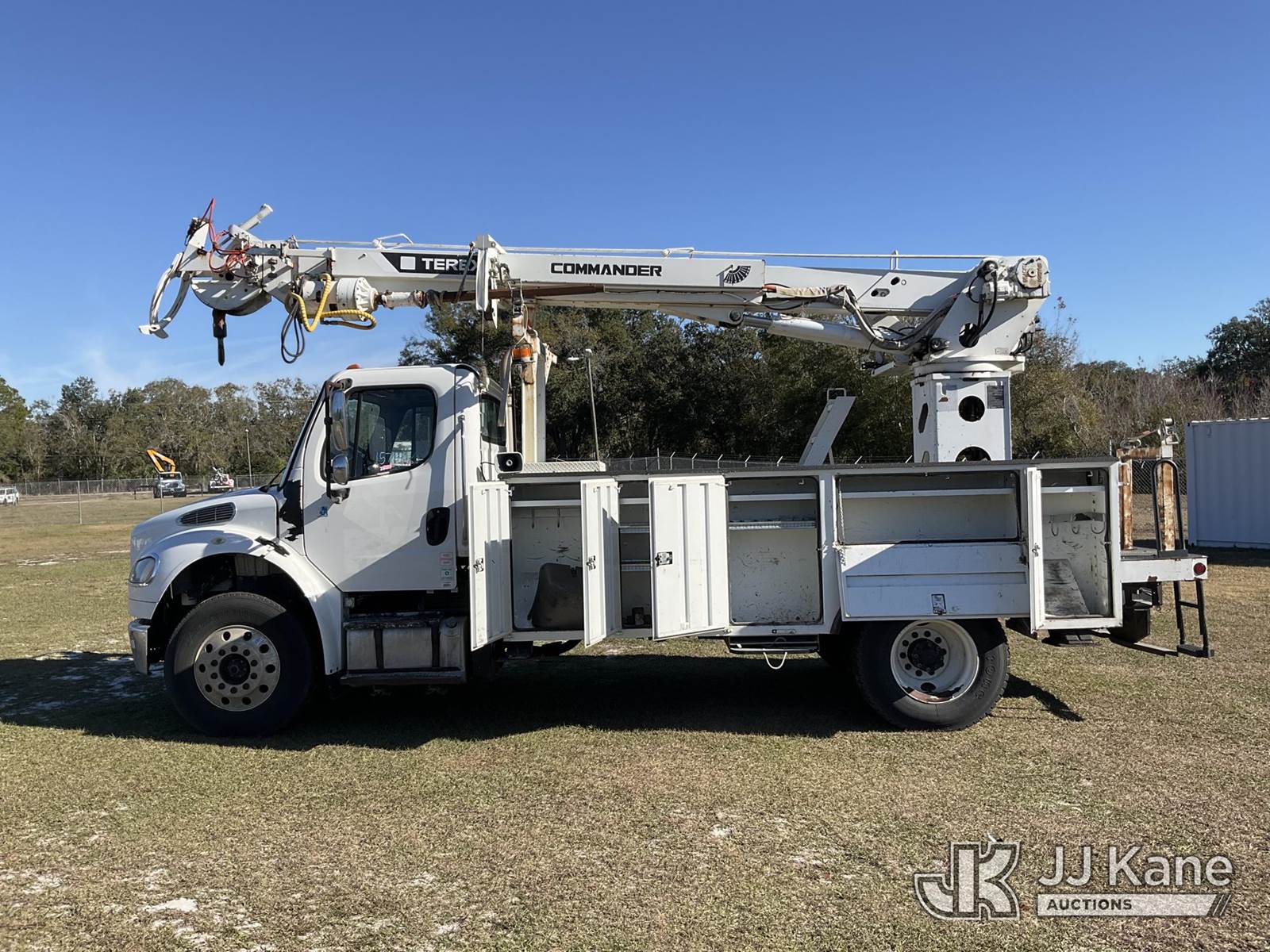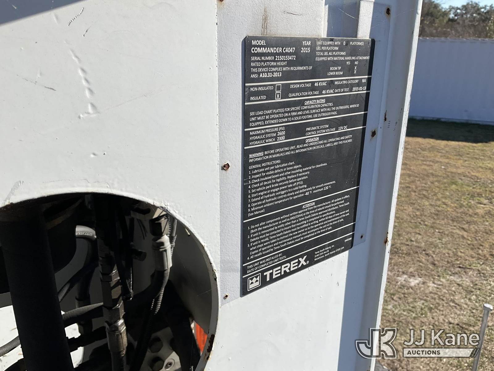 Terex/Telelect C4047, 23,620 Lb Digger Derrick s/n 2150153472, with 47 ft. sheave height, 3 section hyd boom, 2 spd digger, heel winch, pole guides, riding console & 4 hyd outriggers, rear mounted on 2015 Freightliner M2 106 Utility Truck, 8.9L L6 diesel, 4X2, Auto, A/C, (39,677 miles) (Runs, Moves, Upper Operates) (Check Engine Light On, Jump To Start, Radio Not Included, No Auger, Needs Battery) (FL Residents Purchasing Titled Items – tax, title & registration fees will be collected at the maximum rate of $400.00 under 25,999 and $800.00 for Over 26,000 and $250.00 trailers – Proof of insurance is mandatory; Out of State Residents Purchasing Title Items – tax will be collected based upon your state rate.) (Reads 4,292 hours) This is a Titled Item NOTE: This unit is being sold AS IS/WHERE IS via Timed Auction and is located in Thonotosassa, FL. Inspection & preview days for this unit are the 2 business days prior to the first day of items closing for this auction, item is located at 11720 N US 301 Thonotosassa, Fl 33592 and hours of operations are 8a-4p. For pre-sale questions, please contact Office Staff @ (813) 986-2485. (Buyer is responsible for removal. Assistance by consignor or JJ Kane Auctions is not assured.)