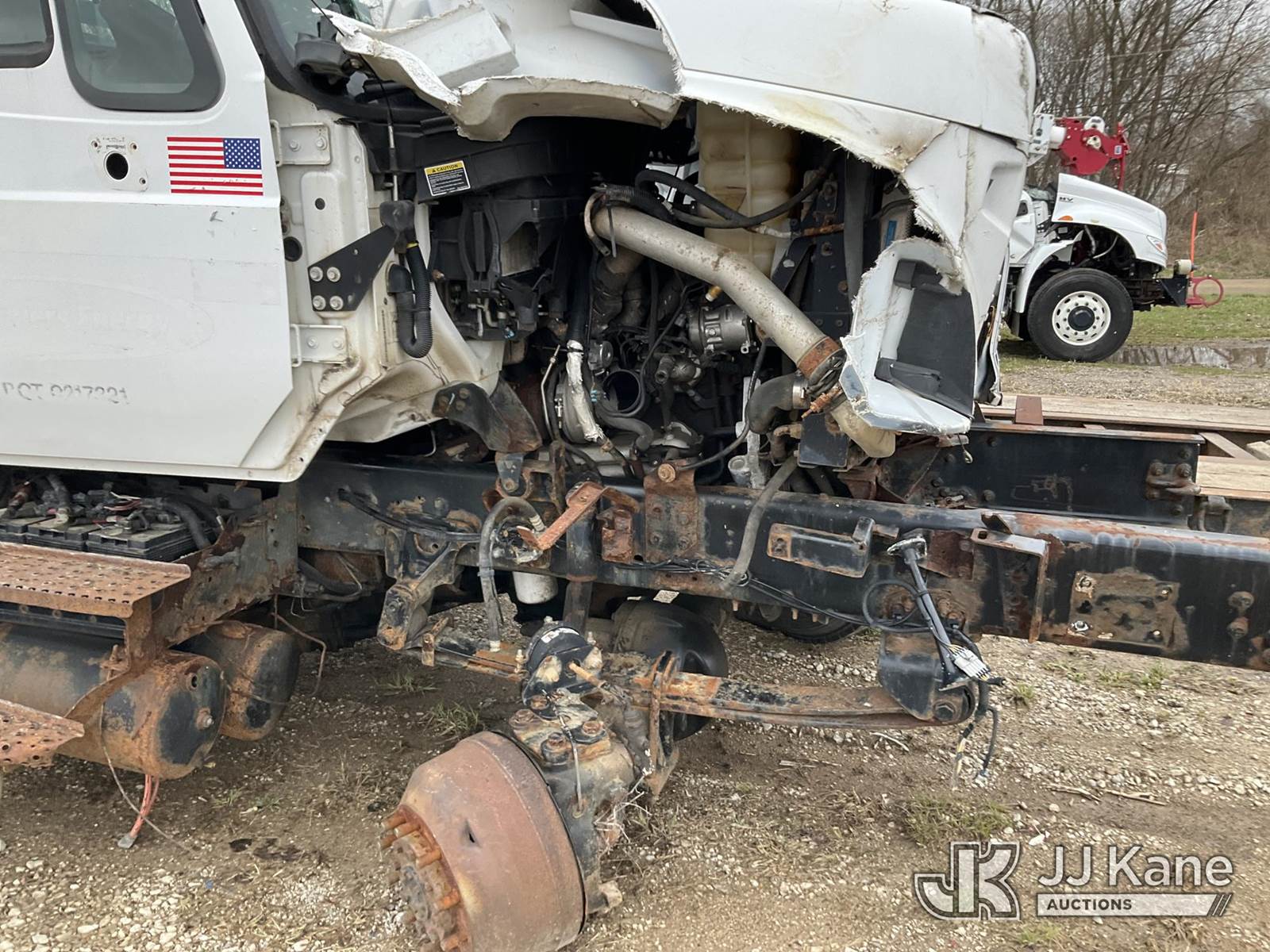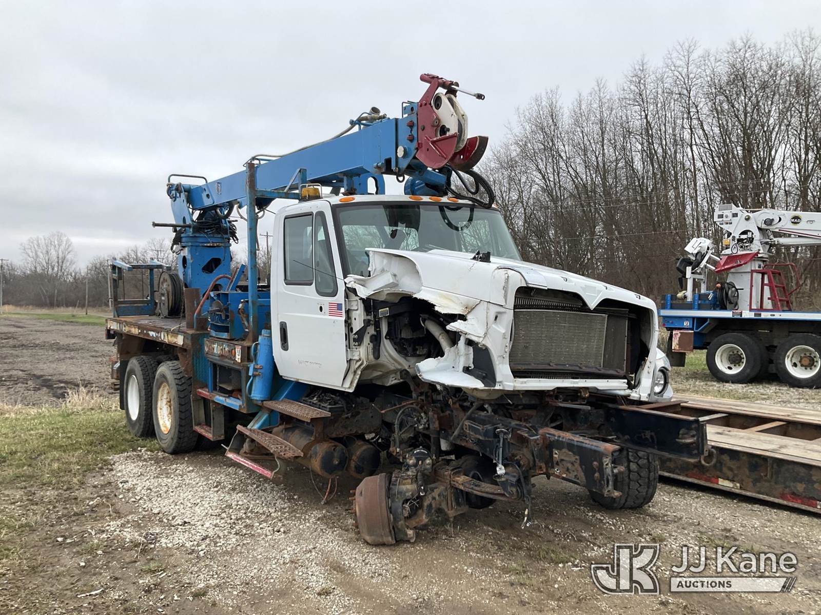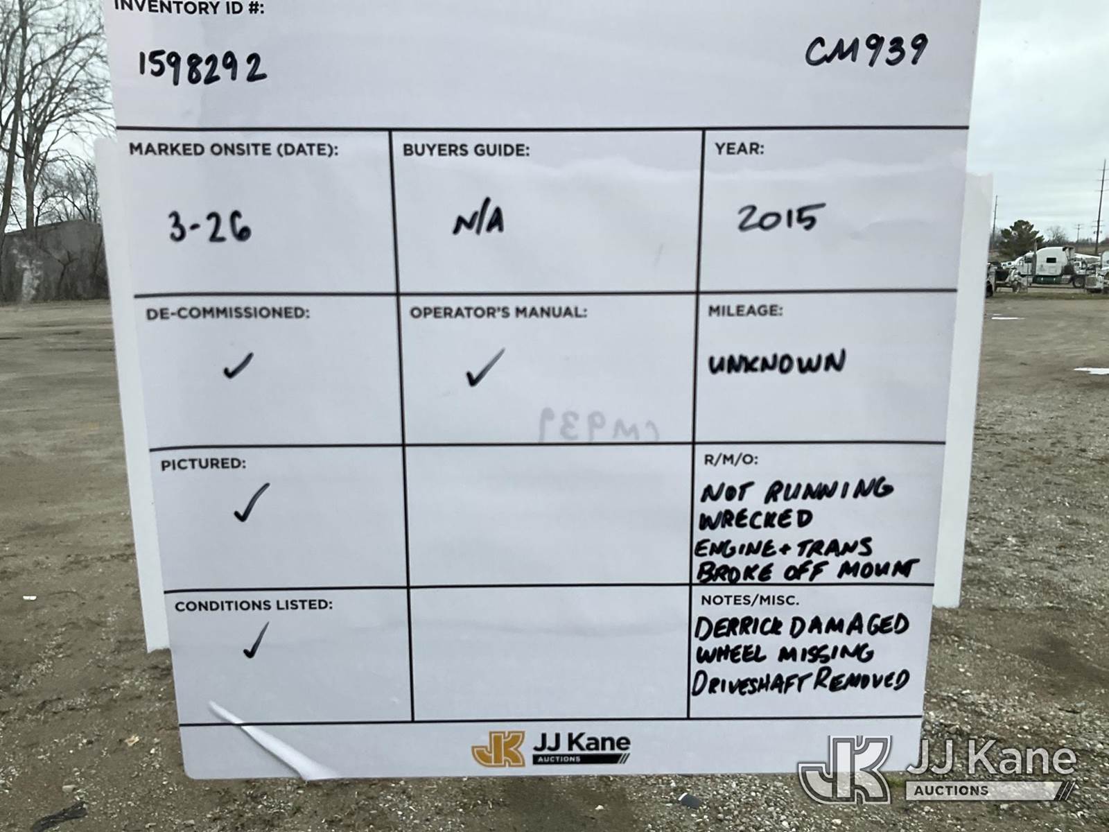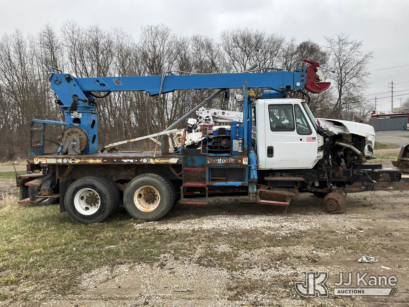 Terex/Telelect Commander C4047, 18,890 Lb Digger Derrick s/n 2140752571, with 45 ft sheave height. 3 section hyd boom, tip winch, pole guides, riding console & 4 hyd outriggers, rear mounted on 2015 International 7400 T/A Flatbed/Utility Truck, 7.6L L6 DIESEL 6X6, Auto, A/C, True Mileage Unknown (**Dealer Only** Not Running, Wrecked, Engine & Transmission Appear to Be Broken Off of Mounts, Missing Passenger Front Tire, Driveshaft Removed, Upper Condition Unknown (**Note** This item has been removed from service due to the listed safety repairs that were not completed. The safety items below must be completed by an approved upper OEM facility before the unit can return to service: UNIT WRECKED; REQUIRES MAJOR UNIT DAMAGE INSPECTION; COMPLETE ANY REQUIRED TESTING AND REPAIRS AFTER INSPECTIONS ARE COMPLETED)(BUYER OR TRANSPORTER RESPONSIBLE FOR LOADING WITHOUT ASSISTANCE FROM JJ KANE PERSONNEL)) (Bidding Restricted to Licensed Vehicle Dealers Only), This is a Titled Item NOTE: This unit is being sold AS IS/WHERE IS via Timed Auction and is located in Charlotte, MI. Inspection & preview days for this unit are the 2 business days prior to the first day of items closing for this auction, item is located at 750 Island Hwy Charlotte, MI 48813 and hours of operations are 8a-4p. For pre-sale questions, please contact Corey Cook at (517) 983-0796 or corey.cook@jjkane.com (Missing manuals, See Auction Company for Manufacturers Information to obtain manuals) (Buyer is responsible for removal. Assistance by consignor or JJ Kane Auctions is not assured.)