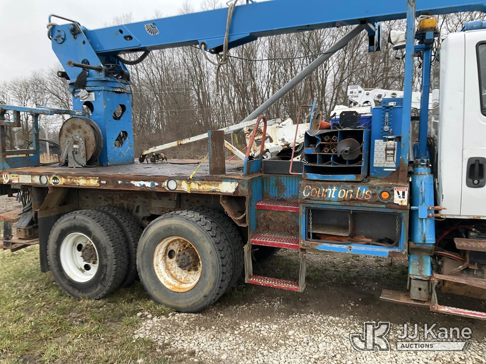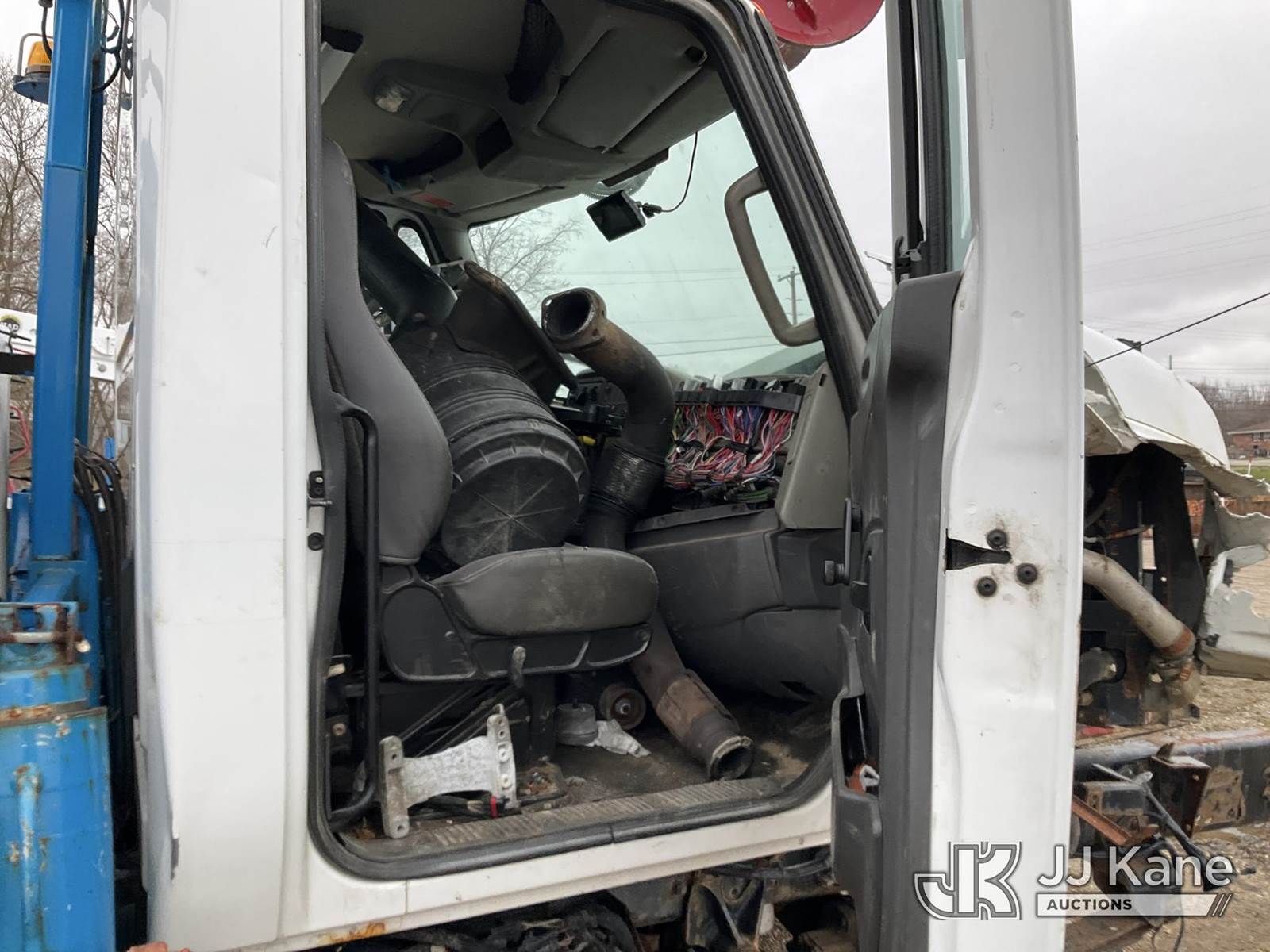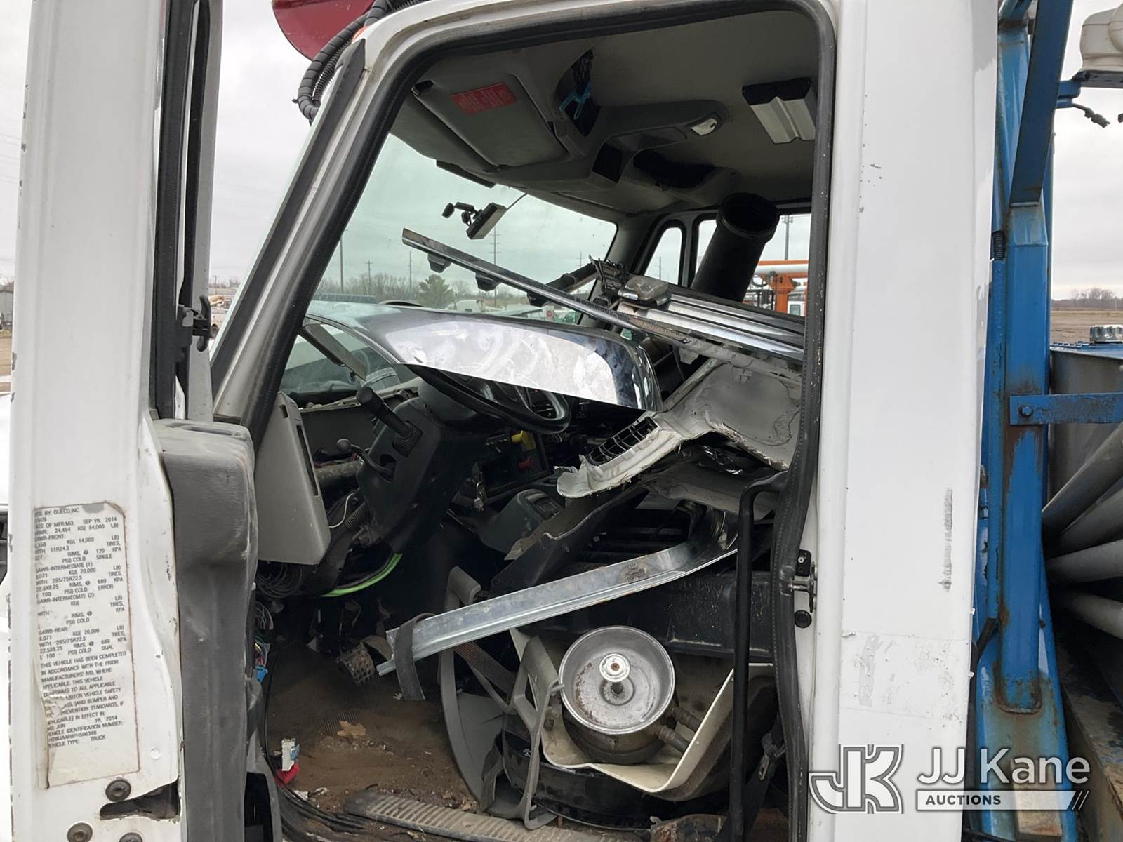 Terex/Telelect Commander C4047, 18,890 Lb Digger Derrick s/n 2140752571, with 45 ft sheave height. 3 section hyd boom, tip winch, pole guides, riding console & 4 hyd outriggers, rear mounted on 2015 International 7400 T/A Flatbed/Utility Truck, 7.6L L6 DIESEL 6X6, Auto, A/C, True Mileage Unknown (**Dealer Only** Not Running, Wrecked, Engine & Transmission Appear to Be Broken Off of Mounts, Missing Passenger Front Tire, Driveshaft Removed, Upper Condition Unknown (**Note** This item has been removed from service due to the listed safety repairs that were not completed. The safety items below must be completed by an approved upper OEM facility before the unit can return to service: UNIT WRECKED; REQUIRES MAJOR UNIT DAMAGE INSPECTION; COMPLETE ANY REQUIRED TESTING AND REPAIRS AFTER INSPECTIONS ARE COMPLETED)(BUYER OR TRANSPORTER RESPONSIBLE FOR LOADING WITHOUT ASSISTANCE FROM JJ KANE PERSONNEL)) (Bidding Restricted to Licensed Vehicle Dealers Only), This is a Titled Item NOTE: This unit is being sold AS IS/WHERE IS via Timed Auction and is located in Charlotte, MI. Inspection & preview days for this unit are the 2 business days prior to the first day of items closing for this auction, item is located at 750 Island Hwy Charlotte, MI 48813 and hours of operations are 8a-4p. For pre-sale questions, please contact Corey Cook at (517) 983-0796 or corey.cook@jjkane.com (Missing manuals, See Auction Company for Manufacturers Information to obtain manuals) (Buyer is responsible for removal. Assistance by consignor or JJ Kane Auctions is not assured.)