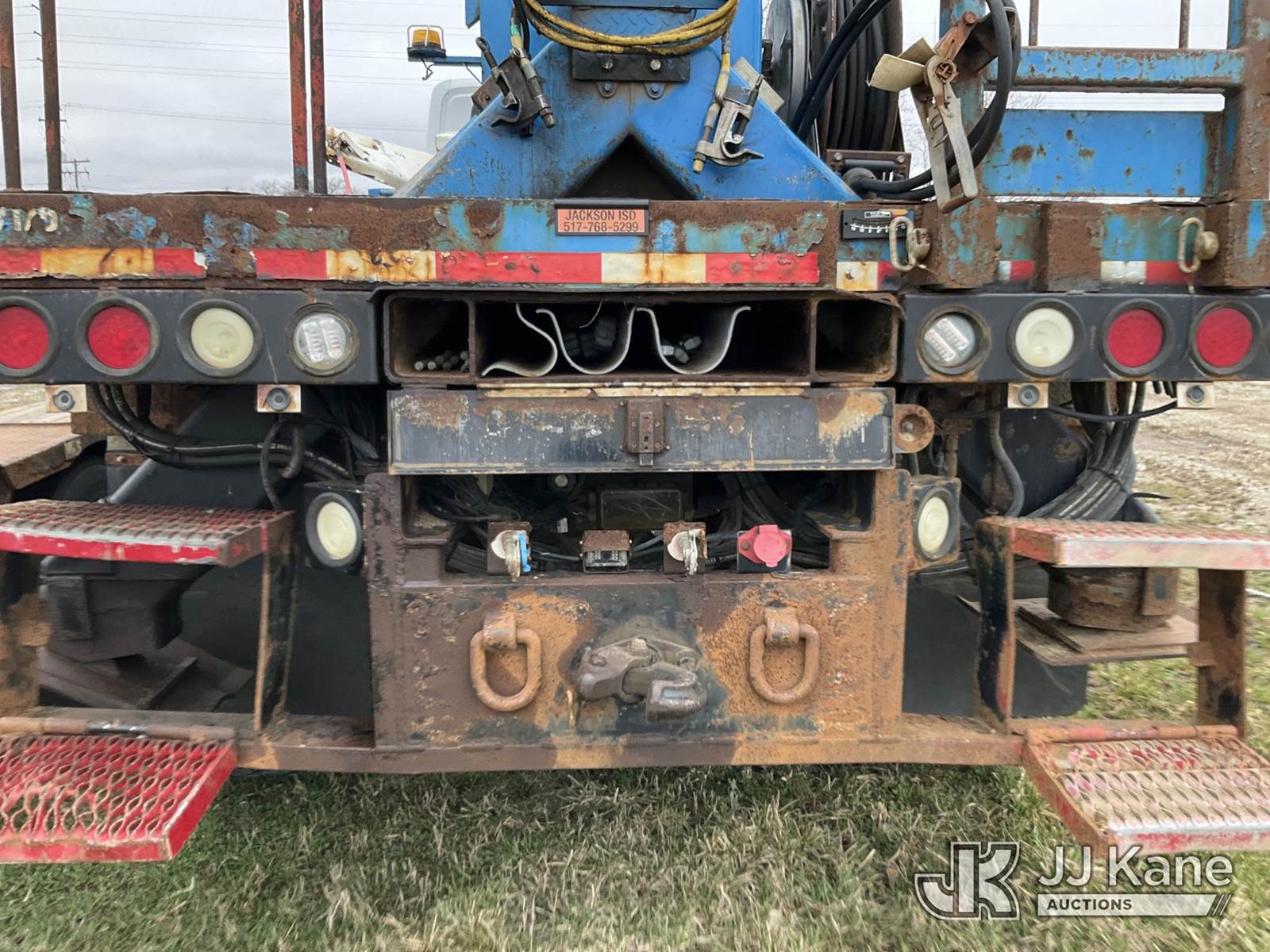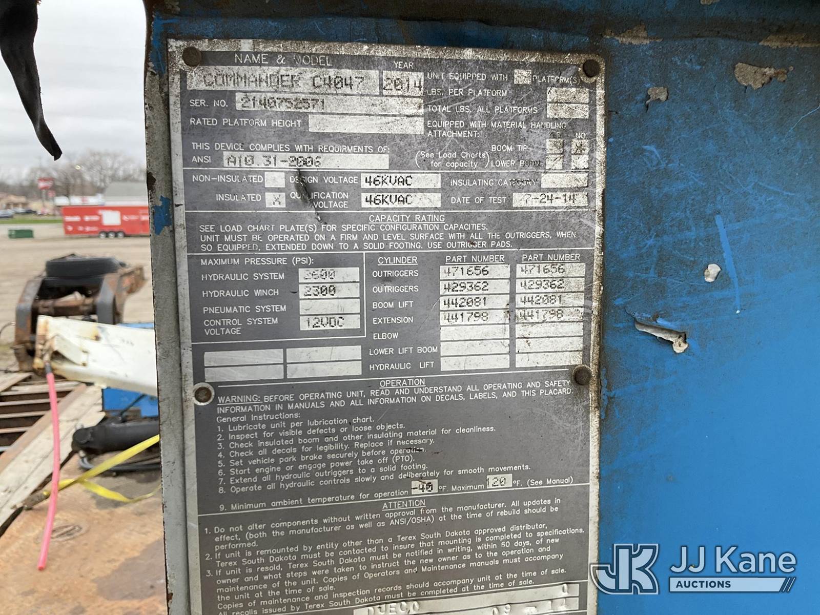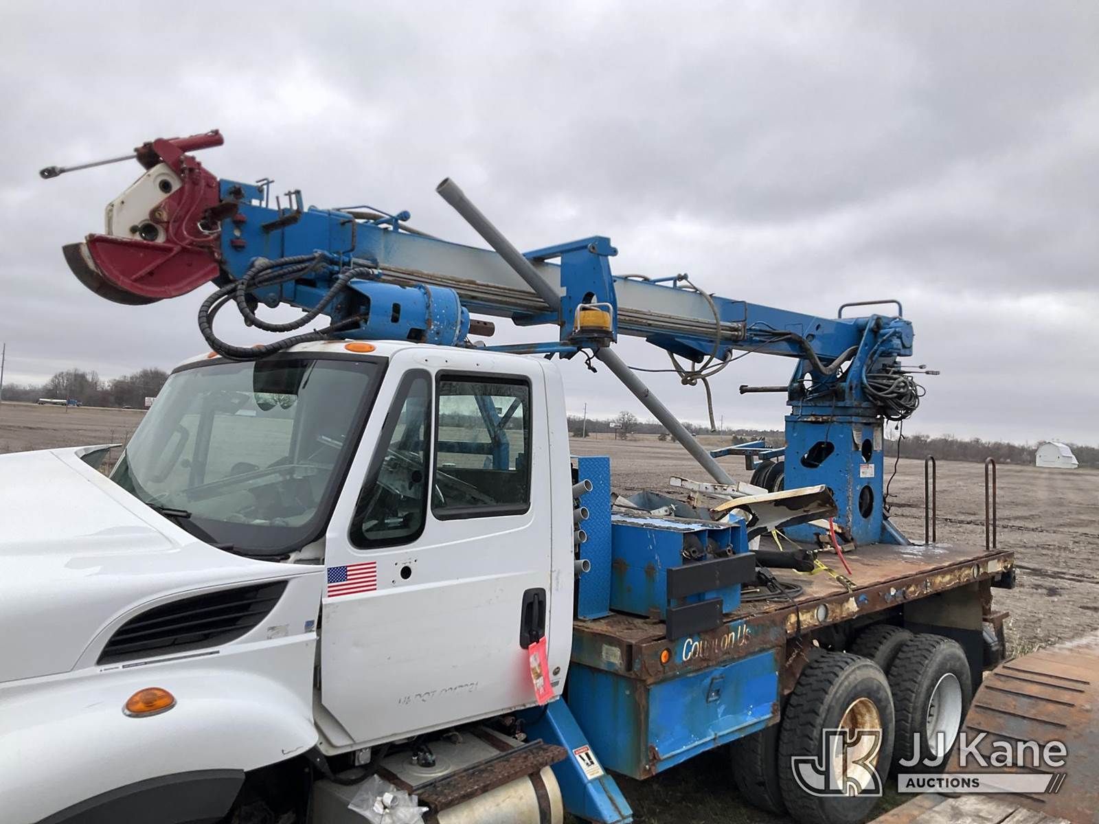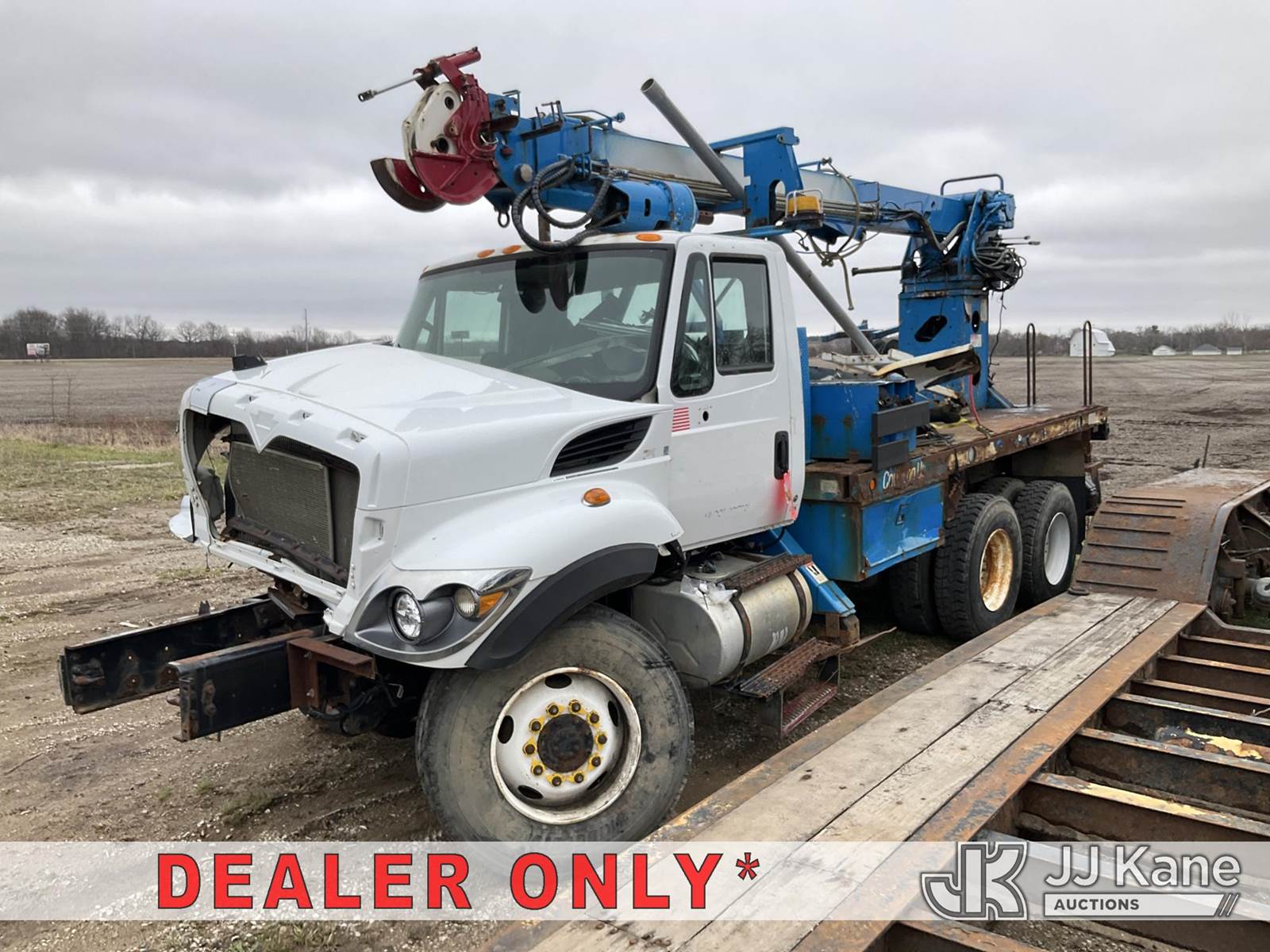 Terex/Telelect Commander C4047, 18,890 Lb Digger Derrick s/n 2140752571, with 45 ft sheave height. 3 section hyd boom, tip winch, pole guides, riding console & 4 hyd outriggers, rear mounted on 2015 International 7400 T/A Flatbed/Utility Truck, 7.6L L6 DIESEL 6X6, Auto, A/C, True Mileage Unknown (**Dealer Only** Not Running, Wrecked, Engine & Transmission Appear to Be Broken Off of Mounts, Missing Passenger Front Tire, Driveshaft Removed, Upper Condition Unknown (**Note** This item has been removed from service due to the listed safety repairs that were not completed. The safety items below must be completed by an approved upper OEM facility before the unit can return to service: UNIT WRECKED; REQUIRES MAJOR UNIT DAMAGE INSPECTION; COMPLETE ANY REQUIRED TESTING AND REPAIRS AFTER INSPECTIONS ARE COMPLETED)(BUYER OR TRANSPORTER RESPONSIBLE FOR LOADING WITHOUT ASSISTANCE FROM JJ KANE PERSONNEL)) (Bidding Restricted to Licensed Vehicle Dealers Only), This is a Titled Item NOTE: This unit is being sold AS IS/WHERE IS via Timed Auction and is located in Charlotte, MI. Inspection & preview days for this unit are the 2 business days prior to the first day of items closing for this auction, item is located at 750 Island Hwy Charlotte, MI 48813 and hours of operations are 8a-4p. For pre-sale questions, please contact Corey Cook at (517) 983-0796 or corey.cook@jjkane.com (Missing manuals, See Auction Company for Manufacturers Information to obtain manuals) (Buyer is responsible for removal. Assistance by consignor or JJ Kane Auctions is not assured.)