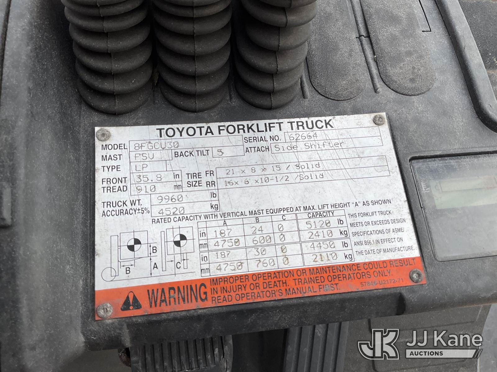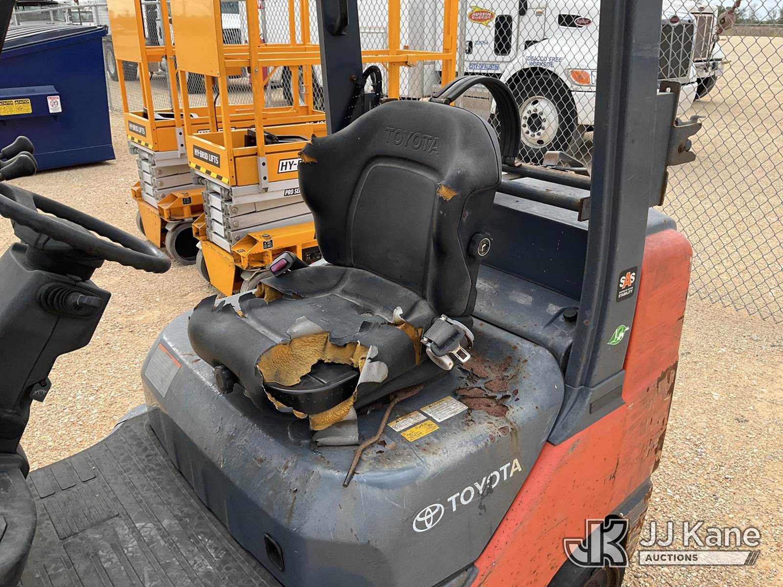 2015 Toyota 8FGCU30 Cushion Tired Forklift, s/n 8FGU1862664, Shuttle, LPG, with 5120lbs capacity, 187in fork height, (Not Running, Condition Unknown, No Key Or Fuel Tank, Body/Paint/Rust Damage) NOTE: This unit is being sold AS IS/WHERE IS via Timed Auction and is located in Marion, TX. Inspection & preview days for this unit are the 2 business days prior to the first day of items closing for this auction, item is located at 3292 S Santa Clara Rd Marion, TX 78124 and hours of operations are 8a-4p. For pre-sale questions, please contact Brian Jarrell @ 210-540-3147. (Buyer is responsible for removal. Assistance by consignor or JJ Kane Auctioneers is not assured.)