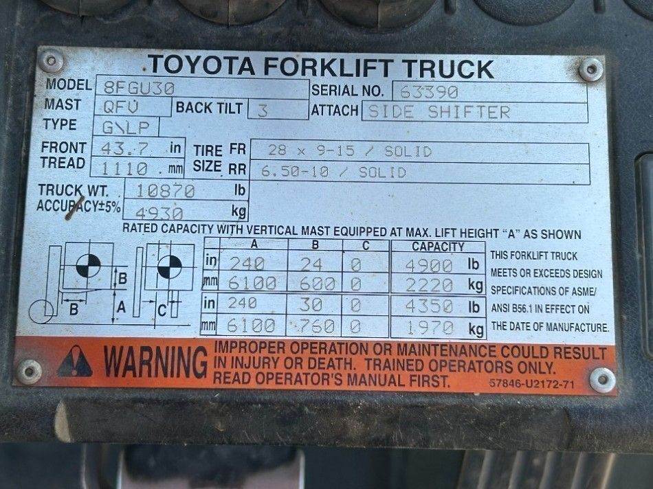 2015 TOYOTA 8FGU30 FORKLIFT, 6,000#, 80" mast, 4-stage, 240" lift, sideshift, dual fuel, canopy. s/n:8FGU32-63390