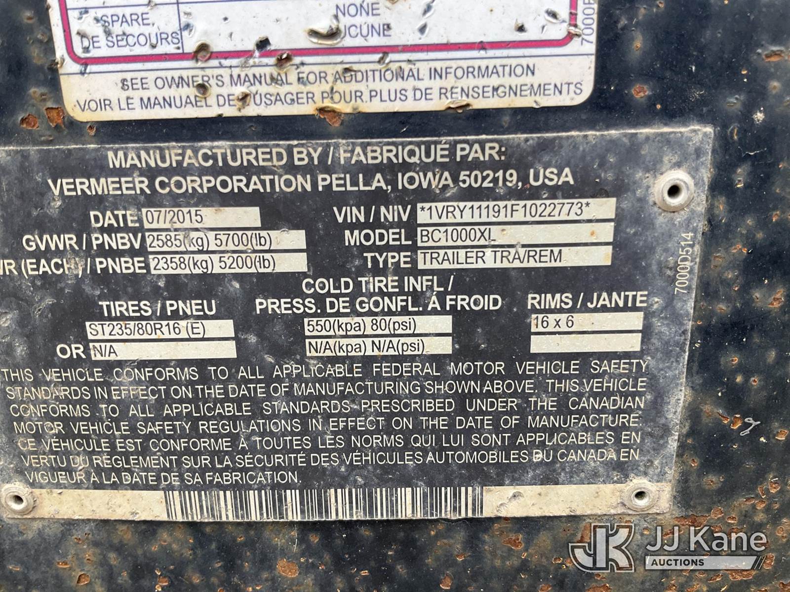 2015 Vermeer BC1000XL Chipper (12in Drum), gas, (Not Running, Condition Unknown, No Key) (Seller States: Aged unit has bad bearings on drum, engine issues) This is a Titled Item NOTE: This unit is being sold AS IS/WHERE IS via Timed Auction and is located in Waxahachie, TX. Inspection & preview days for this unit are the 2 business days prior to the first day of items closing for this auction, item is located at 999 Solon Rd Waxahachie, TX 75165 and hours of operations are 8a-4p. For pre-sale questions, please contact Alex Bayless @ (469) 550-4938. (Buyer is responsible for removal. Assistance by consignor or JJ Kane Auctions is not assured.)