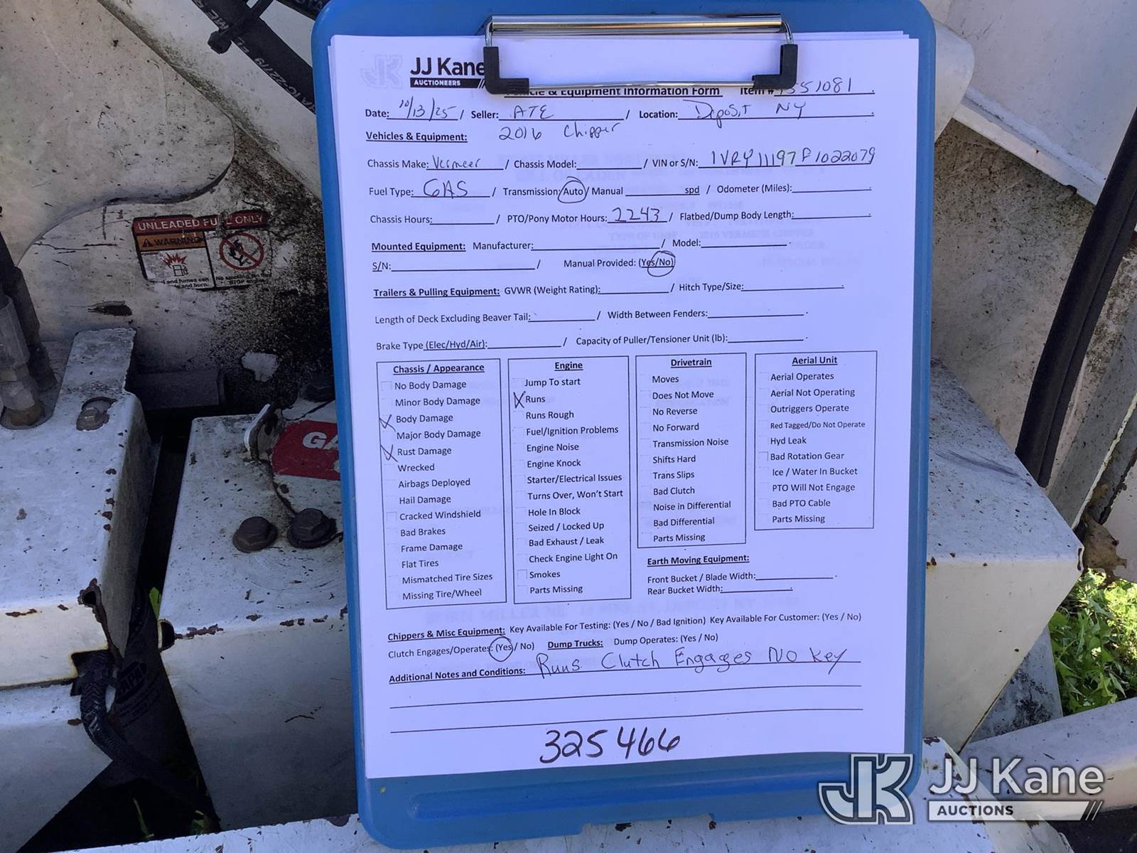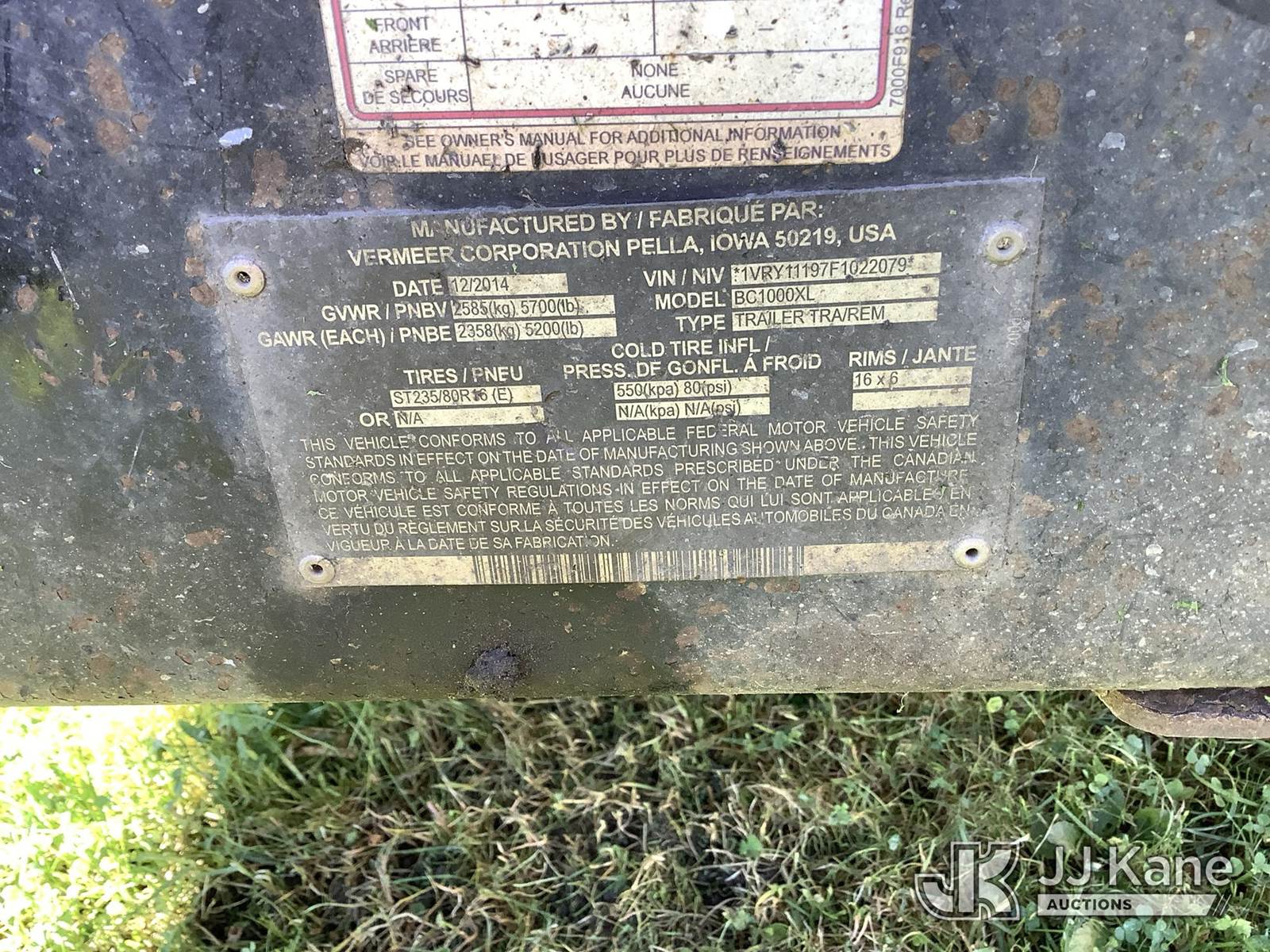 2015 Vermeer BC1000XL Portable Chipper (12in Drum), gas Trailer Mounted (Runs, Clutch Engages, No Key) (Seller States: Brakes, tires, feed sense spool valve) (Removal is by Appointment Only, Buyer MUST make a appointment prior to picking up, Buyer/Transporter Must have PAID IN FULL RELEASE. No onsite assistance available, Please Come prepared.) (Reads 2,243 hours) This is a Titled Item NOTE: This unit is being sold AS IS/WHERE IS via Timed Auction and is located in Deposit, NY. Inspection & preview days for this unit are by appointment only; please contact us at contact@jjkane.com or 84-Go-JJKane for more details. (Buyer is responsible for removal. Assistance by consignor or JJ Kane Auctioneers is not assured.)