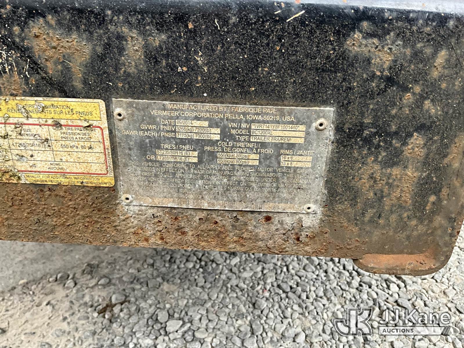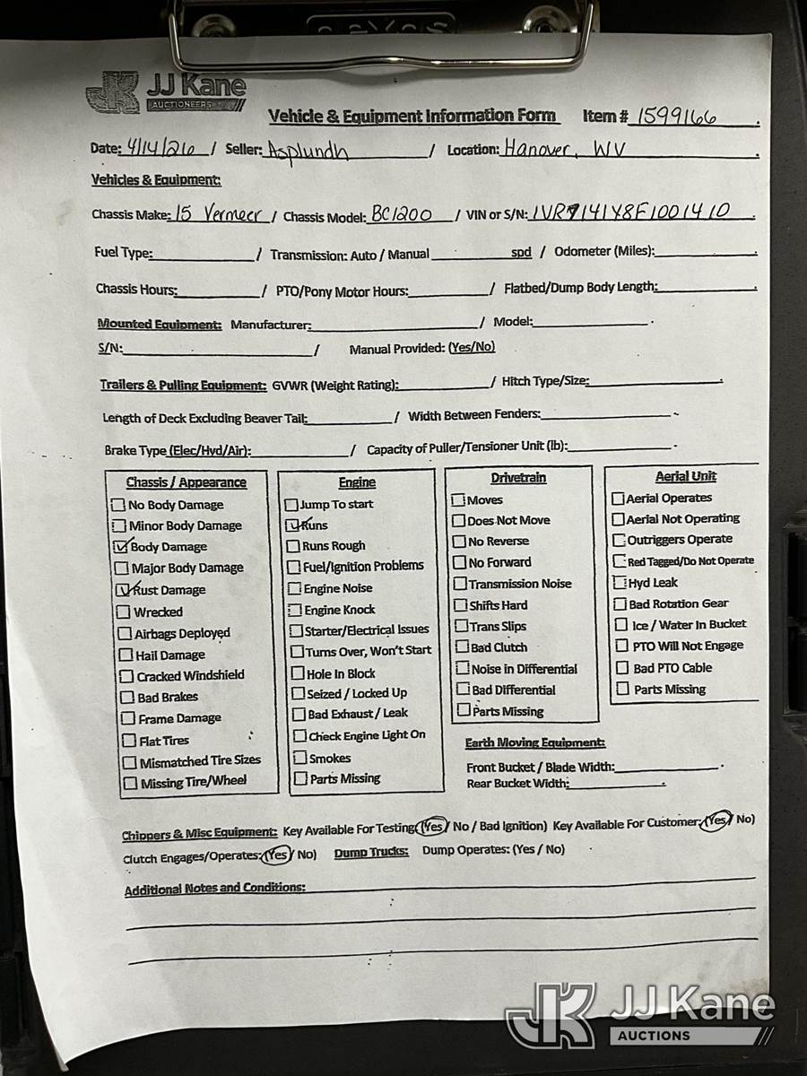 2015 Vermeer BC1200XL Chipper (12in Drum), s/n 1VR7141Y8F1001410, (Runs & Operates)(Seller States: May need tires or battery) NOTE: This unit is being sold AS IS/WHERE IS via Timed Auction and is located in Hanover, WV. Inspection & preview days for this unit are by appointment only; please contact us at contact@jjkane.com or 84-Go-JJKane for more details. (Buyer is responsible for removal. Assistance by consignor or JJ Kane Auctions is not assured.)