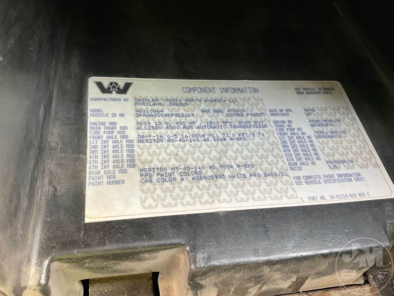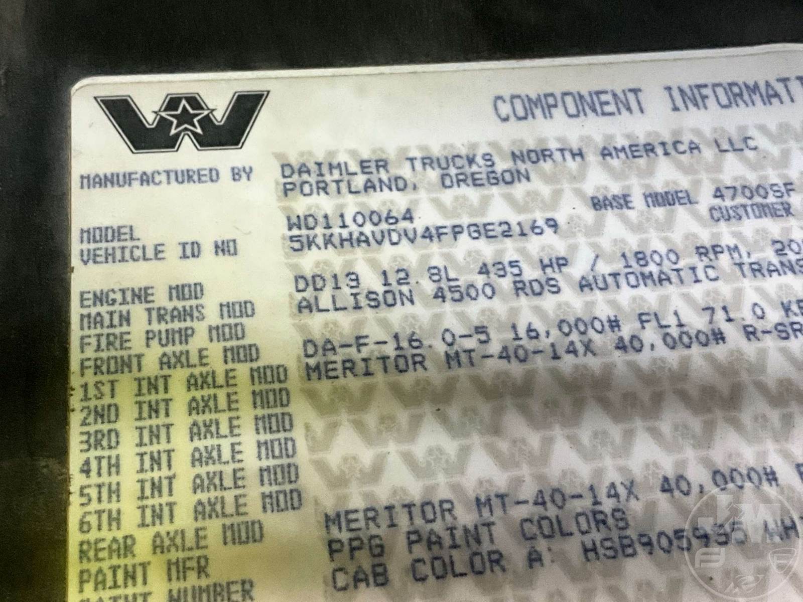 TANDEM AXLE DUMP TRUCK, DETROIT, DD13 12.8L, HP 435, ALLISON, AUTOMATIC, AIR BRAKES, SPRING SUSPENSION, 207 " WB, 16K FRONTS, 40K REARS, ENGINE BRAKE, DIFF LOCK, CRUISE CONTROL, A/C, OX BODIES, 15', ALUM, DUMP BODY, SPREADER APRON, TARP, AIR GATE, ALUMINUM FRONTS STEEL REAR WHEELS, 11R24.5 TIRES, ODOMETER READS: 451682