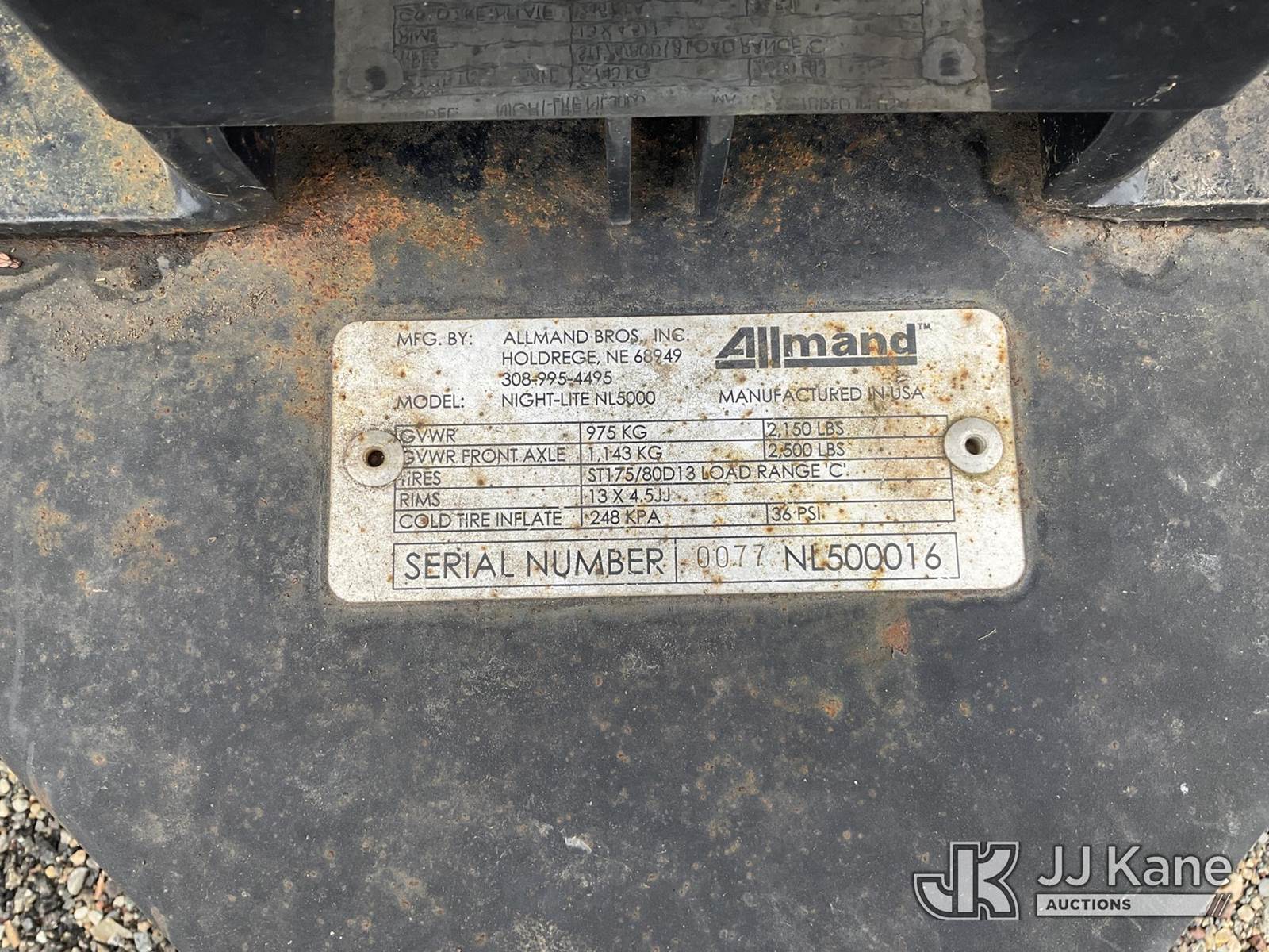 2016 Allmand Bros NL5000 Light Tower, s/n 0077NL500016, Kubota diesel, Trailer Mtd. (No Title) (Runs, Lights Not Operating) (Reads 7,681 hours) NOTE: This unit is being sold AS IS/WHERE IS via Timed Auction and is located in Plymouth Meeting, PA. Inspection & preview days for this unit are the 2 business days prior to the first day of items closing for this auction, item is located at 1402 Conshohocken Rd Plymouth Meeting, PA 19462 and hours of operations are 8a-4p. For pre-sale questions, please contact Bruce Thomas @ (267) 887-0392 or bruce.thomas.jr@jjkane.com. (Buyer is responsible for removal. Assistance by consignor or JJ Kane Auctioneers is not assured.)