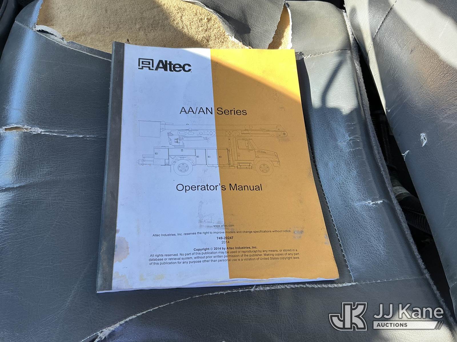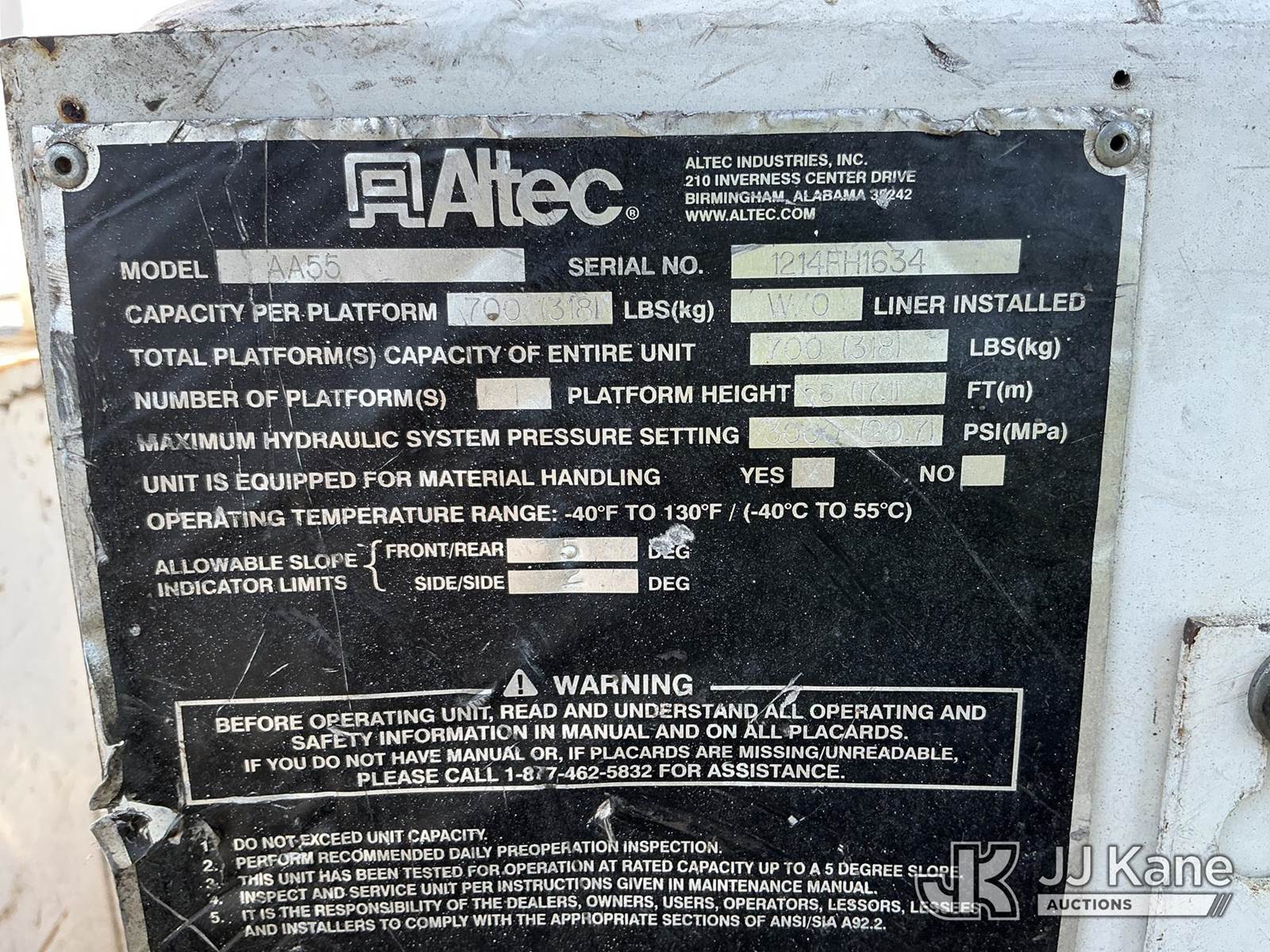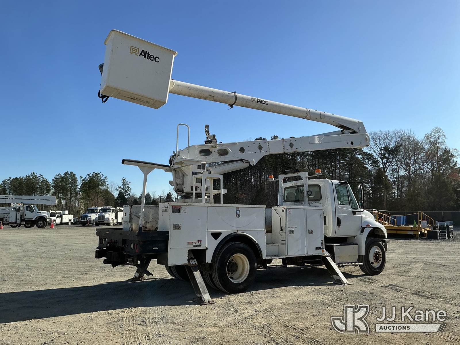 Altec AA55-MH, 61 ft, Material Handling Bucket Truck s/n 1214FH1634 (YEAR 2014), with two-man bucket, rear mounted on 2016 International DuraStar 4300 Utility Truck, Cummins 6.7L diesel, Auto, A/C, (83,114 miles) (Runs, Moves & Upper Operates) (Remounted Upper Unit YEAR 2015) (Check Engine Light On, Cracked Windshield, Exhaust Leak) (Seller States: Needs Rotation Bearing Kit) This is a Titled Item NOTE: This unit is being sold AS IS/WHERE IS via Timed Auction and is located in China Grove, NC. Inspection & preview days for this unit are the 2 business days prior to the first day of items closing for this auction, item is located at 820 E NC Hwy 152 China Grove, NC 28023 and hours of operations are 8a-4p. For pre-sale questions, please contact Office Staff @ (704) 674-1113. (Manuals provided in cab) (Buyer is responsible for removal. Assistance by consignor or JJ Kane Auctions is not assured.)