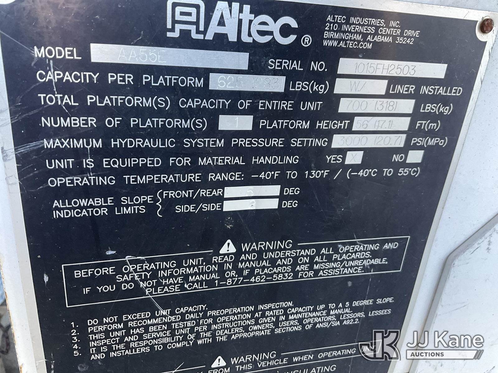 Altec AA55E-MH, 60 ft, Material Handling Bucket Truck s/n 1015FH2503, with two-man bucket, rear mounted on 2016 Freightliner M2 106 Utility Truck, Cummins 6.7L diesel, Auto, A/C, with front winch & Tire Boss system, (51,357 miles (unverified)) (Runs, Moves & Upper Operates ) This is a Titled Item NOTE: This unit is being sold AS IS/WHERE IS via Timed Auction and is located in China Grove, NC. Inspection & preview days for this unit are the 2 business days prior to the first day of items closing for this auction, item is located at 820 E NC Hwy 152 China Grove, NC 28023 and hours of operations are 8a-4p. For pre-sale questions, please contact Office Staff @ (704) 674-1113. (Manuals provided in cab) (Buyer is responsible for removal. Assistance by consignor or JJ Kane Auctions is not assured.)