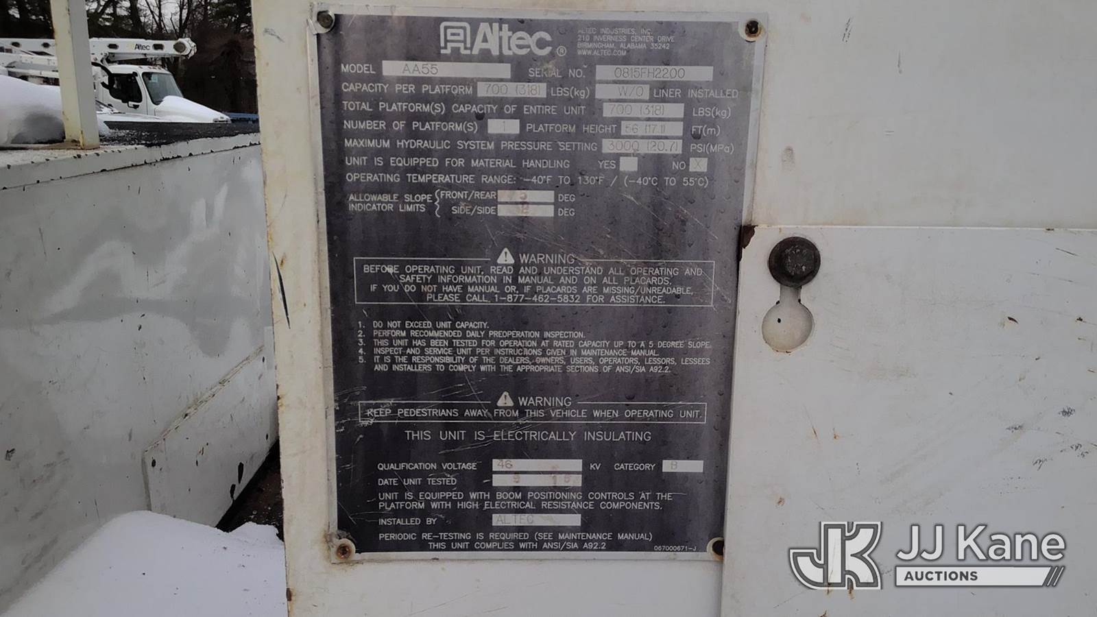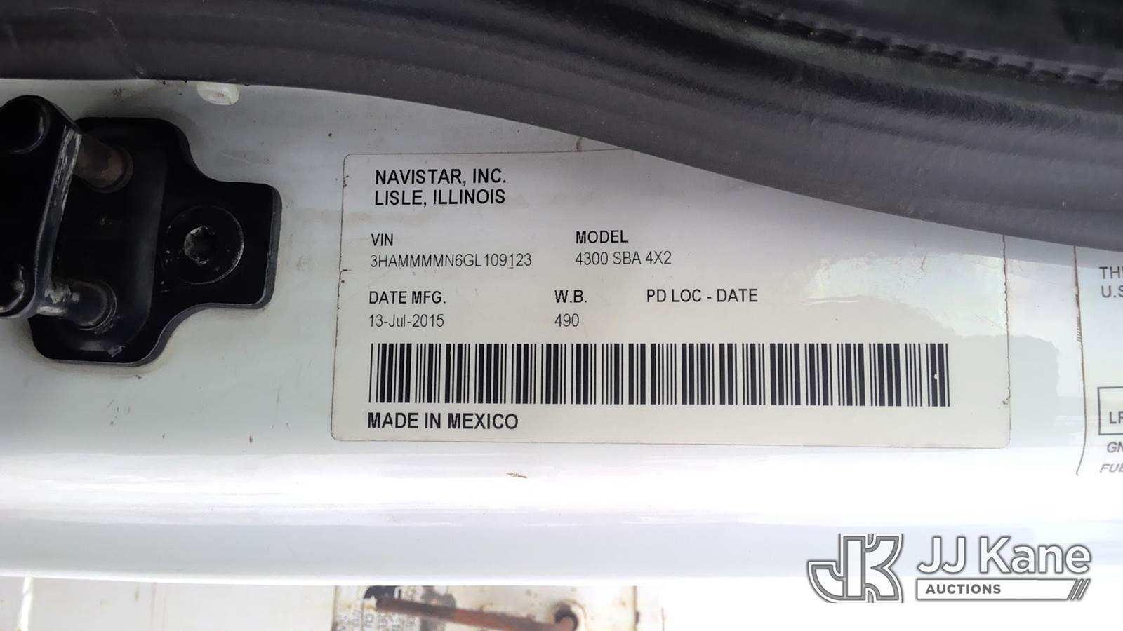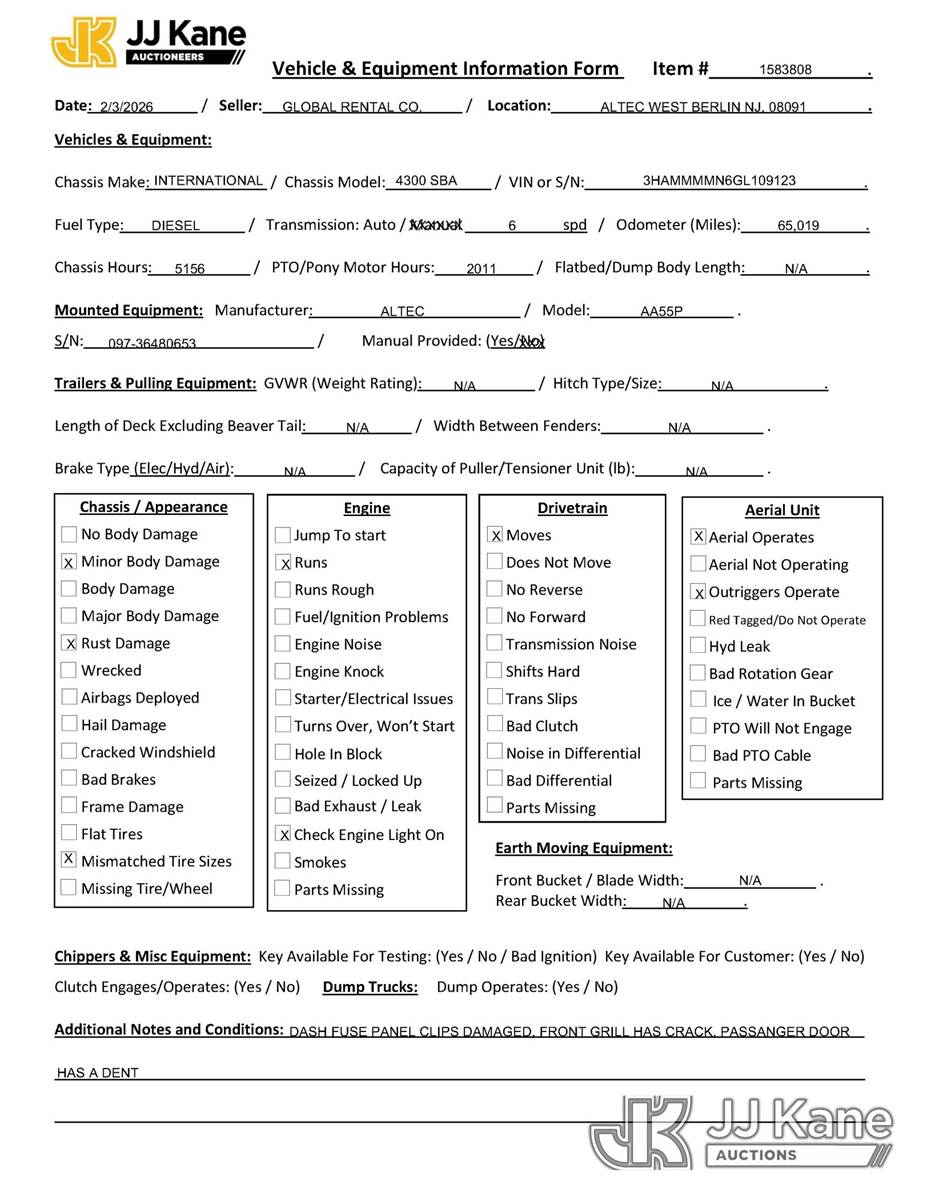 Altec AA55P, 60 ft, Bucket Truck s/n 0815FH2200, with two-man bucket & 4 hyd outriggers, rear mounted on 2016 International DuraStar 4300 Utility Truck, 6.7L diesel, 4X2, Auto, A/C, (65,019 miles) (Runs, Moves & Upper Operates) (Check Engine Light On, Rust Damage, Mismatched Tire Sizes) This is a Titled Item NOTE: This unit is being sold AS IS/WHERE IS via Timed Auction and is located in West Berlin, NJ. For pre-sale questions or to schedule an inspection, please contact Brent Stephens @ (205) 874-5243. (Missing manuals, See Auction Company for Manufacturers Information to obtain manuals) (Buyer is responsible for removal. Assistance by consignor or JJ Kane Auctions is not assured.)