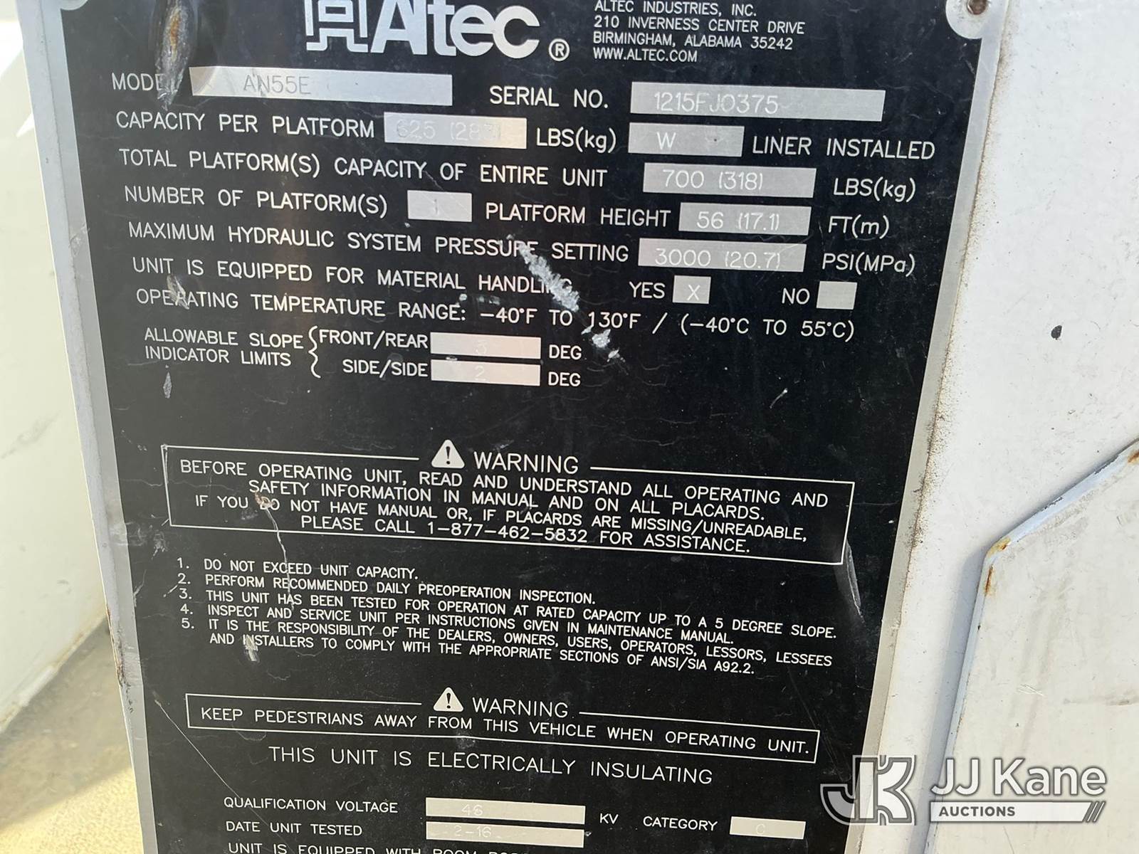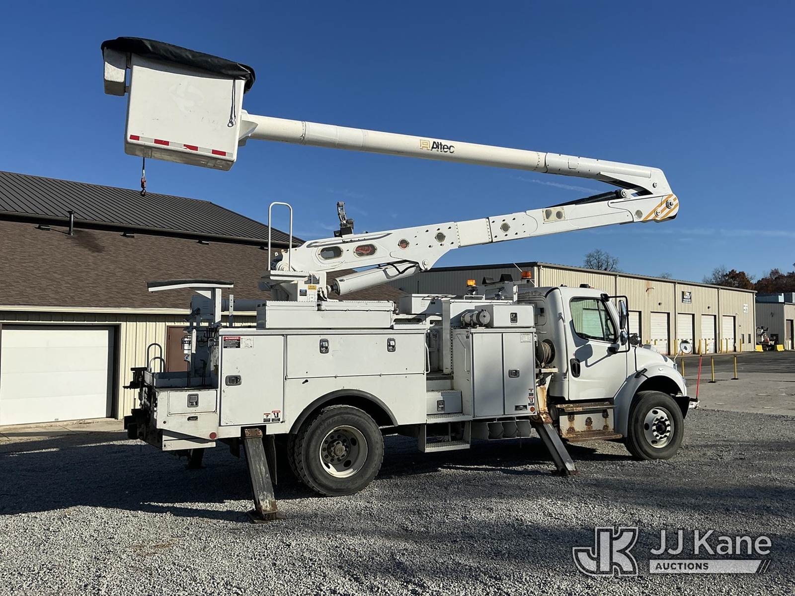 Altec AN55E, 60 ft, Articulating Material Handling Bucket Truck s/n 1215FJ0375, with two-man bucket & 4 hyd outriggers, rear mounted on 2016 Freightliner M2 106 Utility Truck, 6.7L L6, diesel Auto, 4X2, A/C, with inverter, (27,841 miles) (Runs, Moves & Upper Operates) (Hydraulic Tank Leaking, Paint Damage) (Reads 11,573 hours) This is a Titled Item NOTE: This unit is being sold AS IS/WHERE IS via Timed Auction and is located in Fort Wayne, IN. For more information & removal arrangements please contact Office Staff @ (260) 450-9822. Load out by appointment only, Buyer/Hauler must present copy of paid invoice upon arrival. Purchaser acknowledges ALL lots must be removed within (10) business days of Auction, or a storage fee may be incurred. For load out and pick up information, please reference the hauler sheet sent out after purchase. (Manuals provided in cab) (Buyer is responsible for removal. Assistance by consignor or JJ Kane Auctioneers is not assured.)