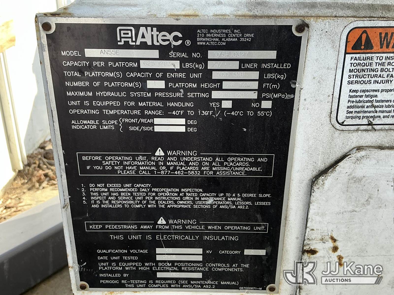 Altec AN55E, 60 ft, Articulating Material Handling Bucket Truck s/n 1015FJ0327, with two-man bucket & 4 hyd outriggers, rear mounted on 2016 Freightliner M2 106 Utility Truck, 6.7L L6 DIESEL 4X2, Auto, A/C, with inverter, (81,090 miles) (Runs, Moves & Upper Operates) (Paint Damage) (Reads 11,767 hours) This is a Titled Item NOTE: This unit is being sold AS IS/WHERE IS via Timed Auction and is located in Fort Wayne, IN. Inspection & preview days for this unit are the 2 business days prior to the first day of items closing for this auction, item is located at 3020 Commercial Rd Fort Wayne, IN 46809 and hours of operations are 8a-4p. For pre-sale questions, please contact Eric Mcintosh @ (260) 205-2483 (Manuals provided in cab) (Buyer is responsible for removal. Assistance by consignor or JJ Kane Auctions is not assured.)