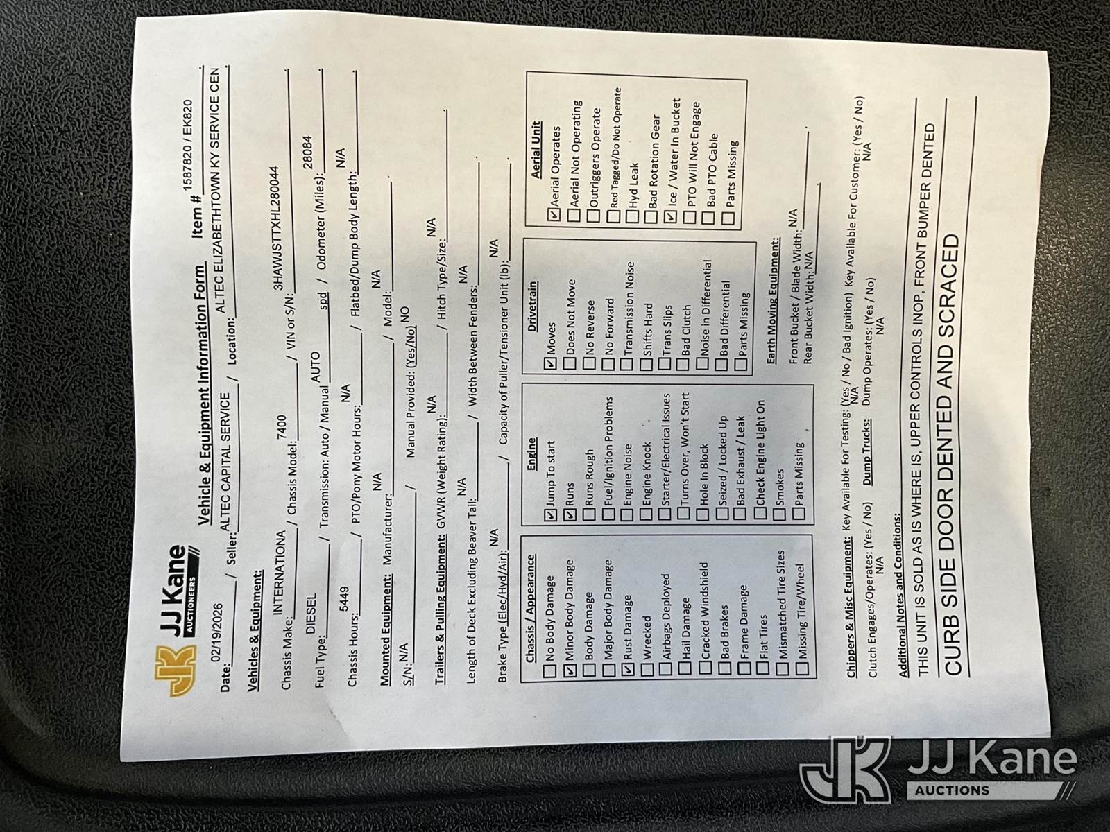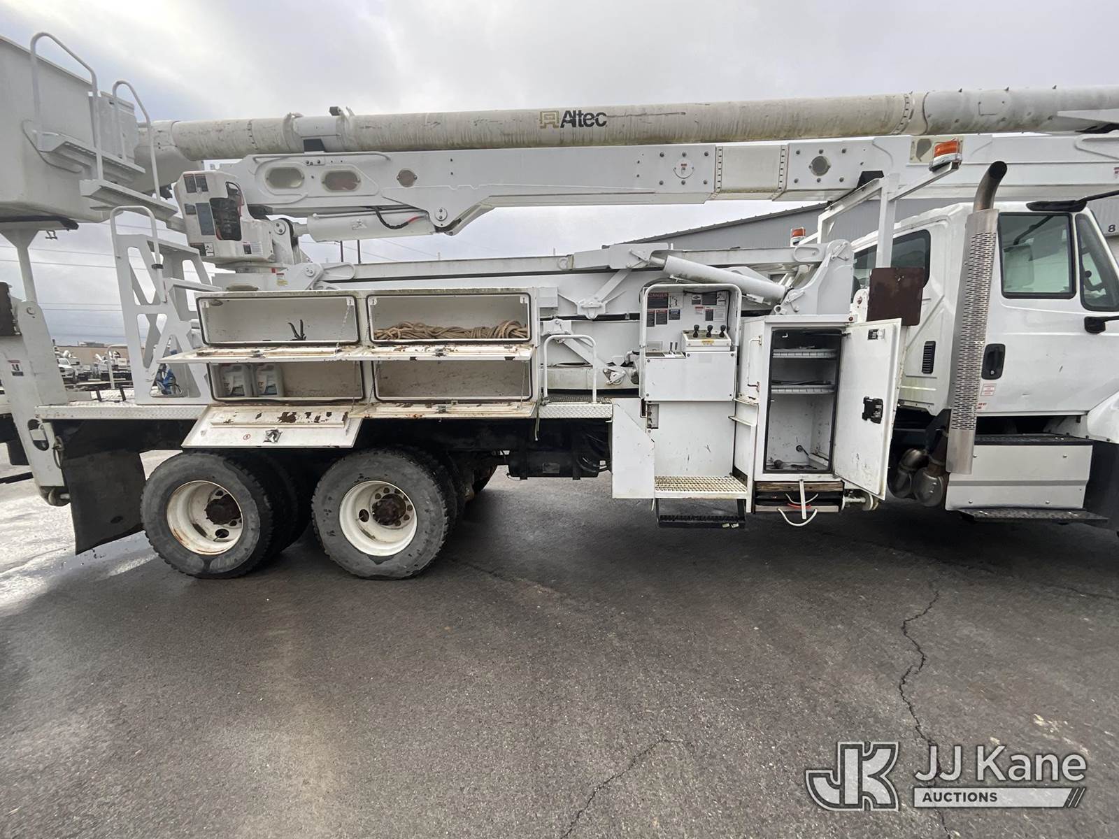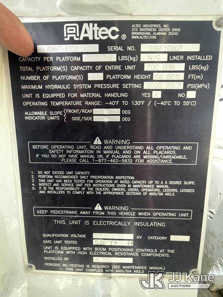 Altec AN67-E100, 105 ft, Material Handling Elevator Bucket Truck s/n 0116FY0207, with two-man bucket & 4 hyd outriggers, rear mounted on 2016 International 7400 6x6 Flatbed/Utility Truck, 9.3L diesel, Auto, (28,084 miles) (Runs, Moves & Upper Operates) (Reads 5,449 hours) This is a Titled Item NOTE: This unit is being sold AS IS/WHERE IS via Timed Auction and is located in Elizabethtown, KY. Inspection & preview days for this unit are by appointment only; please contact us at contact@jjkane.com or 84-Go-JJKane for more details. Kentucky Auctioneer Michael Whitebread - License # 256617 (Missing manuals, See Auction Company for Manufacturers Information to obtain manuals) (Buyer is responsible for removal. Assistance by consignor or JJ Kane Auctions is not assured.)