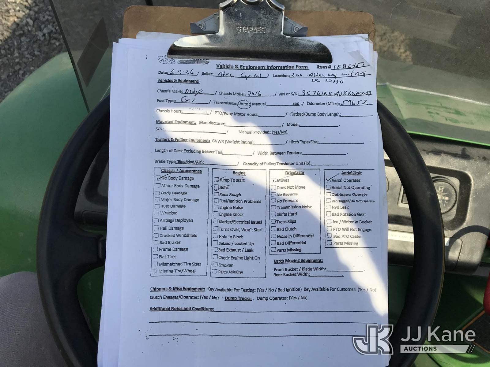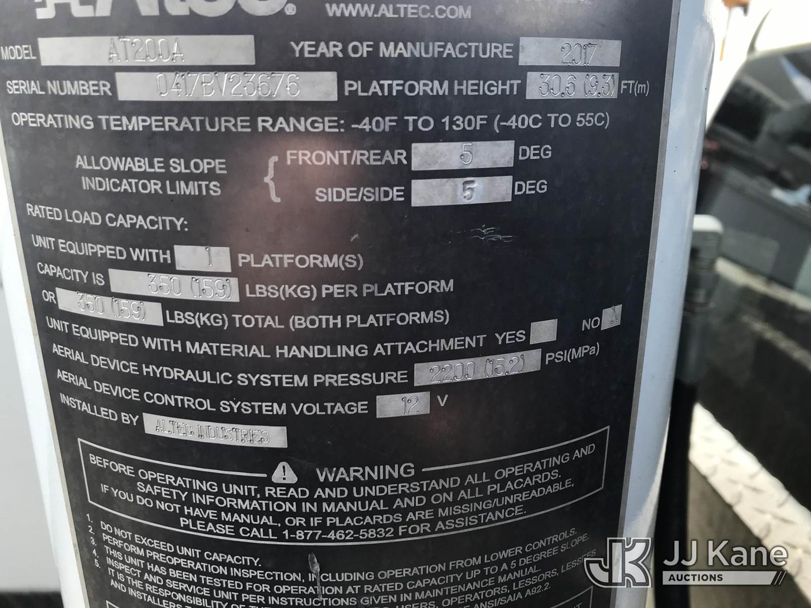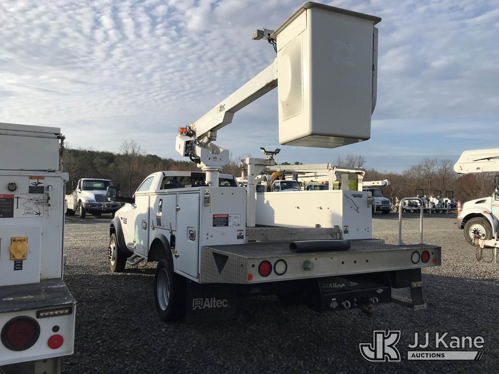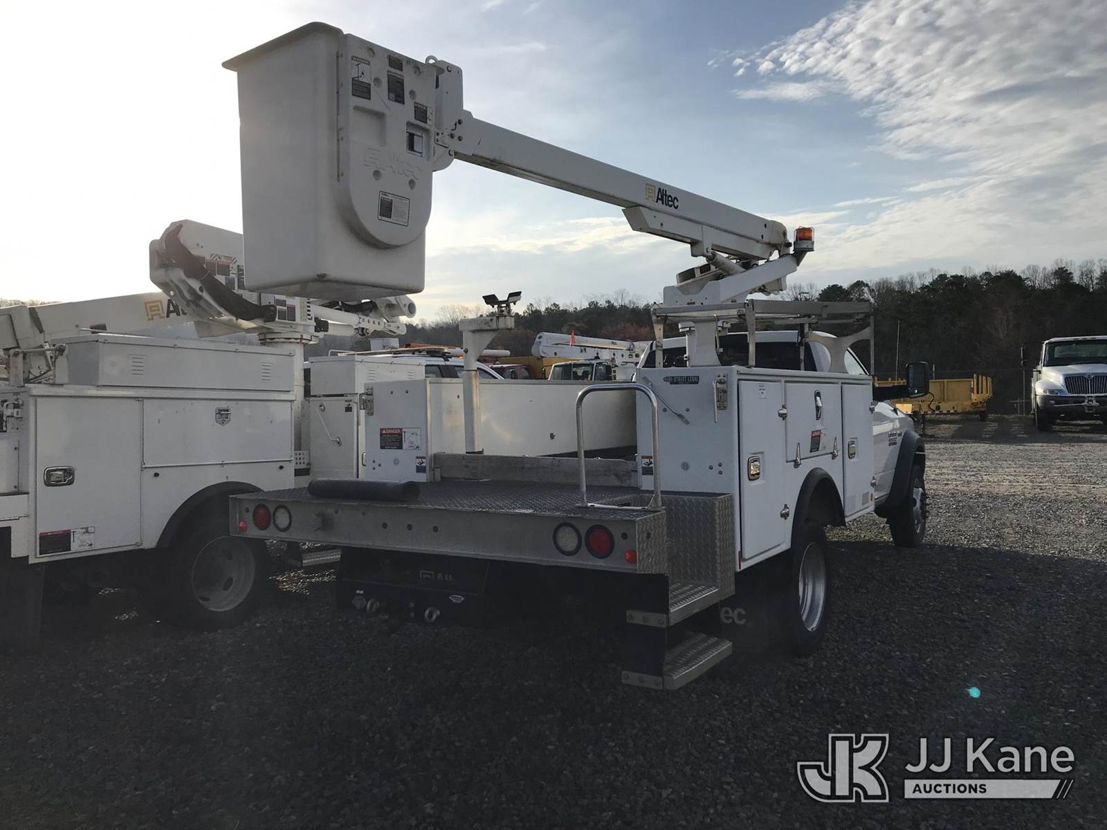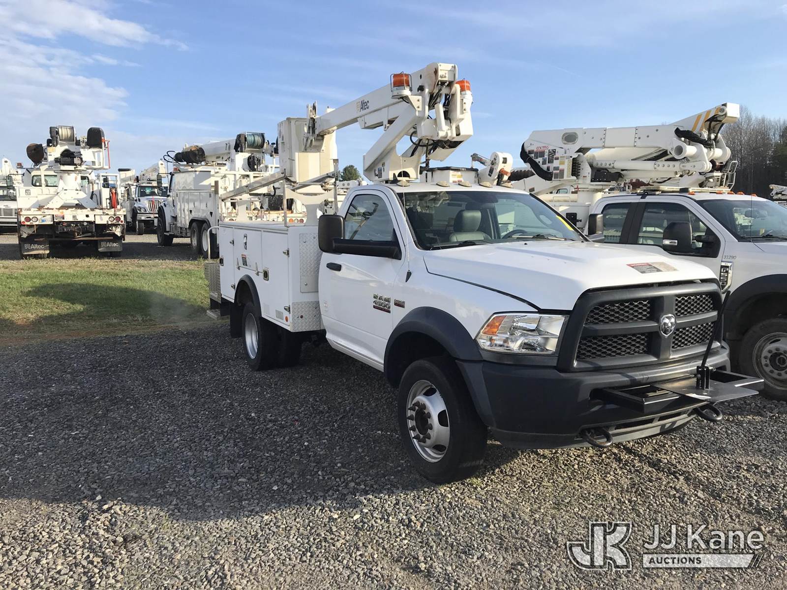 Altec AT200A, 35 ft, Telescopic Non-Insulated Bucket Truck s/n 0417BV23676, with single man bucket, mounted behind cab on 2016 RAM 4500 Service Truck, 8-cyl gas, RWD, Auto, (59,652 miles) (Runs, Moves & Upper Operates) (Jump to Start, Check Engine Light On) This is a Titled Item NOTE: This unit is being sold AS IS/WHERE IS via Timed Auction and is located in Mount Airy, NC. Inspection & preview days for this unit are by appointment only; please contact us at contact@jjkane.com or 84-Go-JJKane for more details. (Missing manuals, See Auction Company for Manufacturers Information to obtain manuals) (Buyer is responsible for removal. Assistance by consignor or JJ Kane Auctions is not assured.)