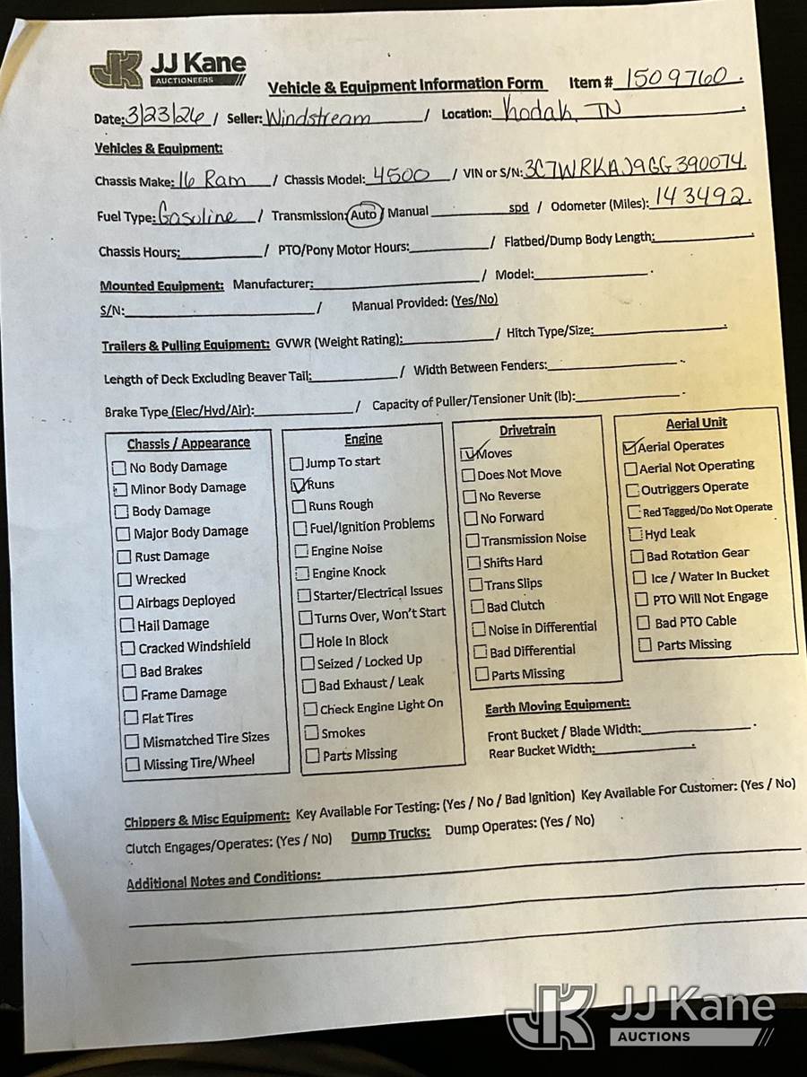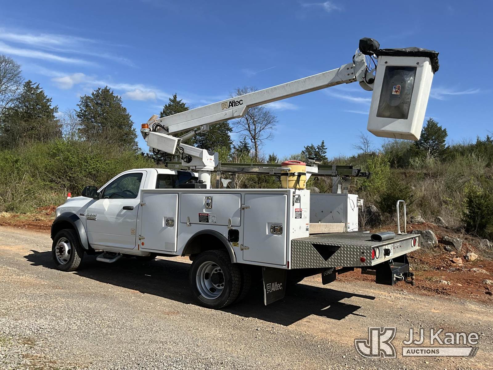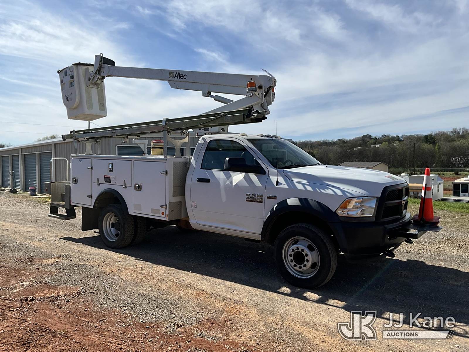 Altec AT200A, 35 ft, Telescopic Non-Insulated Bucket Truck s/n 0417BV23675, with single-man bucket, mounted behind cab on 2016 RAM 4500 Service Truck, 8-cyl gas, Auto, A/C, (143,492 miles) (Runs, Moves & Upper Operates) (Traction Control Light On) This is a Titled Item NOTE: This unit is being sold AS IS/WHERE IS via Timed Auction and is located in Kodak, TN. Inspection & preview days for this unit are by appointment only; please contact us at contact@jjkane.com or 84-Go-JJKane for more details. (Missing manuals, See Auction Company for Manufacturers Information to obtain manuals) (Buyer is responsible for removal. Assistance by consignor or JJ Kane Auctions is not assured.)