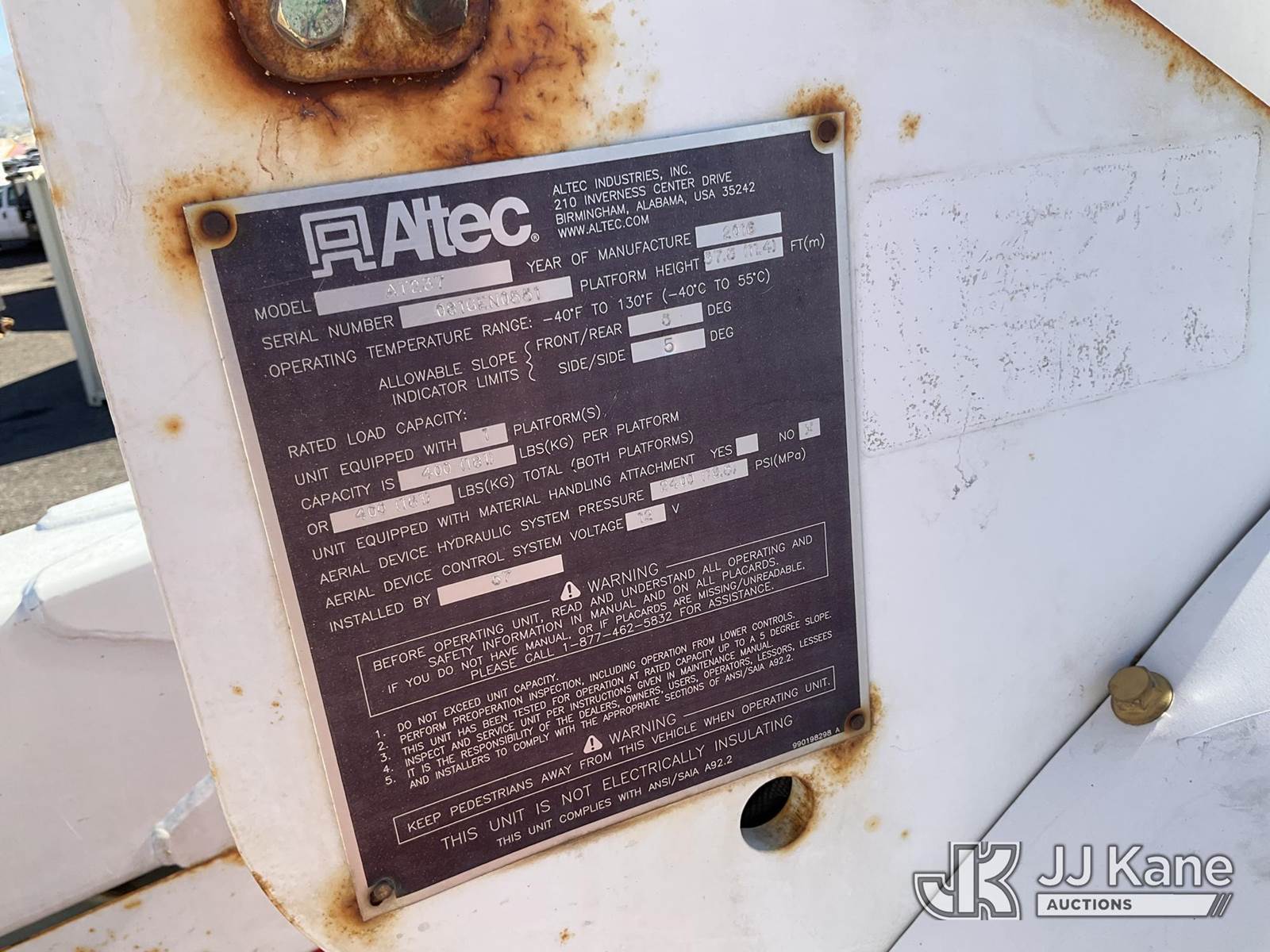 Altec AT237, 43 ft, Articulating & Telescopic Non-Insulated Bucket Truck s/n 0816EN0551, with single-man bucket, mounted behind cab on 2016 RAM 5500 Service Truck, 6.7L diesel, Auto, A/C, (193,292 miles) (Runs, Moves & Upper Operates) This is a Titled Item NOTE: This unit is being sold AS IS/WHERE IS via Timed Auction and is located in Salt Lake City, UT. Inspection & preview days for this unit are the 2 business days prior to the first day of items closing for this auction, item is located at 2353 N Redwood Rd Salt Lake City, UT 84116 and hours of operations are 8a-4p. Titles executed exactly as bidder registered. Ensure your name and/or business name and address in JJ Kane and/or ProxiBid is correct before bidding. For pre-sale questions, please contact Office Staff @ (801) 519-0123. (Manuals provided in cab) (Buyer is responsible for removal. Assistance by consignor or JJ Kane Auctions is not assured.)