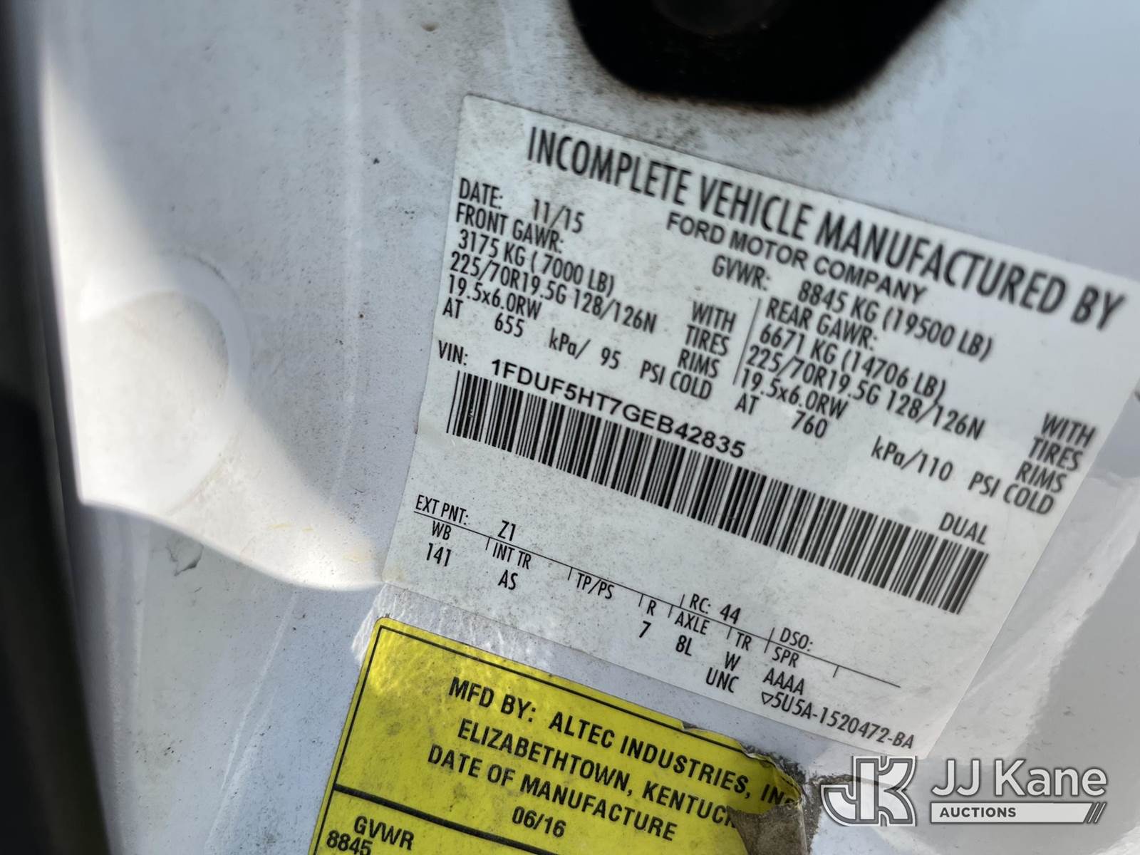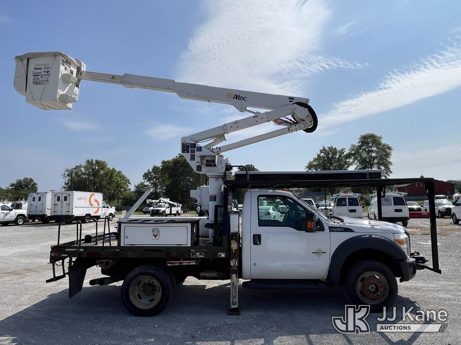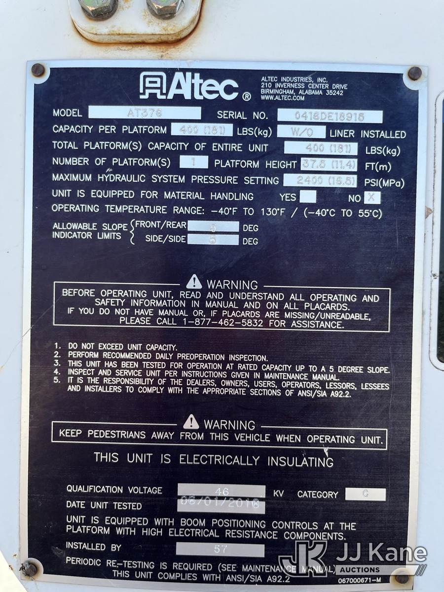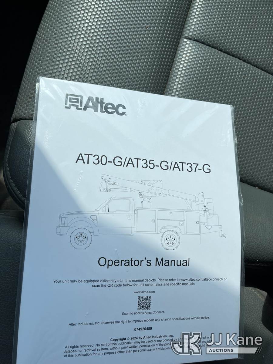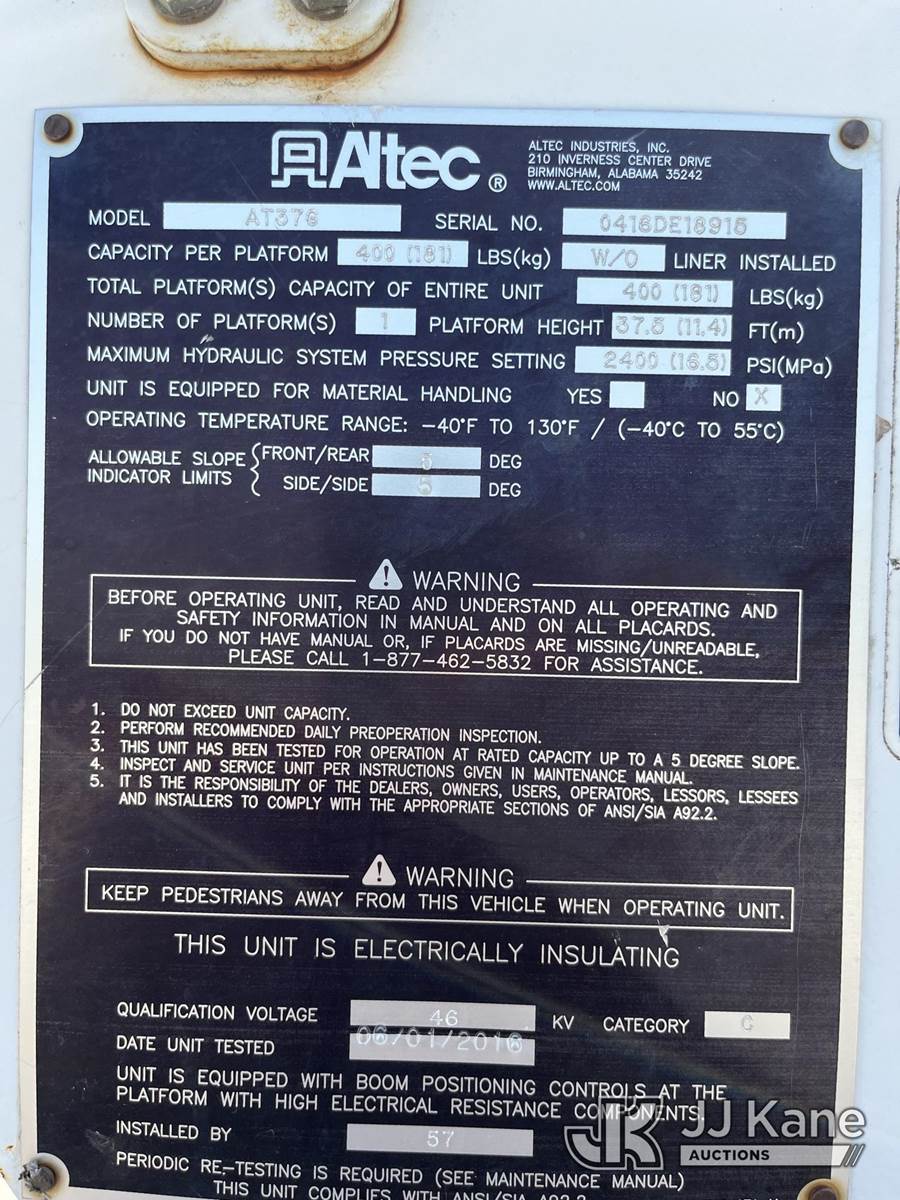 Altec AT37G, 42 ft, Articulating & Telescopic Bucket Truck s/n 0416DE18915, with single-man bucket, mounted behind cab on 2016 Ford F550 4x4 Flatbed Truck, 6.7L diesel, Auto, A/C, with front winch, (58,820 miles) (Runs, Moves, & Upper Operates) (Jump To Start, Rough Idle) (Seller States: Electrical Issues, Rust Damage) This is a Titled Item NOTE: This unit is being sold AS IS/WHERE IS via Timed Auction and is located in Hawk Point, MO. Inspection & preview days for this unit are the 2 business days prior to the first day of items closing for this auction, item is located at 25 State Highway A Hawk Point, MO 63349 and hours of operations are 8a-4p. For pre-sale questions, please contact Adam Stanek at (636) 295-1594. (Manuals provided in cab) (Buyer is responsible for removal. Assistance by consignor or JJ Kane Auctioneers is not assured.)