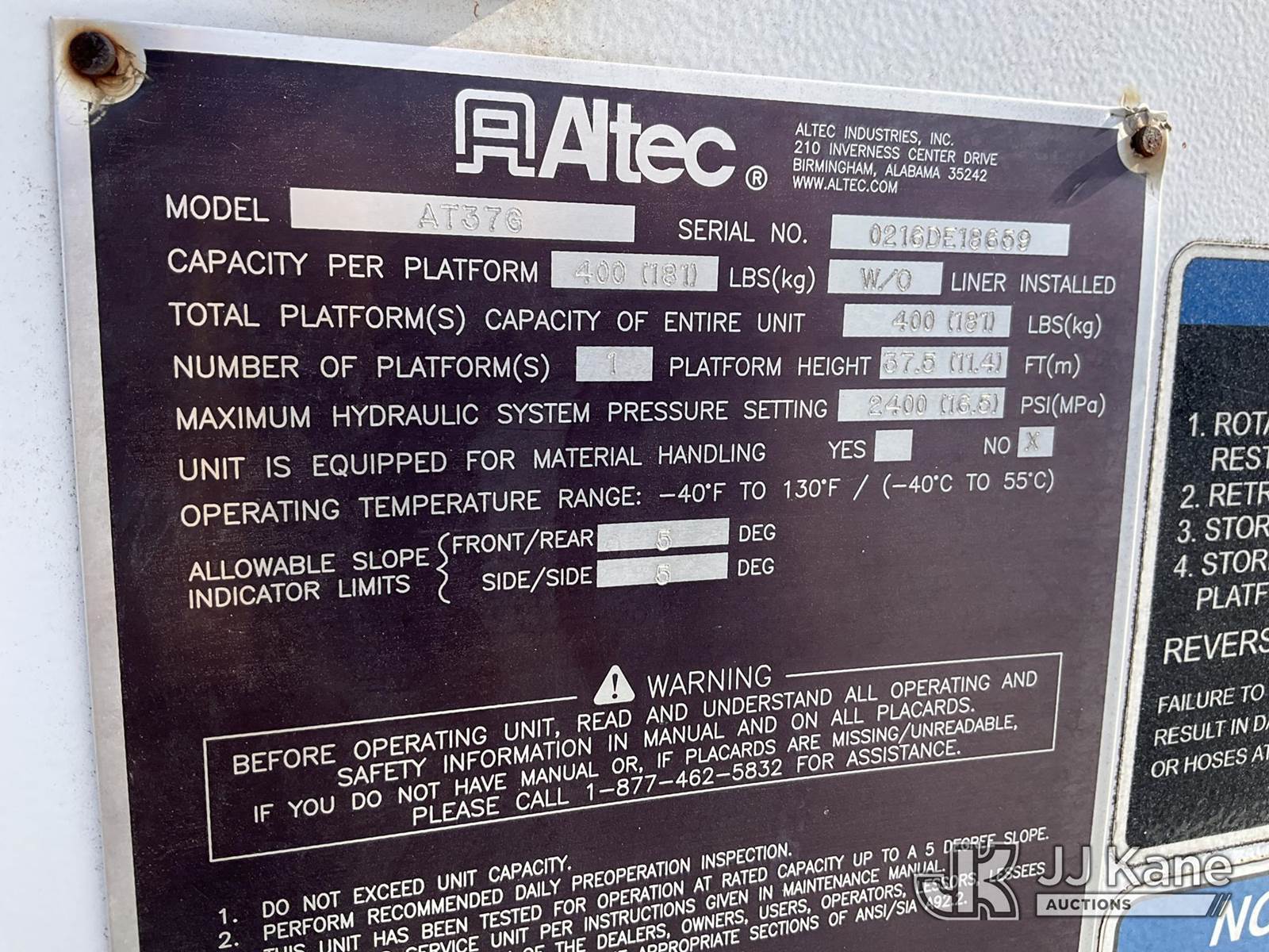 Altec AT37G, 42 ft, Articulating & Telescopic Bucket Truck s/n 0216DE18659, with single-man bucket, mounted behind cab on 2016 RAM 5500 4x4 Service Truck, 6.7L diesel, Auto, A/C, (65,208 miles) (Runs, Moves & Upper Operates) (Check Engine Light On, Cracked Windshield) This is a Titled Item NOTE: This unit is being sold AS IS/WHERE IS via Timed Auction and is located in China Grove, NC. Inspection & preview days for this unit are the 2 business days prior to the first day of items closing for this auction, item is located at 820 E NC Hwy 152 China Grove, NC 28023 and hours of operations are 8a-4p. For pre-sale questions, please contact Office Staff @ (704) 674-1113. (Manuals provided in cab) (Buyer is responsible for removal. Assistance by consignor or JJ Kane Auctions is not assured.)