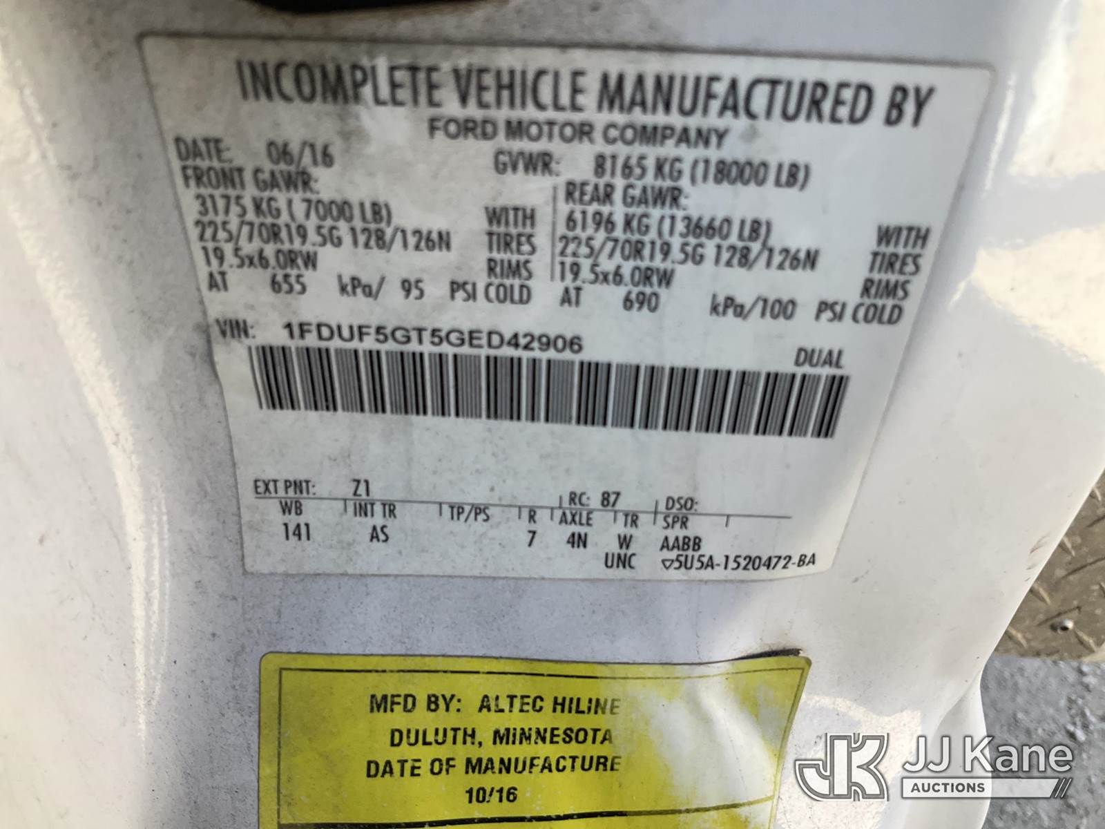 Altec AT37G, 42 ft, Articulating & Telescopic Bucket Truck s/n 0716DE19358, with single man bucket, mounted behind cab on 2016 Ford F-550 Service Truck, 6.7L diesel, RWD, Auto, A/C, (145,450 miles) (Runs, Moves & Upper Operates) This is a Titled Item NOTE: This unit is being sold AS IS/WHERE IS via Timed Auction and is located in Waxahachie, TX. Inspection & preview days for this unit are the 2 business days prior to the first day of items closing for this auction, item is located at 999 Solon Rd Waxahachie, TX 75165 and hours of operations are 8a-4p. For pre-sale questions, please contact Alex Bayless @ (469) 550-4938. (Manuals provided in cab) (Buyer is responsible for removal. Assistance by consignor or JJ Kane Auctions is not assured.)