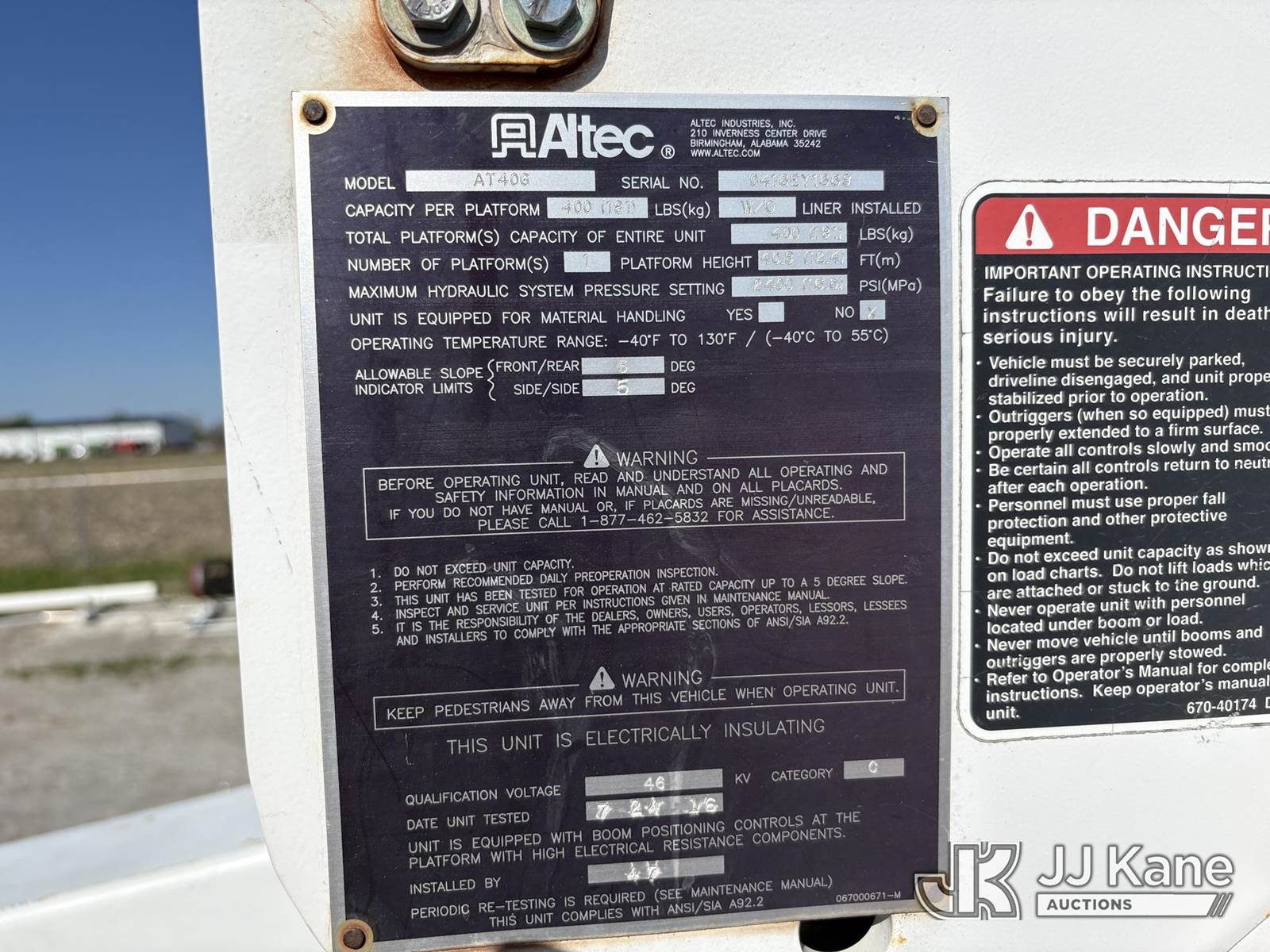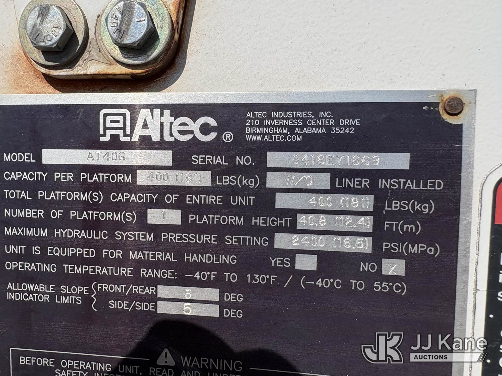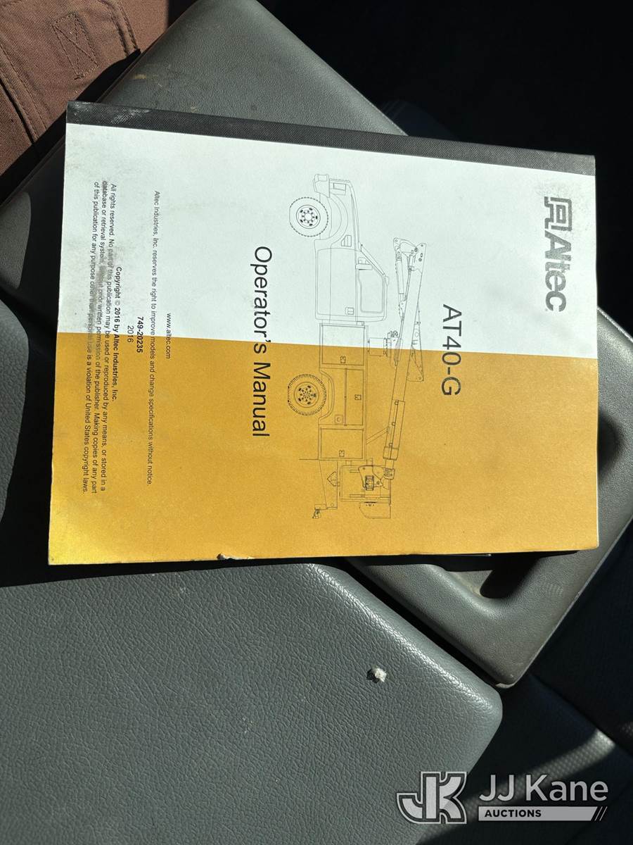 Altec AT40G, 45 ft, Articulating & Telescopic Bucket s/n 0416EY1669, with Single-Man Bucket, mounted behind cab on 2016 Ford F-550 Utility Truck, s/n 1FD0X5HT3GEC55015, 6.7L Diesel 4WD, Auto, A/C, (164,290 miles) ((Runs, Moves & Upper Operates) (Dash Warning Indicators On, Miscellaneous Defects).) (Reads 11,436 hours) This is a Titled Item NOTE: This unit is being sold AS IS/WHERE IS via Timed Auction and is located in Hawk Point, MO. Inspection & preview days for this unit are the 2 business days prior to the first day of items closing for this auction, item is located at 25 State Highway A Hawk Point, MO 63349 and hours of operations are 8a-4p. For pre-sale questions, please contact Adam Stanek at (636) 295-1594. (Manuals provided in cab) (Buyer is responsible for removal. Assistance by consignor or JJ Kane Auctions is not assured.)