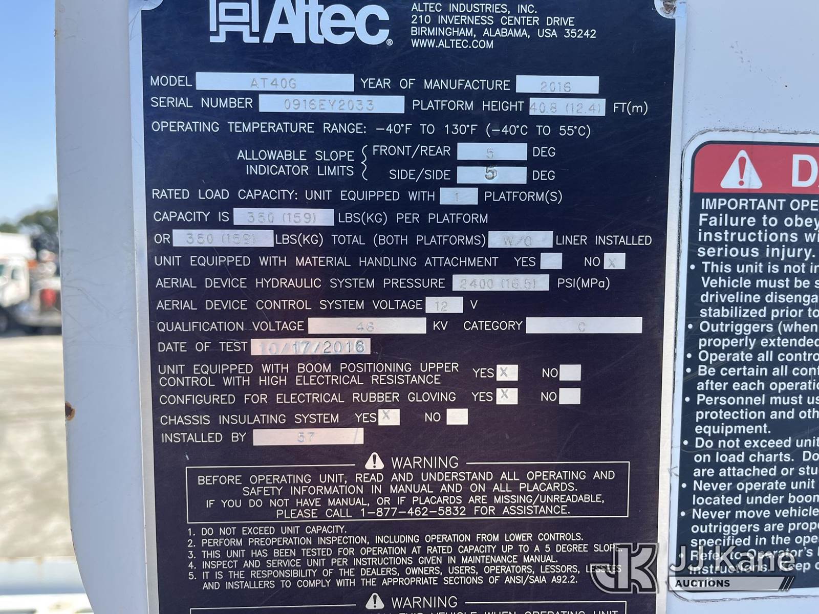 Altec AT40G, 45 ft, Articulating & Telescopic Bucket Truck s/n 0916EY2033, with single man bucket, mounted behind cab on 2016 RAM 5500 4x4 Service Truck, Cummins 6.7L diesel, Auto, A/C, (94,777 miles) (Runs, Moves, & Upper Operates) (TITLE DELAY) (Reads 16,866 hours) This is a Titled Item NOTE: This unit is being sold AS IS/WHERE IS via Timed Auction and is located in Chester, VA. Inspection & preview days for this unit are the 2 business days prior to the first day of items closing for this auction, item is located at 13301 Great Coastal Dr., Chester, VA 23836 and hours of operations are 7a-3p. For more information & removal arrangements please contact Zach Geller @ 804-807-4574. Buyer/Hauler must present copy of the Release Form upon arrival. Purchaser acknowledges ALL lots must be removed within 10 business days of auction, or a storage fee may be incurred. (Missing manuals, See Auction Company for Manufacturers Information to obtain manuals) Sales Tax Collected Based on Residency Title To Come From Leasing Company In 30 Days(Buyer is responsible for removal. Assistance by consignor or JJ Kane Auctioneers is not assured.)