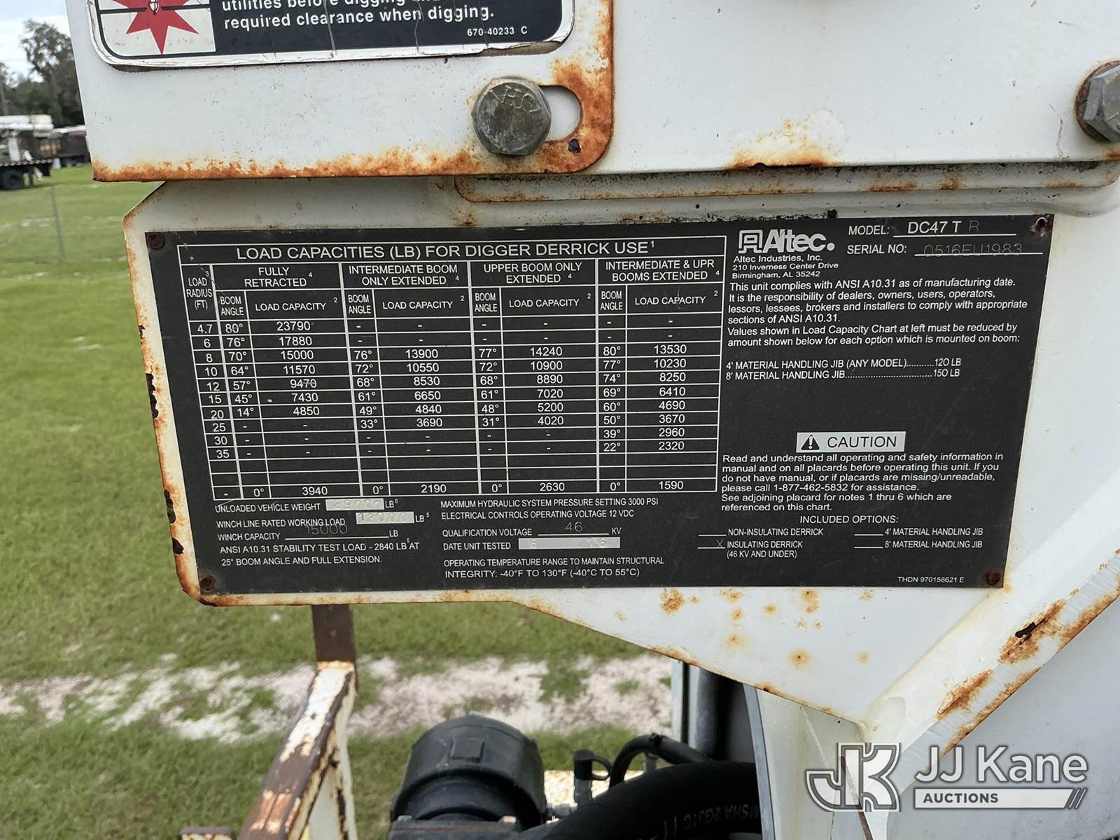Altec DC47-TR, 23,790 Lb Digger Derrick s/n 0516EU1983, with 47ft sheave height, 2spd digger, heel winch, pole grabs & riding console, rear mounted on 2016 International 7300 4x4 Utility Truck, Cummins ISB 6.7L diesel, Auto, A/C, with front winch, (101,813 miles) (Runs, Moves & Upper Operates) (Check Engine Light On, Rust Damage) (FL Residents Purchasing Titled Items - tax, title & registration fees will be collected at the maximum rate of $400.00 under 25,999 and $800.00 for Over 26,000 and $250.00 trailers - Proof of insurance is mandatory; Out of State Residents Purchasing Title Items - tax will be collected based upon your state rate.) (Reads 11,715 hours) This is a Titled Item NOTE: This unit is being sold AS IS/WHERE IS via Timed Auction and is located in Thonotosassa, FL. Inspection & preview days for this unit are the 2 business days prior to the first day of items closing for this auction, item is located at 11720 N US 301 Thonotosassa, Fl 33592 and hours of operations are 8a-4p. For pre-sale questions, please contact Office Staff @ (813) 986-2485. (Manuals provided in cab) (Buyer is responsible for removal. Assistance by consignor or JJ Kane Auctioneers is not assured.)