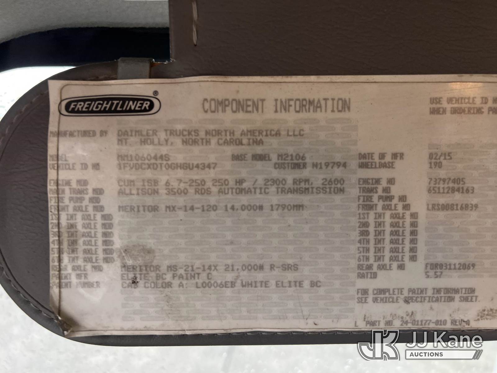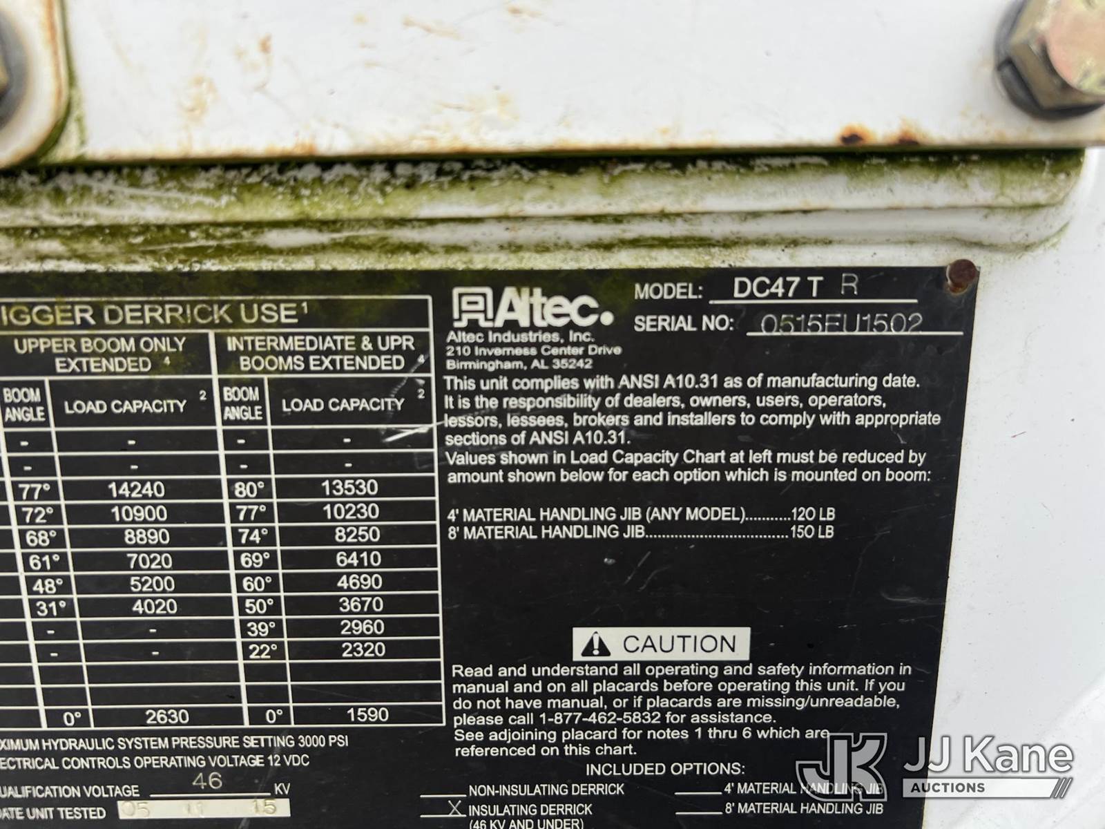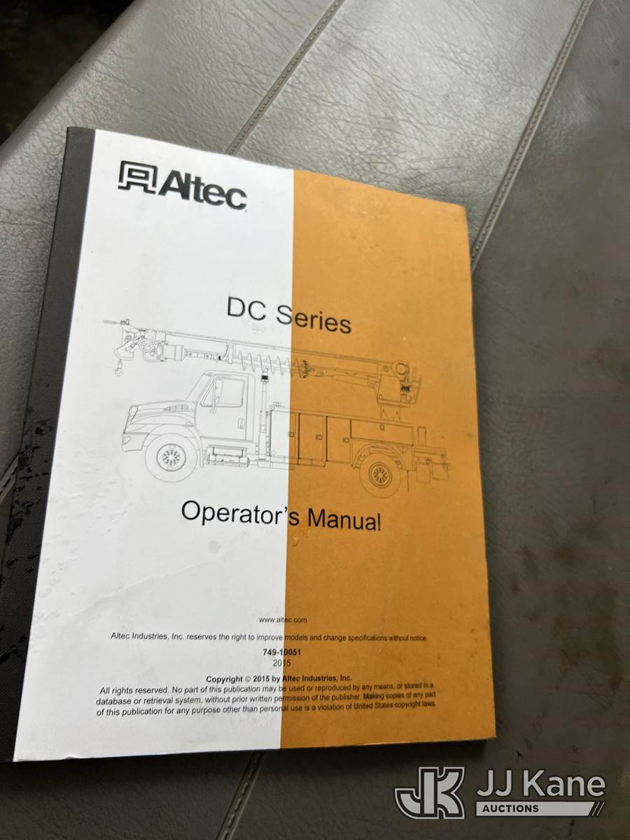 Altec DC47-TR, 23,790 Lb Digger Derrick s/n 0515EU1502, with 47 ft sheave height, 3 section hyd boom, 2-spd digger, heel winch, pole guides, riding console & 4 hyd outriggers, rear mounted on 2016 Freightliner M2 106 4x4 Utility Truck, Cummins ISB 6.7L, diesel, Auto, A/C, with front winch, (82,470 miles) (Runs, Moves & Upper Operates) (Body/Rust Damage ) This is a Titled Item NOTE: This unit is being sold AS IS/WHERE IS via Timed Auction and is located in Chattanooga, TN. For more information & removal arrangements please contact Dylan Evans @ 205-936-1094. (Manuals provided in cab) (Buyer is responsible for removal. Assistance by consignor or JJ Kane Auctions is not assured.)