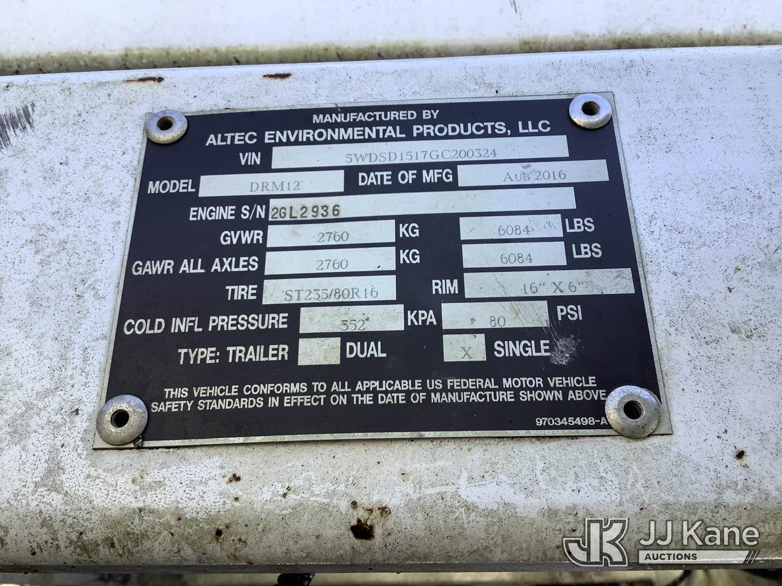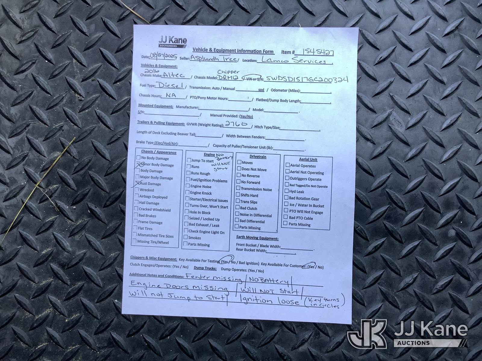 2016 Altec DRM12 Chipper (12in Drum), Kubota diesel, trailer mtd. (Not Running, No Battery, Bad Ignition, Fender Missing, Condition Unknown) (Hydraulic Issues, Fuel Pump Issues) This is a Titled Item NOTE: This unit is being sold AS IS/WHERE IS via Timed Auction and is located in Graysville, AL. Inspection & preview days for this unit are by appointment only; please contact us at contact@jjkane.com or 84-Go-JJKane for more details. Alabama Auctioneer Michael Whitebread - License # 5592 (Buyer is responsible for removal. Assistance by consignor or JJ Kane Auctioneers is not assured.)