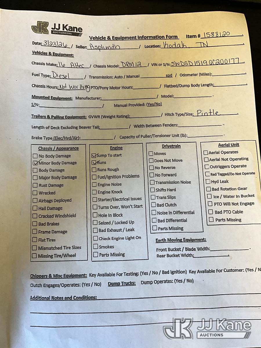 2016 Altec Environmental Products DRM12 Chipper (12in Drum), diesel, trailer mtd. (Runs, Jump To Start) (Seller States: Ignition & Battery Box Needed) This is a Titled Item NOTE: This unit is being sold AS IS/WHERE IS via Timed Auction and is located in Kodak, TN. Inspection & preview days for this unit are by appointment only; please contact us at contact@jjkane.com or 84-Go-JJKane for more details. (Buyer is responsible for removal. Assistance by consignor or JJ Kane Auctions is not assured.)