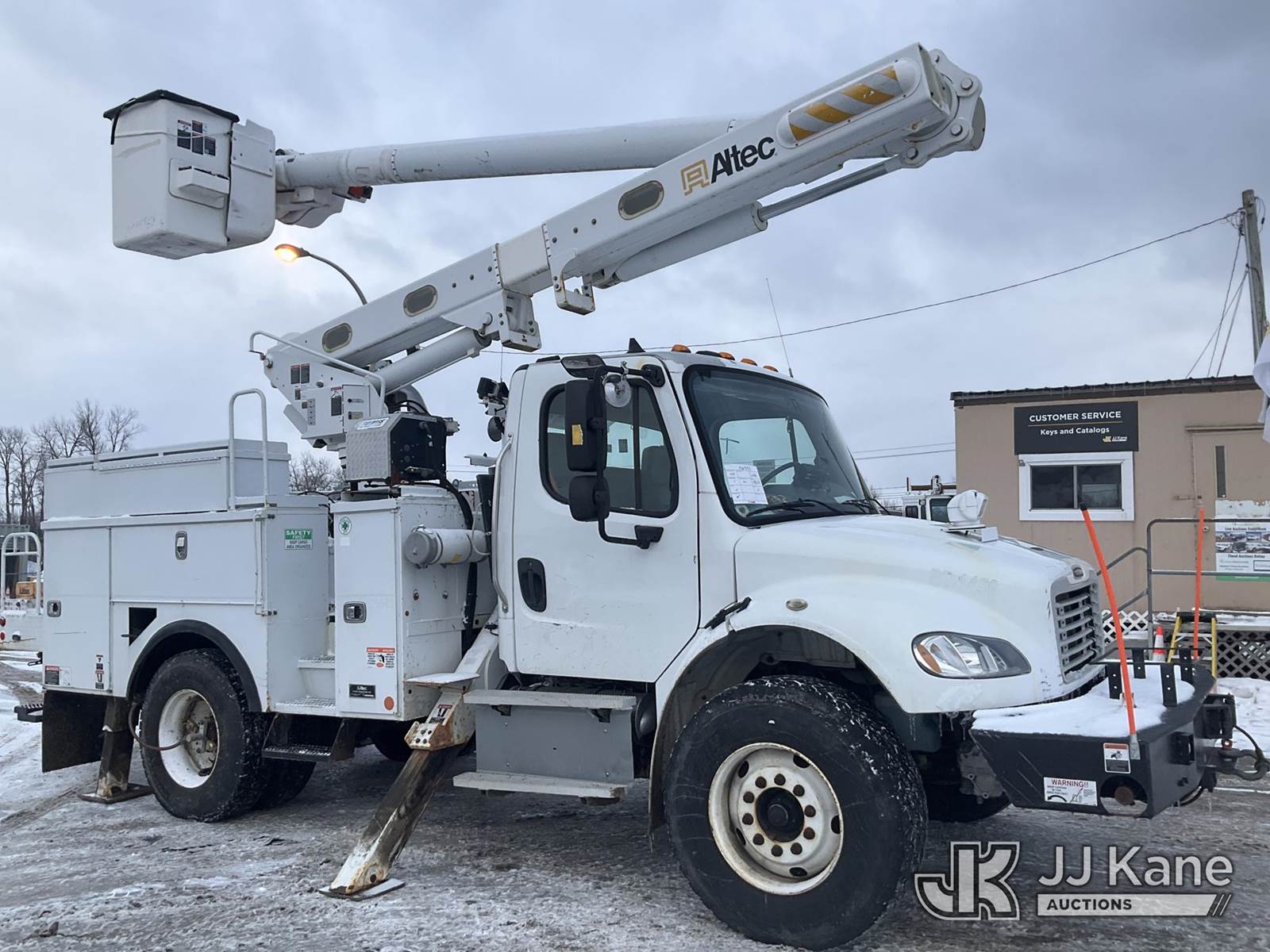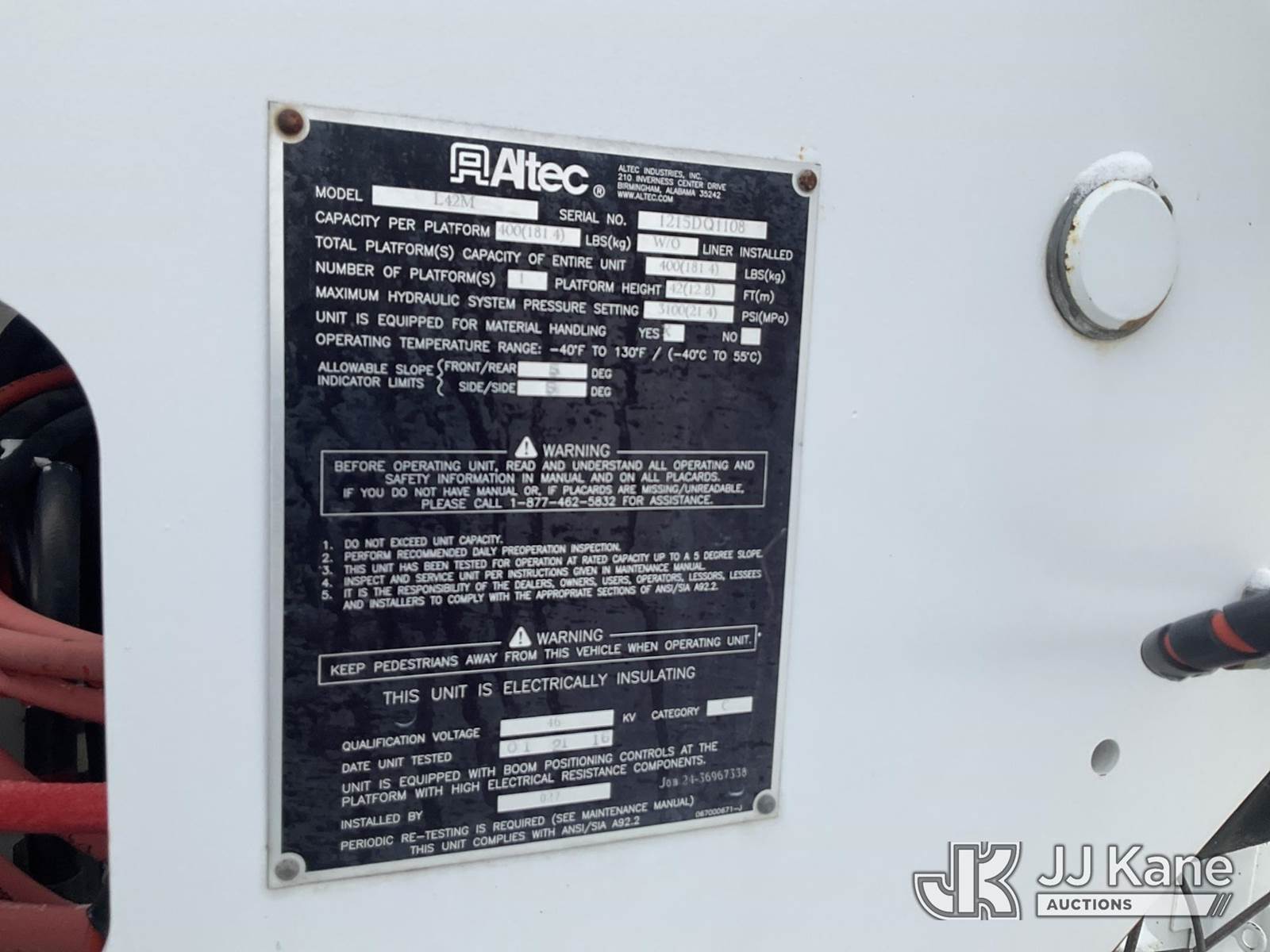 Altec L42M, 47 ft, Over-Center Material Handling Bucket s/n 1215DQ1108, with Single-Man Bucket & 4 Outriggers, center mounted on 2016 Freightliner M2 106 Utility Truck, 6.7L Auto, diesel, A/C, with Front Winch, (148,232 miles) (Runs, Moves & Upper Operates, Body & Rust Damage ) This is a Titled Item NOTE: This unit is being sold AS IS/WHERE IS via Timed Auction and is located in Rome, NY. Inspection & preview days for this unit are the 2 business days prior to the first day of items closing for this auction, item is located at 5835 Success Dr Rome, NY 13440 and hours of operations are 8a-4p. For pre-sale questions, please contact Ryan Jackson @ (315) 749-3790 or Ryan.Jackson@jjkane.com. (Missing manuals, See Auction Company for Manufacturers Information to obtain manuals) (Buyer is responsible for removal. Assistance by consignor or JJ Kane Auctions is not assured.)