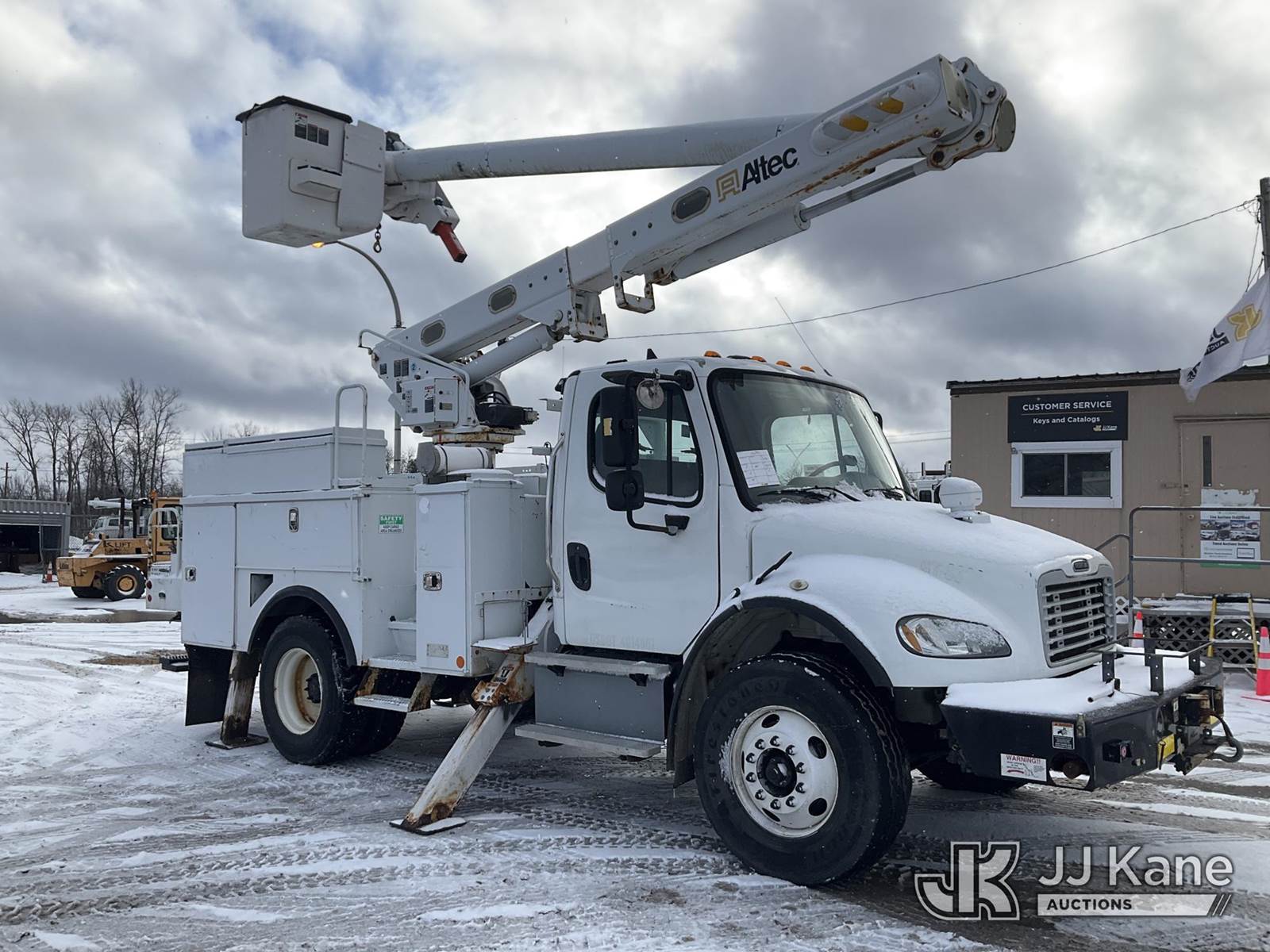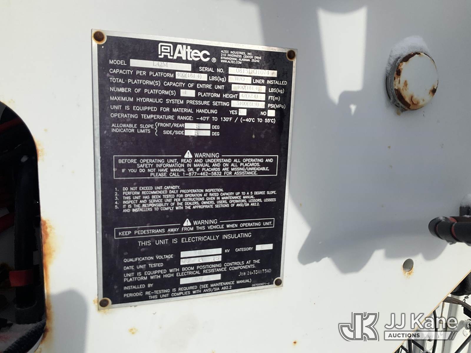 Altec L42M, 47 ft, Over-Center Material Handling Bucket Truck s/n 0815DQ1074, with Single-Man Bucket & 4 Outriggers, center mounted on 2016 Freightliner M2 106 Utility Truck, 6.7L Auto, diesel, A/C, with Front Winch, (134,142 miles) (Runs, Moves & Upper Operates, Check Engine & ABS Light On, Engine Noise, Body & Rust Damage ) (Reads 6,373 hours) This is a Titled Item NOTE: This unit is being sold AS IS/WHERE IS via Timed Auction and is located in Rome, NY. Inspection & preview days for this unit are the 2 business days prior to the first day of items closing for this auction, item is located at 5835 Success Dr Rome, NY 13440 and hours of operations are 8a-4p. For pre-sale questions, please contact Ryan Jackson @ (315) 749-3790 or Ryan.Jackson@jjkane.com. (Missing manuals, See Auction Company for Manufacturers Information to obtain manuals) (Buyer is responsible for removal. Assistance by consignor or JJ Kane Auctions is not assured.)