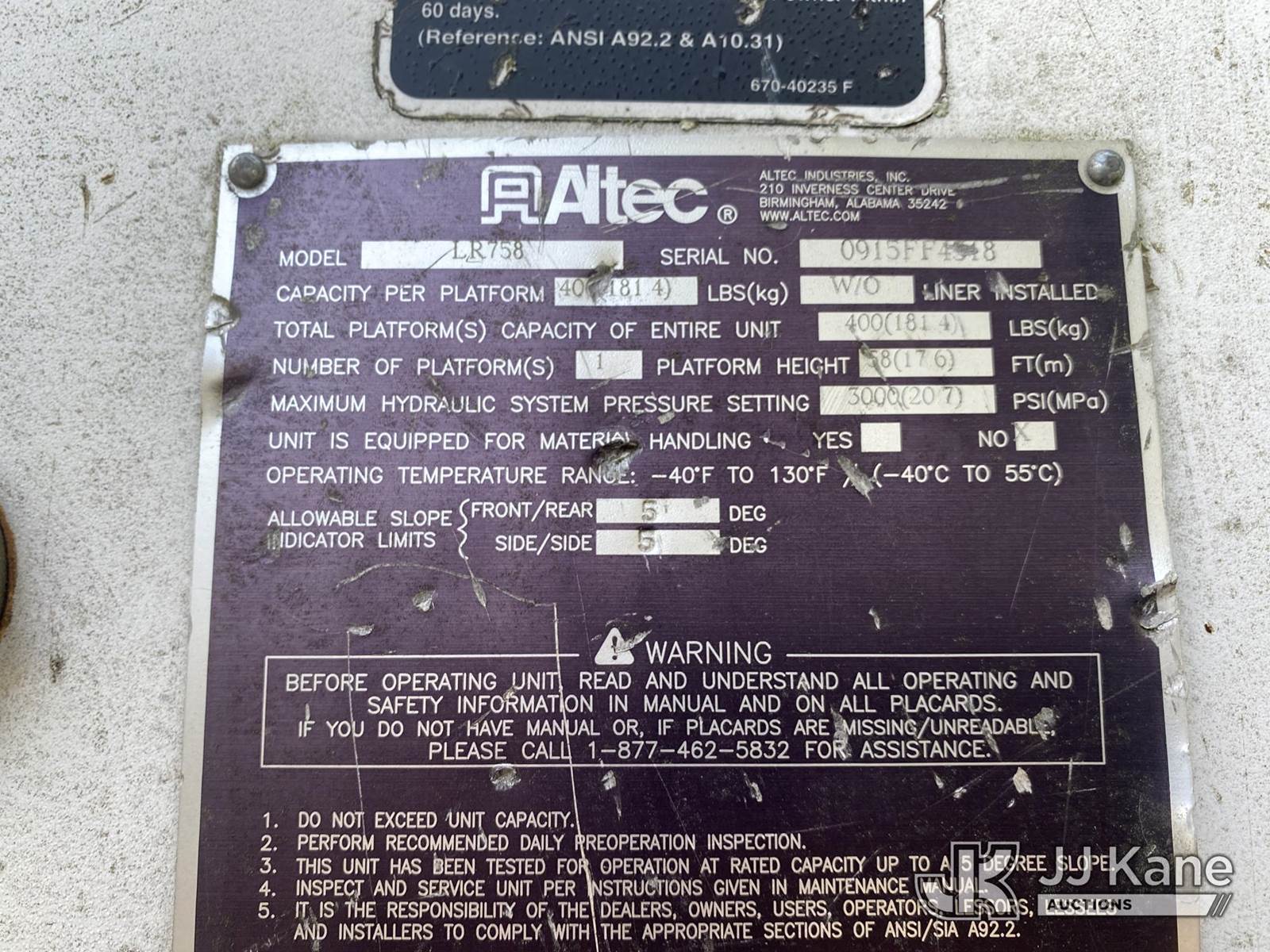 Altec LR758, 63 ft, Over-Center Bucket Truck s/n 0915FF4518, with single-man bucket & 4 hyd outriggers, rear mounted on 2016 Freightliner M2 106 Flatbed Truck, 6.7L L6 diesel, Auto, 4X2, True Mileage Unknown (Not Running, Condition Unknown, Disassembled Engine, Missing Parts, No Key, Body/ Paint Damage ) This is a Titled Item NOTE: This unit is being sold AS IS/WHERE IS via Timed Auction and is located in Villa Rica, GA. Inspection & preview days for this unit are the 2 business days prior to the first day of items closing for this auction, item is located at 100 Liberty Rd Villa Rica, GA 30180 and hours of operations are 8a-4p. For pre-sale questions, please contact Office Staff @ (470) 590-8453. (Missing manuals, See Auction Company for Manufacturers Information to obtain manuals) (Buyer is responsible for removal. Assistance by consignor or JJ Kane Auctions is not assured.)