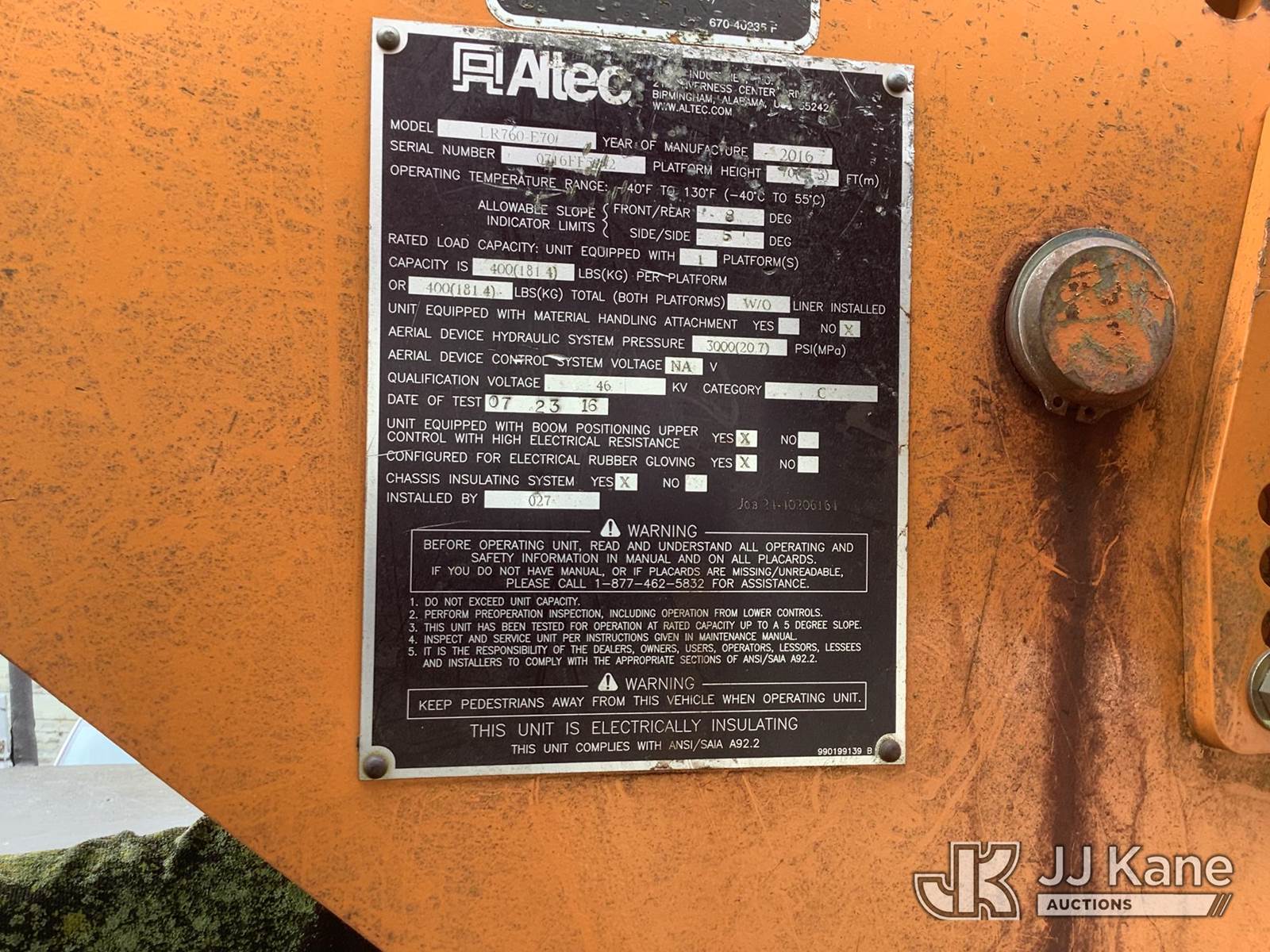 Altec LR760-E70, 400 Lb 75 ft, Elevator Bucket Truck s/n 0716FF5242, with Single Man Bucket, mounted on 2016 Freightliner M2 106 Chipper Dump Truck, 6.7L L6 Diesel, 6-spd, A/C, (86,150 miles) (Runs & Moves, Outriggers Operate, Dump Operates, Upper Not Operating & Conditions Unknown, ABS Light On, Seller States: Needs Turbo Replaced & Engine Serviced) (Removal is by Appointment Only, Buyer MUST make a appointment prior to picking up, Buyer/Transporter Must have PAID IN FULL RELEASE. No onsite assistance available, Please Come prepared.) (Reads 15,893 hours) This is a Titled Item NOTE: This unit is being sold AS IS/WHERE IS via Timed Auction and is located in Harmans, MD. Inspection & preview days for this unit are by appointment only; please contact us at contact@jjkane.com or 84-Go-JJKane for more details. For pre-sale questions, please contact the on-site office @ (443) 557-0025 or Kevin.Waggoner@JJKane.com. (Missing manuals, See Auction Company for Manufacturers Information to obtain manuals) (Buyer is responsible for removal. Assistance by consignor or JJ Kane Auctions is not assured.)