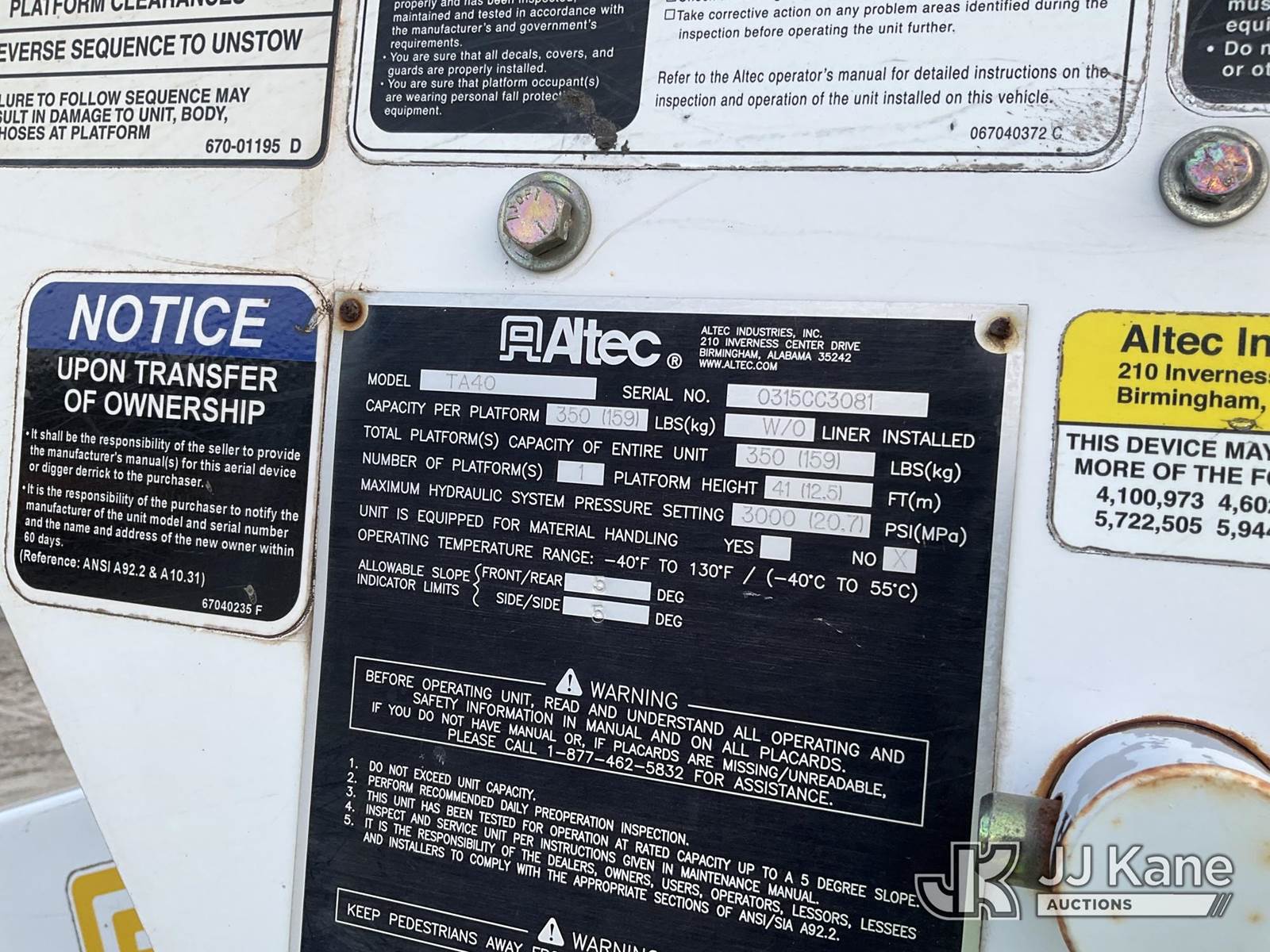 Altec TA40, 45 ft, Articulating & Telescopic Bucket Truck s/n 0315CC3081, with single-man bucket, mounted behind cab on 2016 Freightliner M2 106 Utility Truck, Cummins 6.7L diesel, Auto, A/C, (165,516 miles) (Runs, Moves, & Upper Operates) ( Jump To Start, Check Engine Lights On) (TITLE DELAY) This is a Titled Item NOTE: This unit is being sold AS IS/WHERE IS via Timed Auction and is located in Chester, VA. Inspection & preview days for this unit are the 2 business days prior to the first day of items closing for this auction, item is located at 13301 Great Coastal Dr Chester, VA 23836 and hours of operations are 8a-3p. For pre-sale questions, please contact Doug Caton @ 804-807-4574. (Missing manuals, See Auction Company for Manufacturers Information to obtain manuals) Sales Tax Collected Based on Residency Title To Come From Leasing Company In 30 Days(Buyer is responsible for removal. Assistance by consignor or JJ Kane Auctions is not assured.)