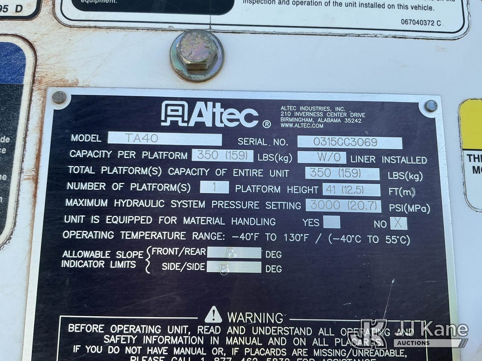 Altec TA40, 45 ft, Articulating & Telescopic Bucket Truck s/n 0315CC3069, with single-man bucket , mounted behind cab on 2016 Freightliner M2 106 Utility Truck, Cummins ISB 6.7L diesel, Auto, A/C, (129,140 miles) (Runs, Moves & Upper Operates) (TITLE DELAY) This is a Titled Item NOTE: This unit is being sold AS IS/WHERE IS via Timed Auction and is located in China Grove, NC. Inspection & preview days for this unit are the 2 business days prior to the first day of items closing for this auction, item is located at 820 E NC Hwy 152 China Grove, NC 28023 and hours of operations are 8a-4p. For pre-sale questions, please contact Office Staff @ (704) 674-1113. (Manuals provided in cab) Sales Tax Collected Based on Residency Title To Come From Leasing Company In 30 Days(Buyer is responsible for removal. Assistance by consignor or JJ Kane Auctions is not assured.)