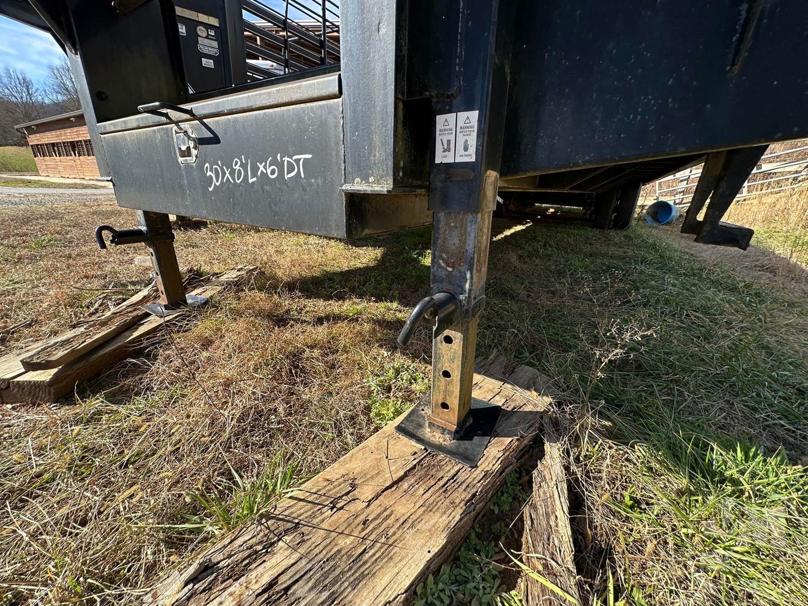 30' FLATBED TRAILER, 8' WIDE, 2 AXLE, SPREAD AXLE, SPRING SUSPENSION, WOOD DECKING, GOOSENECK HITCH, DOVETAIL WITH RAMPS, TOOL BOX, 23900 GVWR, 6' DOVETAIL