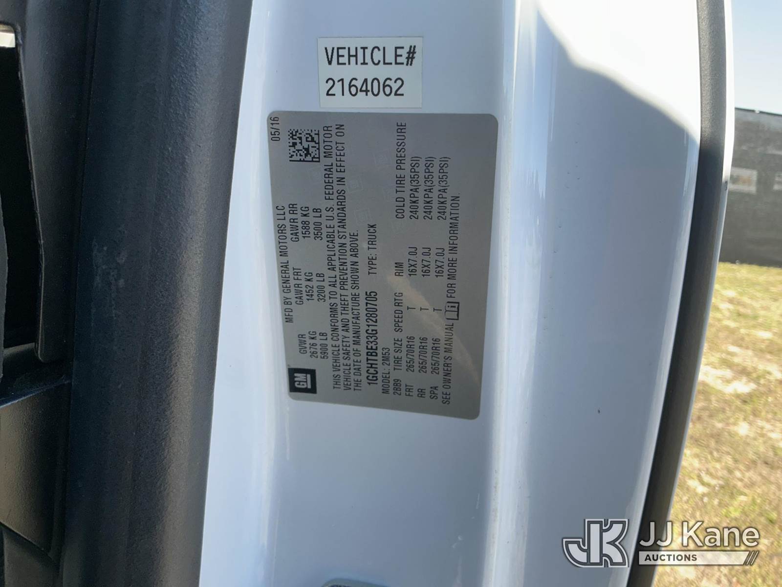 2016 Chevrolet Colorado 4x4 Extended-Cab Pickup Truck, 3.6L V6 DOHC 24V gas, 6-Speed Automatic, A/C, with bed cap, (136,020 miles) (Runs & Moves) (Camera Not Included, Key Stuck In Ignition)(FL Residents Purchasing Titled Items – tax, title & registration fees will be collected at the maximum rate of $400.00 under 25,999 and $800.00 for Over 26,000 and $250.00 trailers – Proof of insurance is mandatory; Out of State Residents Purchasing Title Items – tax will be collected based upon your state rate.) This is a Titled Item NOTE: This unit is being sold AS IS/WHERE IS via Timed Auction and is located in Thonotosassa, FL. Inspection & preview days for this unit are the 2 business days prior to the first day of items closing for this auction, item is located at 11720 N US 301 Thonotosassa, Fl 33592 and hours of operations are 8a-4p. For pre-sale questions, please contact Office Staff @ (813) 986-2485. (Buyer is responsible for removal. Assistance by consignor or JJ Kane Auctions is not assured.)