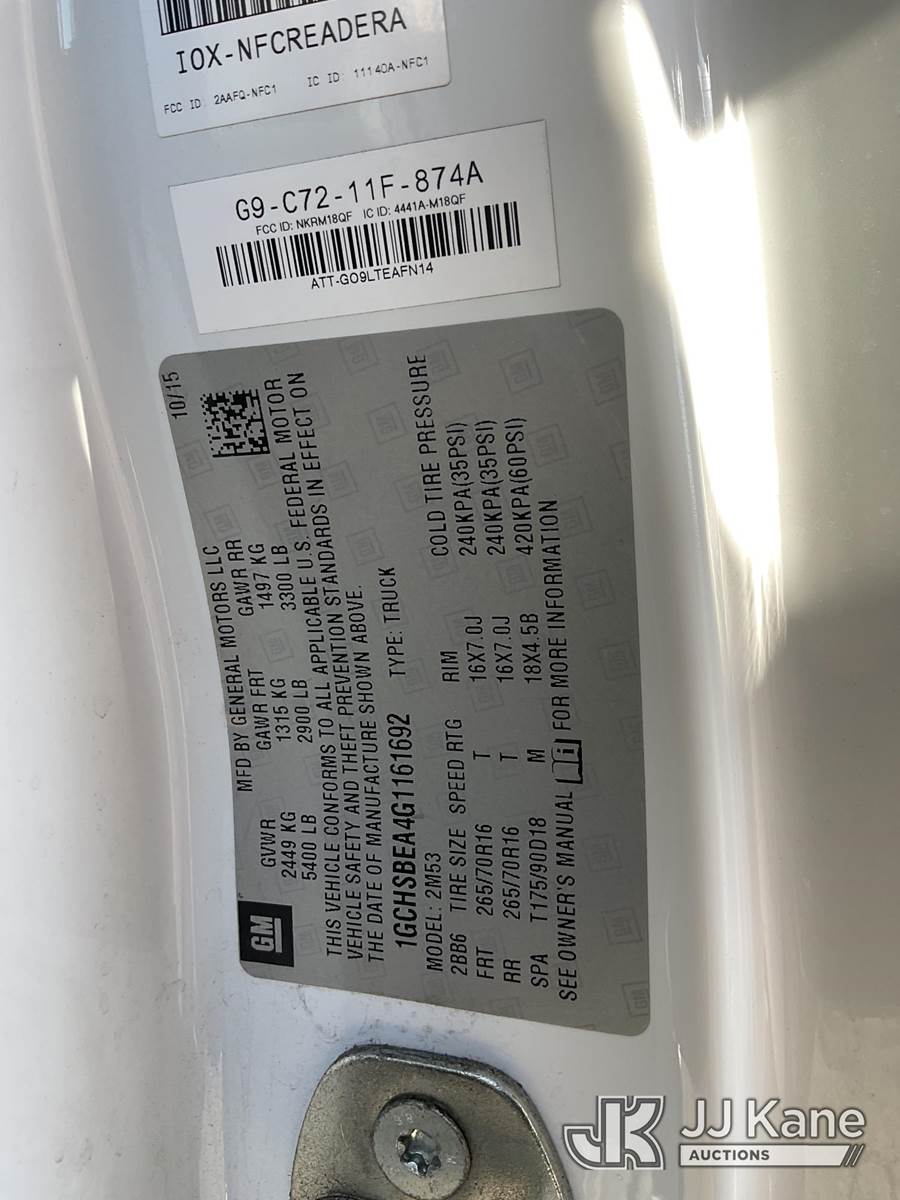 2016 Chevrolet Colorado Extended-Cab Pickup Truck, 2.5L L4 DOHC 16V GAS 6-Speed Automatic, RWD, A/C, with tool box, (83,102 miles) (Runs & Moves) This is a Titled Item NOTE: This unit is being sold AS IS/WHERE IS via Timed Auction and is located in Dixon, CA. Inspection & preview days for this unit are the 2 business days prior to the first day of items closing for this auction, item is located at 8668 Sparling Ln Dixon, CA 95620 and hours of operations are 8a-4p. For pre-sale questions, please contact JJ Kane Staff at (707) 678-8060 (dixon@jjkane.com). Dealer License Number 45696. (Buyer is responsible for removal. Assistance by consignor or JJ Kane Auctioneers is not assured.)