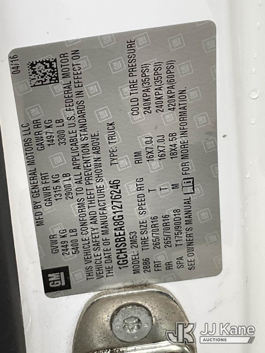 2016 Chevrolet Colorado Extended-Cab Pickup Truck, 4-cyl gas, 6-Speed Automatic, A/C, with Tow package, toolbox, (85,448 miles) (Runs & Moves) This is a Titled Item NOTE: This unit is being sold AS IS/WHERE IS via Timed Auction and is located in Jurupa Valley, CA. Inspection & preview days for this unit are the 2 business days prior to the first day of items closing for this auction, item is located at 4510 Muth Way Jurupa Valley, CA 92509 and hours of operations are 8a-4p. For pre-sale questions, please contact please contact Office Staff @ (310) 353-7140. Dealer License Number 45696. (Buyer is responsible for removal. Assistance by consignor or JJ Kane Auctioneers is not assured.)