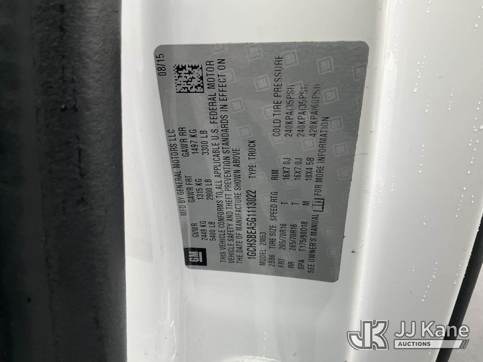 2016 Chevrolet Colorado Extended-Cab Pickup Truck, s/n 1GCHSBEA5G1113022, 4-cyl gas, 6-Speed Automatic, A/C, with Tow Hitch, Front Bumper Push Bar, (42,395 miles) (Runs & Moves) (Minor Dent On Right Side, Right Rear Seat Missing) This is a Titled Item NOTE: This unit is being sold AS IS/WHERE IS via Timed Auction and is located in Jurupa Valley, CA. Inspection & preview days for this unit are the 2 business days prior to the first day of items closing for this auction, item is located at 4510 Muth Way Jurupa Valley, CA 92509 and hours of operations are 8a-4p. For pre-sale questions, please contact please contact Office Staff @ (310) 353-7140. Dealer License Number 45696. (Buyer is responsible for removal. Assistance by consignor or JJ Kane Auctions is not assured.)