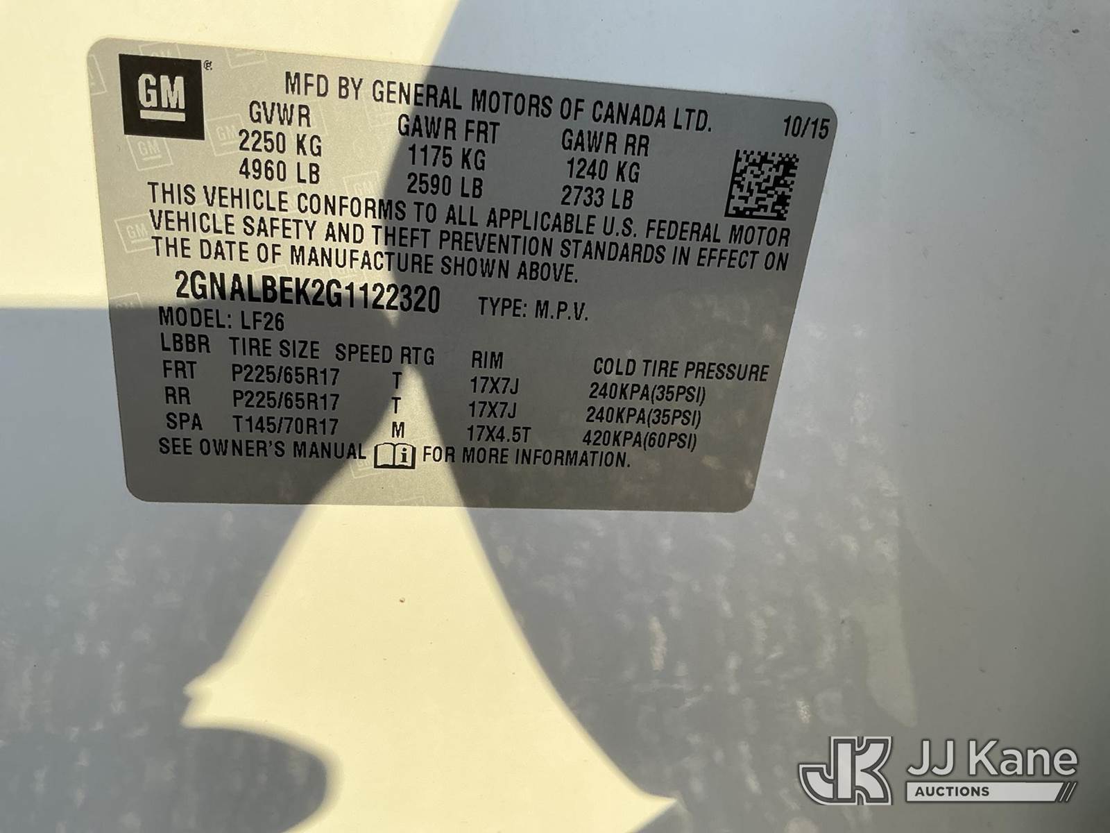 2016 Chevrolet Equinox 4-Door Sport Utility Vehicle, 2.4L L4 DOHC 16V FFV gas, FWD, 6-Speed Automatic, A/C, (76,722 miles) (Runs & Moves) This is a Titled Item NOTE: This unit is being sold AS IS/WHERE IS via Timed Auction and is located in Las Vegas, NV. Inspection & preview days for this unit are the 2 business days prior to the first day of items closing for this auction, item is located at 14655 Grand Valley Pkwy Las Vegas, NV 89165 and hours of operations are 8a-4p. Titles executed exactly as bidder registered. Ensure your name and/or business name and address in JJ Kane and/or ProxiBid is correct before bidding. For pre-sale questions, please contact Office Staff @ (801) 519-0123 and provide sale date and lot number. Las Vegas Dealer License Number DLR000053086 / OHV000053094. (Buyer is responsible for removal. Assistance by consignor or JJ Kane Auctions is not assured.)