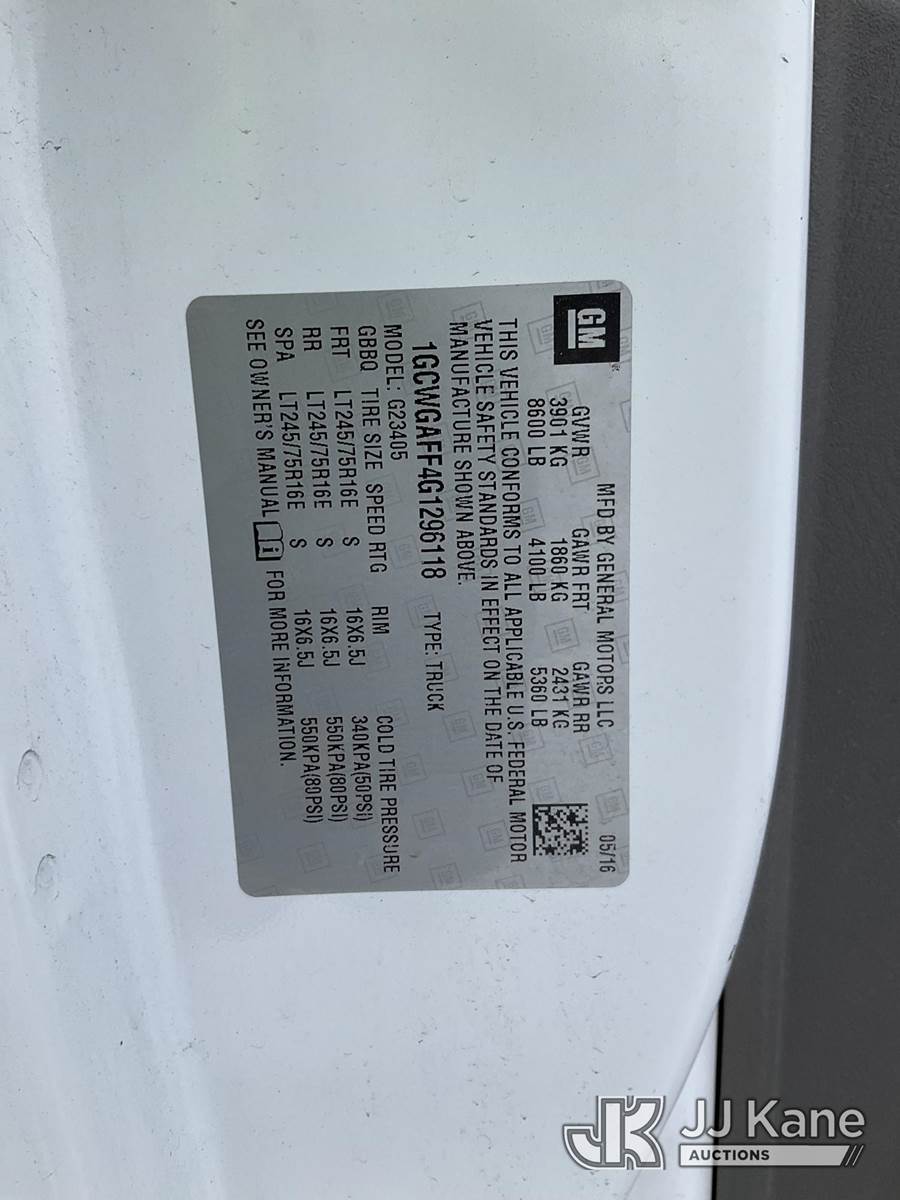 2016 Chevrolet Express G2500 Cargo Van, 4.8L V8 FFV gas, 6-Speed Automatic, RWD, A/C, (122,587 miles) (Runs & Moves) (Reads 4,379 hours) This is a Titled Item NOTE: This unit is being sold AS IS/WHERE IS via Timed Auction and is located in South Beloit, IL. Inspection & preview days for this unit are the 2 business days prior to the first day of items closing for this auction, item is located at 14354 Dearborn Ave South Beloit, IL and hours of operations are 8a-4p. For pre-sale questions, please contact Derek Eklund at (608) 904-0618 or (derek.eklund@jjkane.com). (Buyer is responsible for removal. Assistance by consignor or JJ Kane Auctions is not assured.)