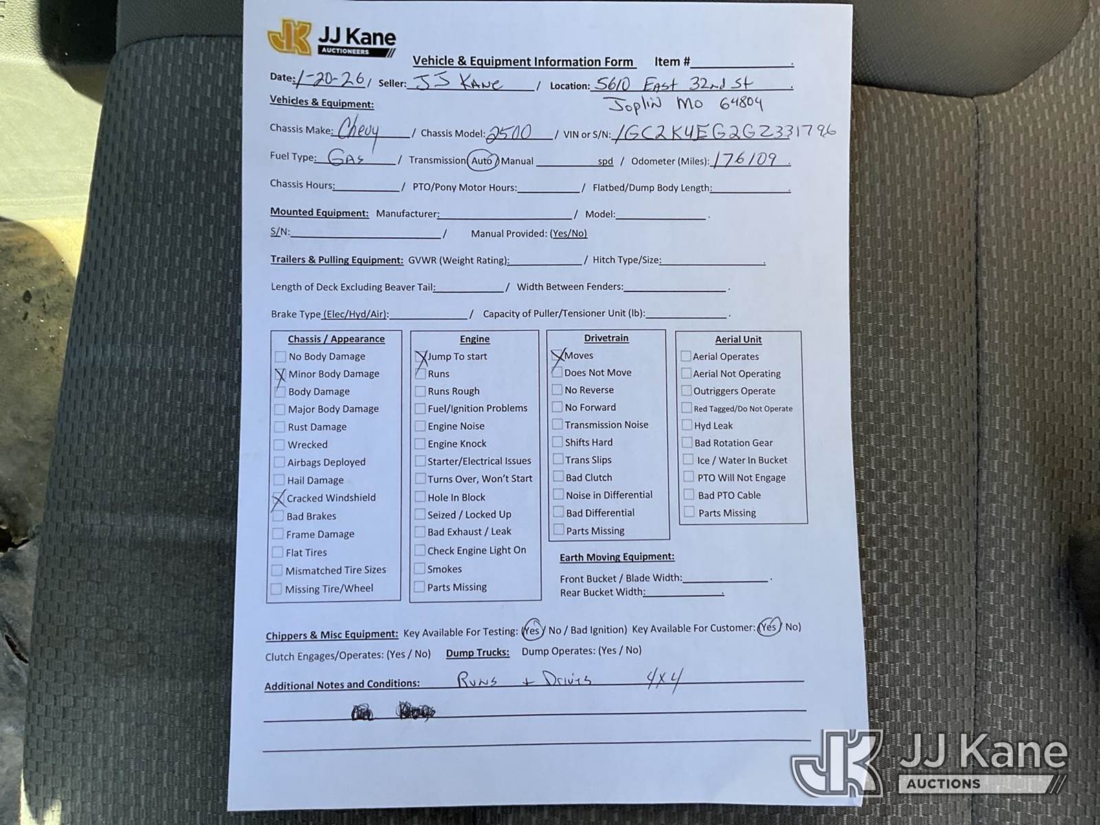 2016 Chevrolet Silverado 2500HD 4x4 Extended Cab Pickup Truck, 6.0L V8 OHV 16V FFV gas, 6-Speed Automatic, A/C, with bed cap & bed slide, (176,109 miles) (Runs & Moves) (Jump To Start, Cracked Windshield, Body Damage) This is a Titled Item NOTE: This unit is being sold AS IS/WHERE IS via Timed Auction and is located in Joplin, MO. Inspection & preview days for this unit are by appointment only; please contact us at contact@jjkane.com or 84-Go-JJKane for more details. (Buyer is responsible for removal. Assistance by consignor or JJ Kane Auctions is not assured.)