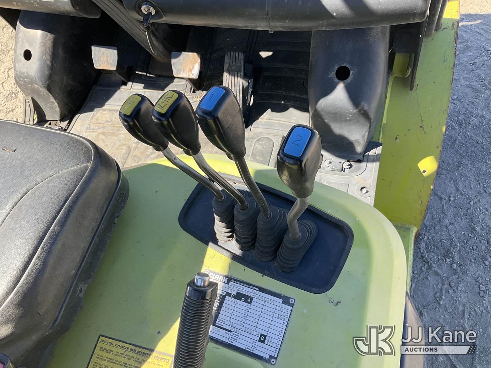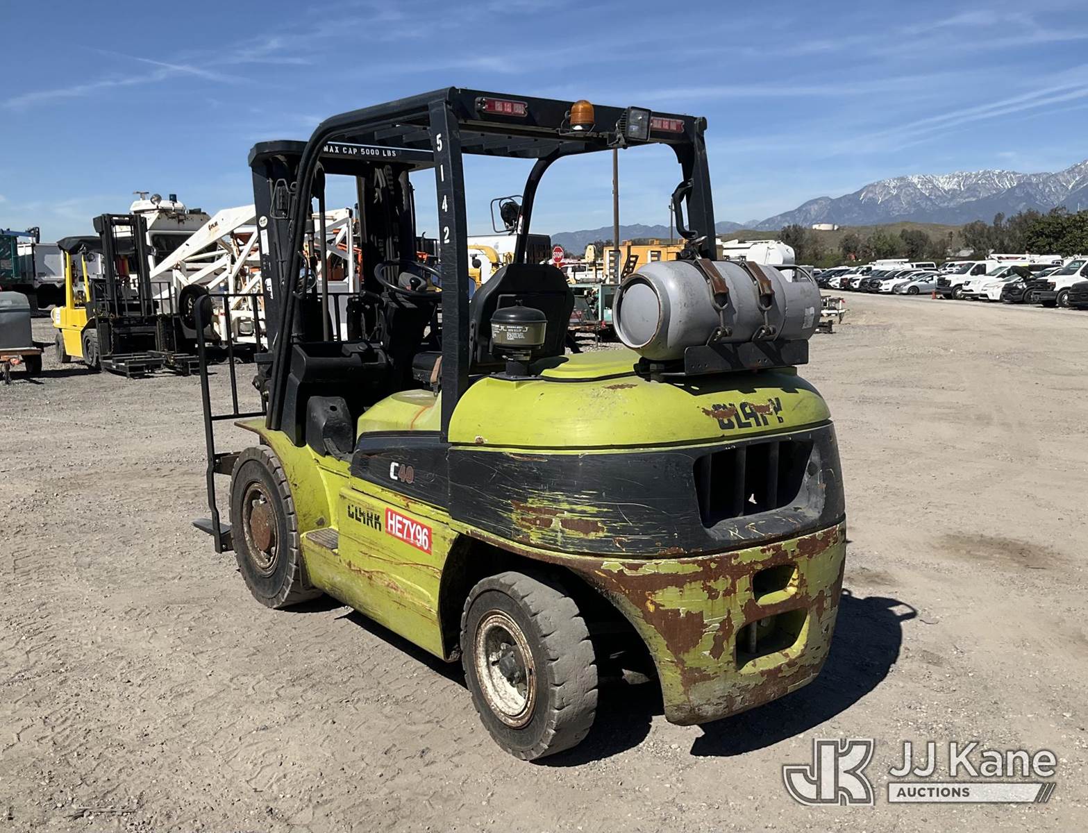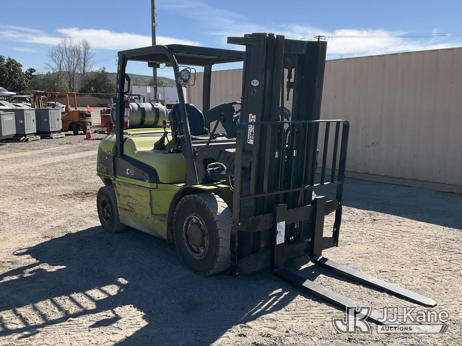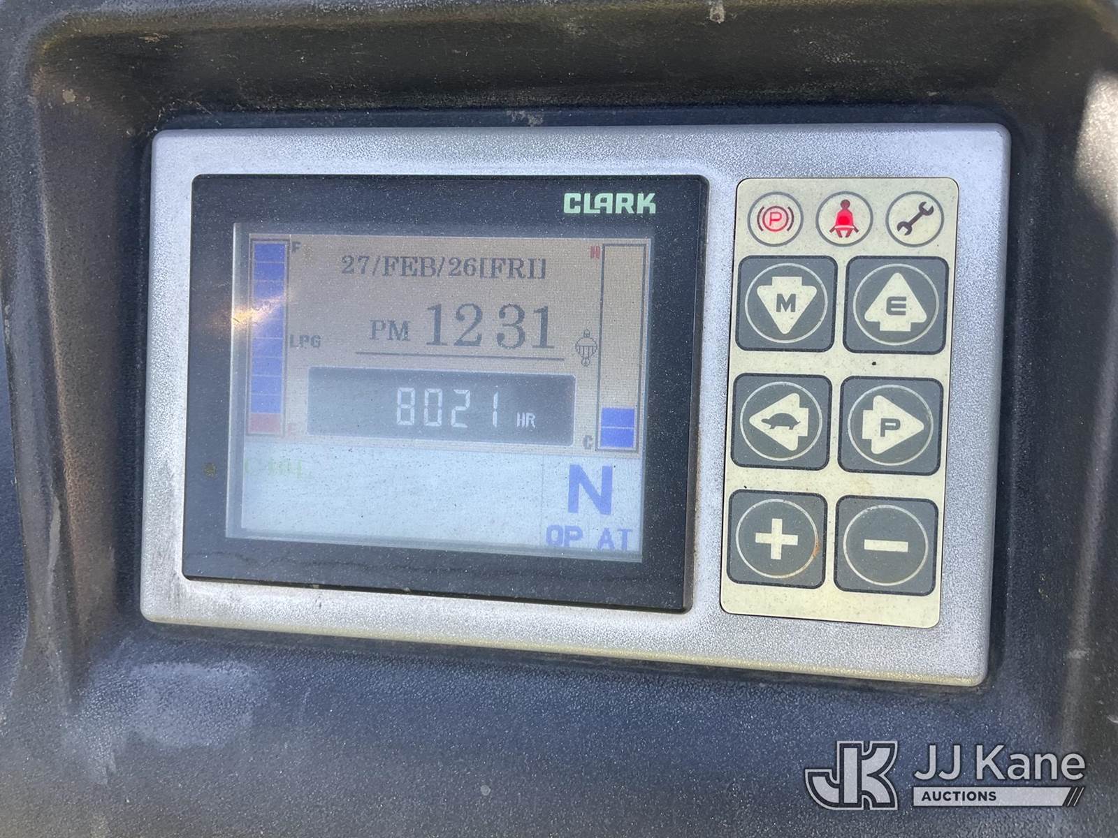 2016 Clark C40L Rubber Tired Forklift, s/n P455L-0568-9887KF, 6-cyl, LPG, (Runs & Operates) (Reads 8,021 hours) NOTE: This unit is being sold AS IS/WHERE IS via Timed Auction and is located in Jurupa Valley, CA. Inspection & preview days for this unit are the 2 business days prior to the first day of items closing for this auction, item is located at 4510 Muth Way Jurupa Valley, CA 92509 and hours of operations are 8a-4p. For pre-sale questions, please contact please contact Office Staff @ (310) 353-7140. Dealer License Number 45696. (Buyer is responsible for removal. Assistance by consignor or JJ Kane Auctions is not assured.)