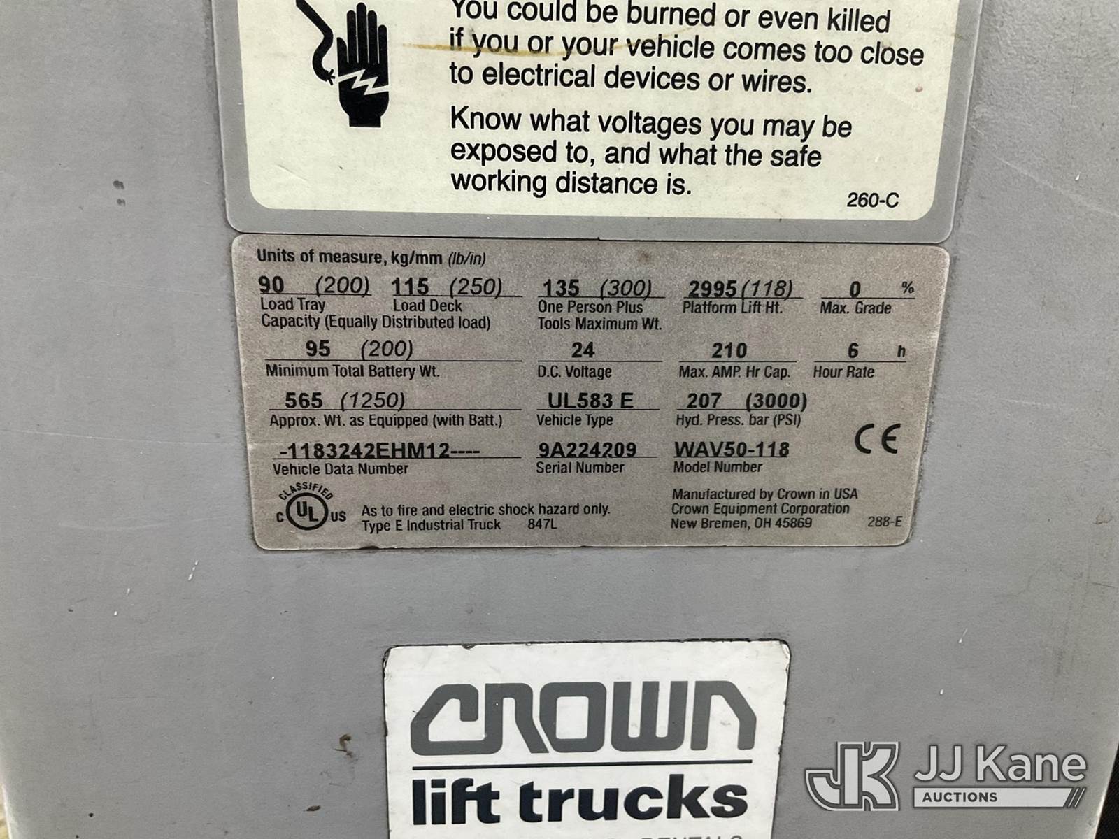 2016 Crown WAV50-118 Electric Work Assist Vehicle, s/n 9A224209, Battery electric, with 17 ft. working height, (Not Operating, Bad Battery, Condition Unknown) NOTE: This unit is being sold AS IS/WHERE IS via Timed Auction and is located in Shrewsbury, MA. Inspection & preview days for this unit are the 2 business days prior to the first day of items closing for this auction, item is located at 11 Fortune Blvd Shrewsbury, MA 01545 and hours of operations are 8a-4p. For pre-sale questions, please contact Rob Gifford @ (508) 864-4126. (Buyer is responsible for removal. Assistance by consignor or JJ Kane Auctioneers is not assured.)